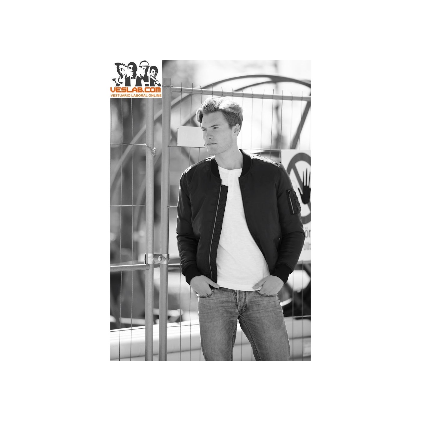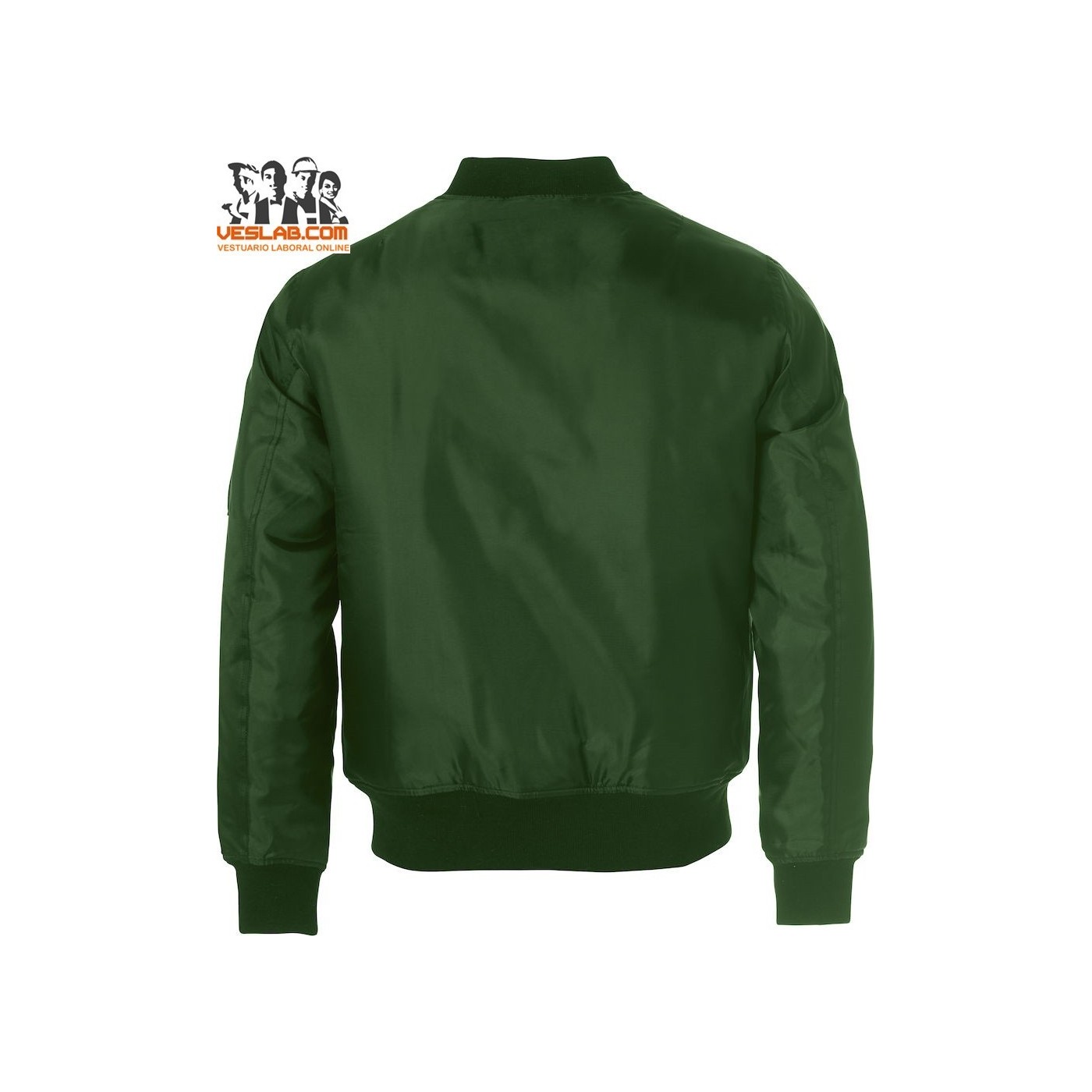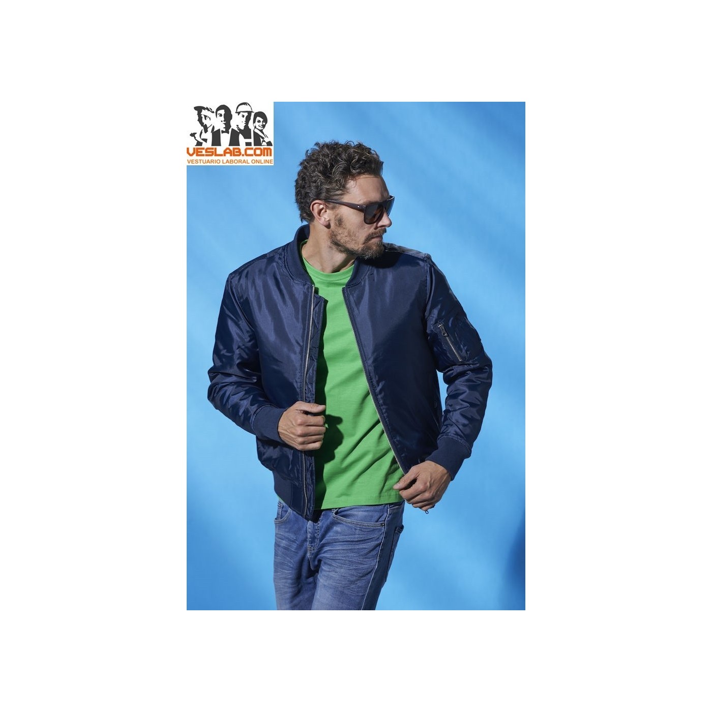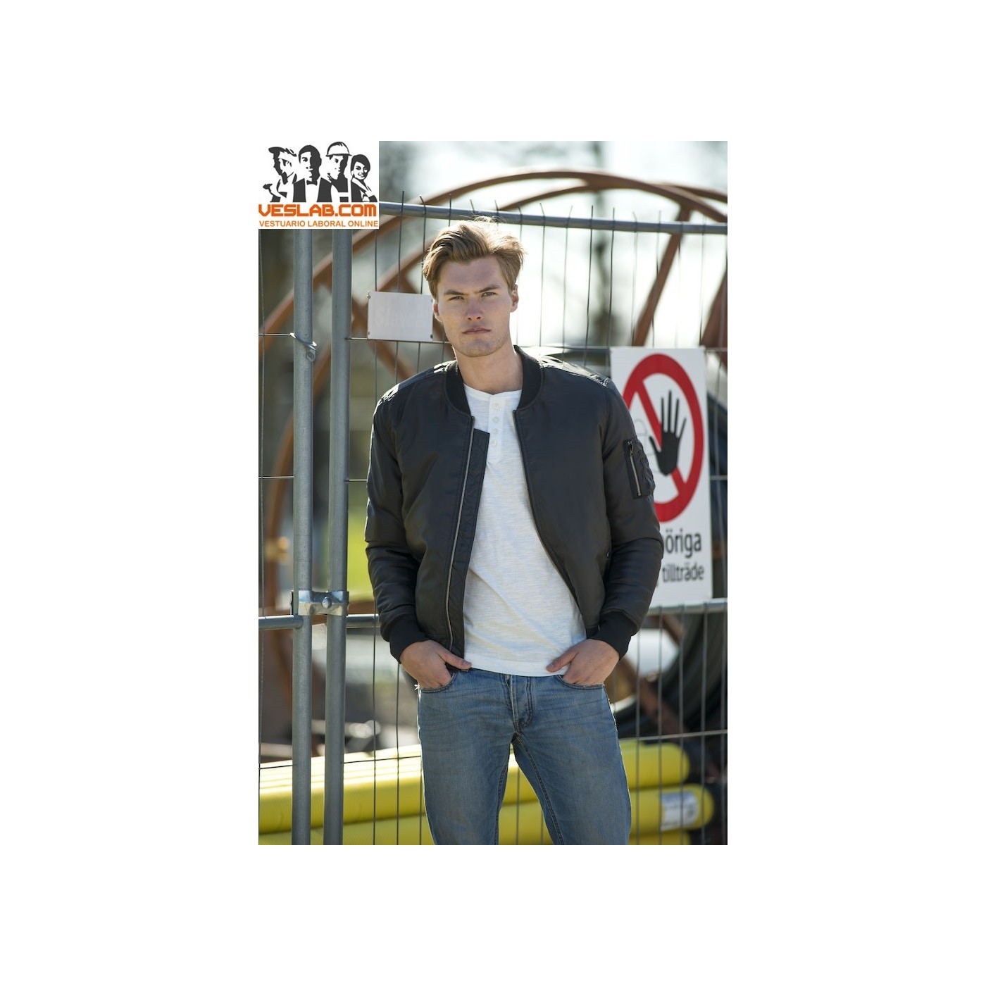Chaqueta bomber unisex. Bolsillos laterales con botón y bolsillo en manga con cremallera. Bolsillo interior con cremallera. Cremallera SBS.