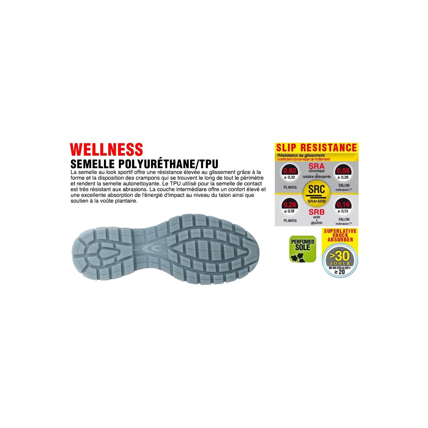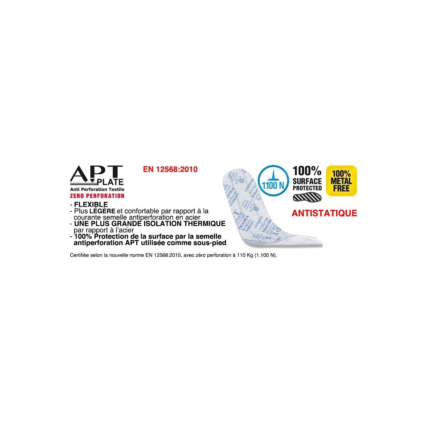 PLANTILLA: EVANIT con especial mezcla de EVA y nitrilo, de gran confort y espesor variable (12mm - 8mm - 3,8mm). Termoformada, perforada y forrada con tejido muy transpirable. Antiestática gracias a un tratamiento especial de la superficie y a costuras realizadas con hilos conductores