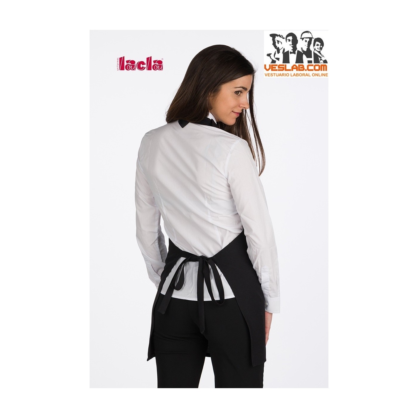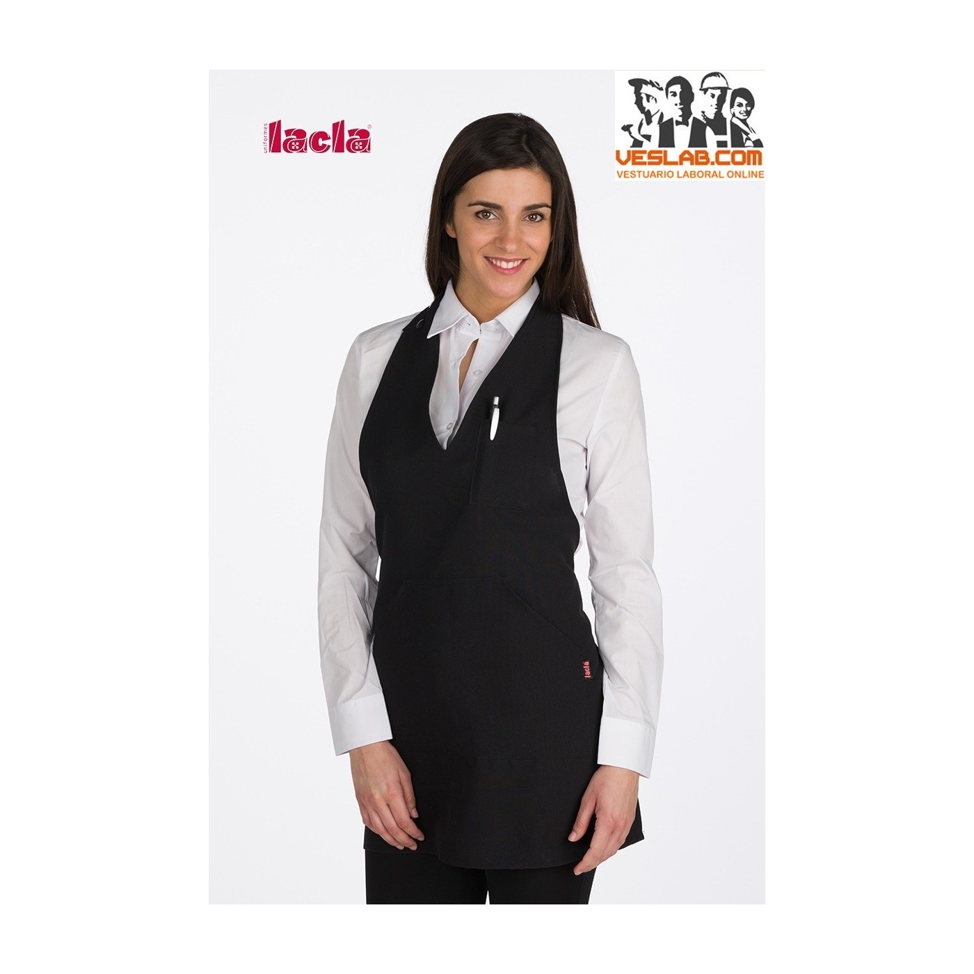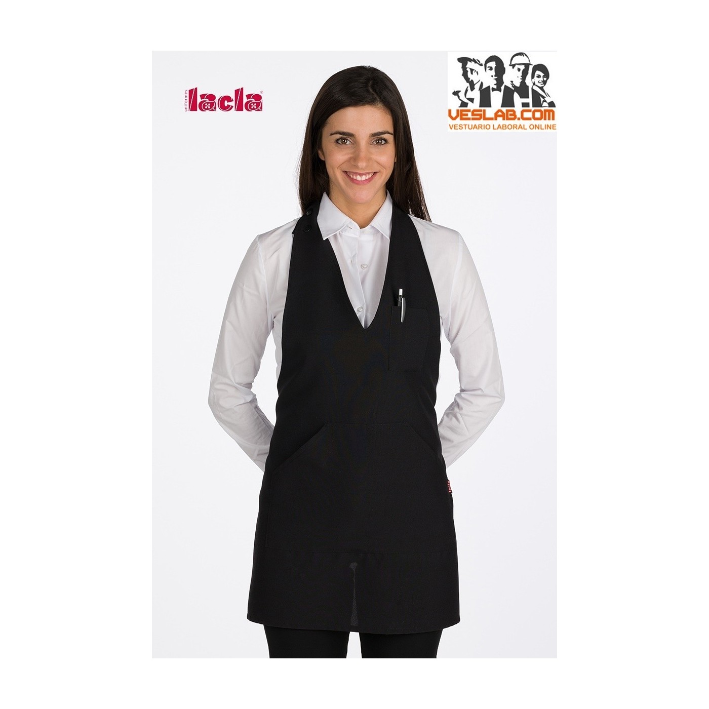 Delantal corto con cuello pico ajustable con botones . bolsillo central y de pecho divisorios. Se ajusta con cintas que se anudan por la espalda.