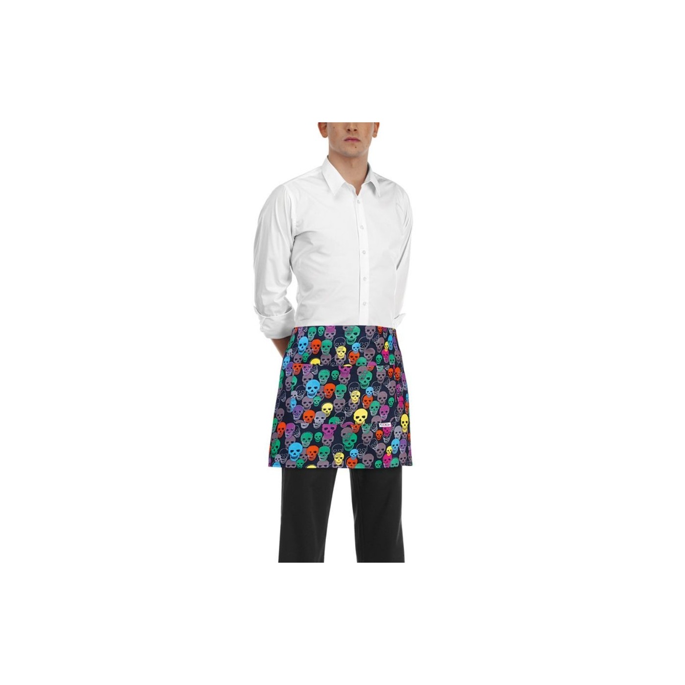Delantal de camarero corto estampado CALAVERAS DE COLORES Egochef, unisex, con 2 bolsillos prácticos, medidas 40x70 cm, y tejido resistente 65% poliéster/35% algodón. Ideal para hostelería.