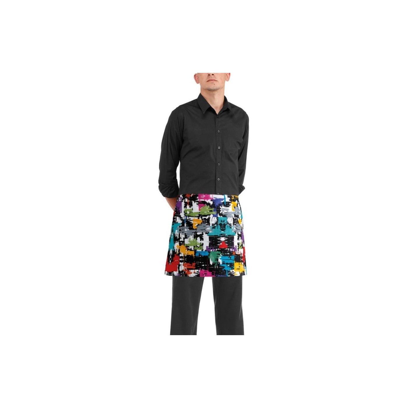 Delantal de camarero corto estampado GRAPHIC Egochef, unisex, con 2 bolsillos prácticos, medidas 40x70 cm, y tejido resistente 65% poliéster/35% algodón. Ideal para hostelería.