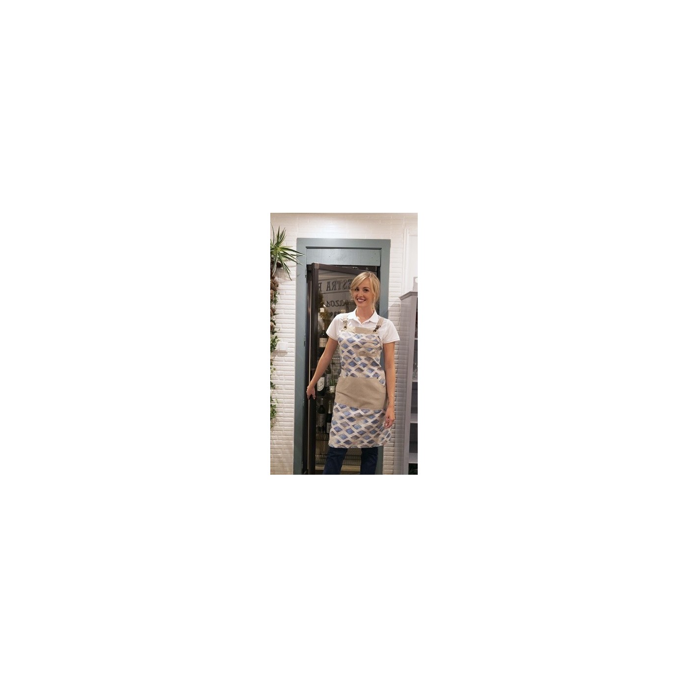 Elegante delantal de peto con un original estampado. Elaborado con un alto porcentaje de algodón lo que asegura la frescura en todo momento. Tirantes cruzados y gran bolsillo central.