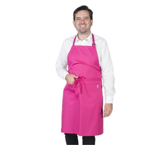 Delantal de peto con un bolsillo delantero y hebilla reguladora en el cuello para ajustar. Cintas para anudar del mismo tejido. Modelo ideal para uniformes de cocina y restauración, camarero, catering y comercio en general.