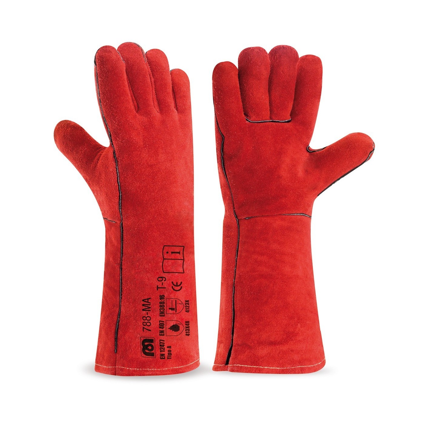 Piel serraje vacuno 1ª con costuras de Kevlar y forrado especial interior. 40cm. Aplicaciones: Riesgo por soldadura, Riesgos mecánicos y Riesgo Térmico. Actividades de soldadura y manipulación pesada y procesos relacionados Tipo A. También ofrecen protección contra agresiones mecánicas y calor (hasta 100ºC).