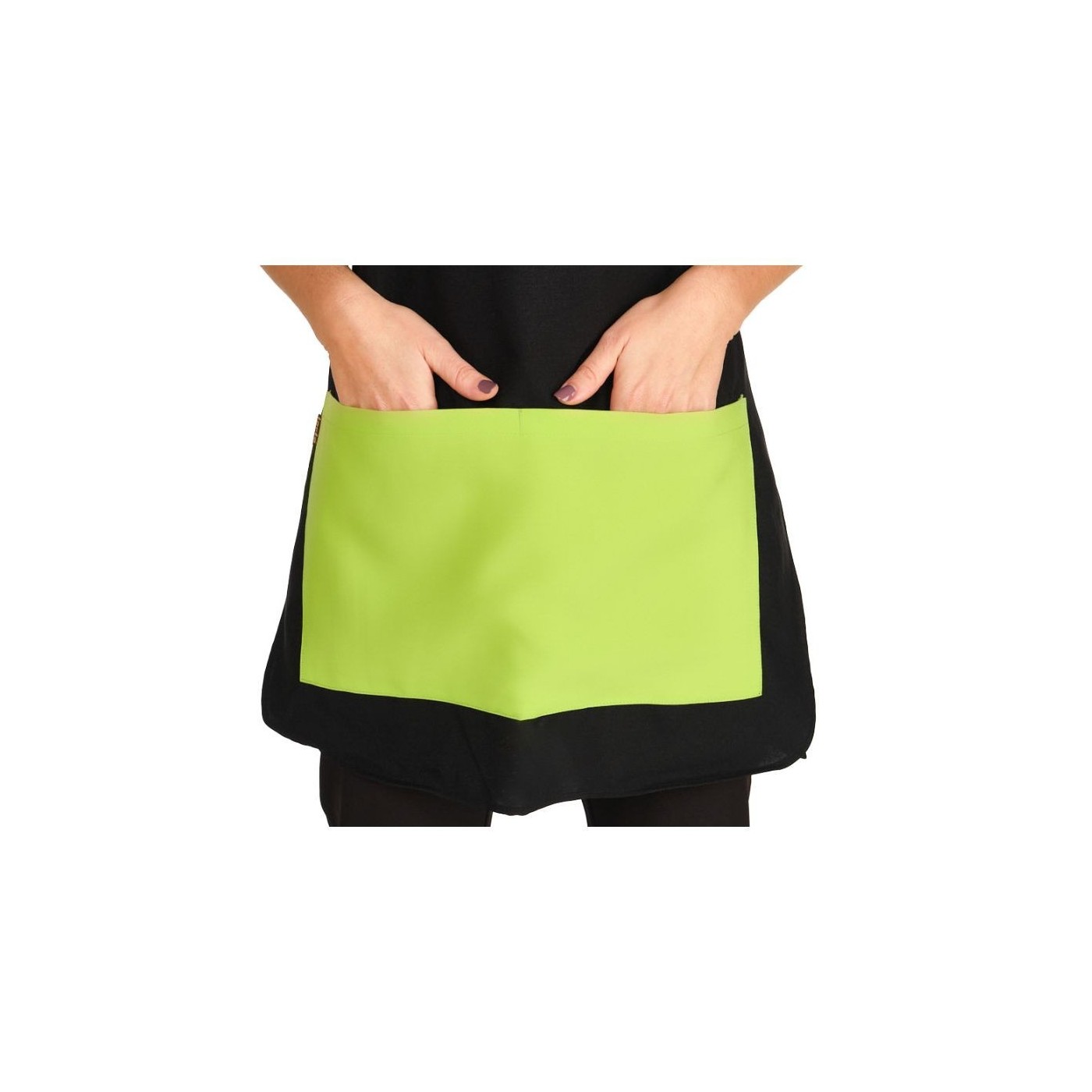 Estola ajustada , con escote redondo y sisas pulidas con vivo de color , delante liso con bolsillo central divisorio de color , bajos redondos , ajuste cintura con cintas que se cruzan por la espalda y se anudan en la cintura.