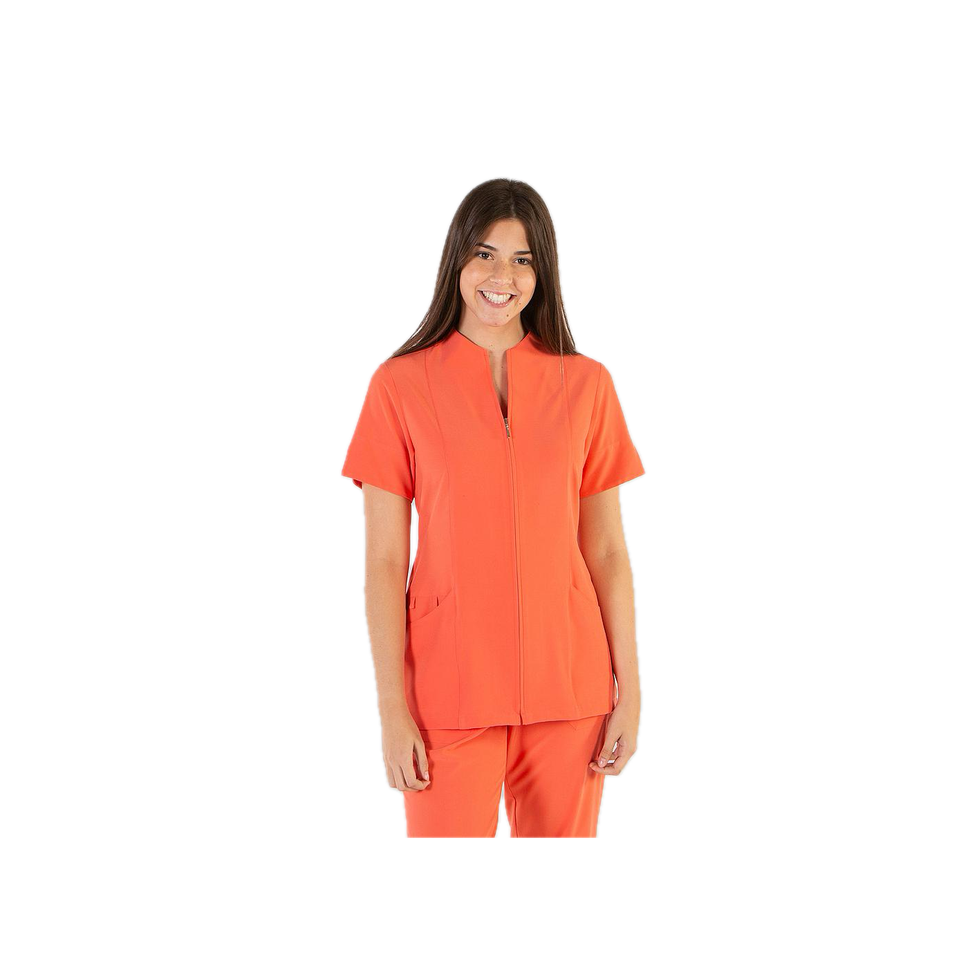Disponible en colores modernos como coral o albero, esta blusa es ideal para profesionales de la salud en hospitales, clínicas, centros médicos, farmacias, veterinarias, estética, spa, limpieza y comercios.