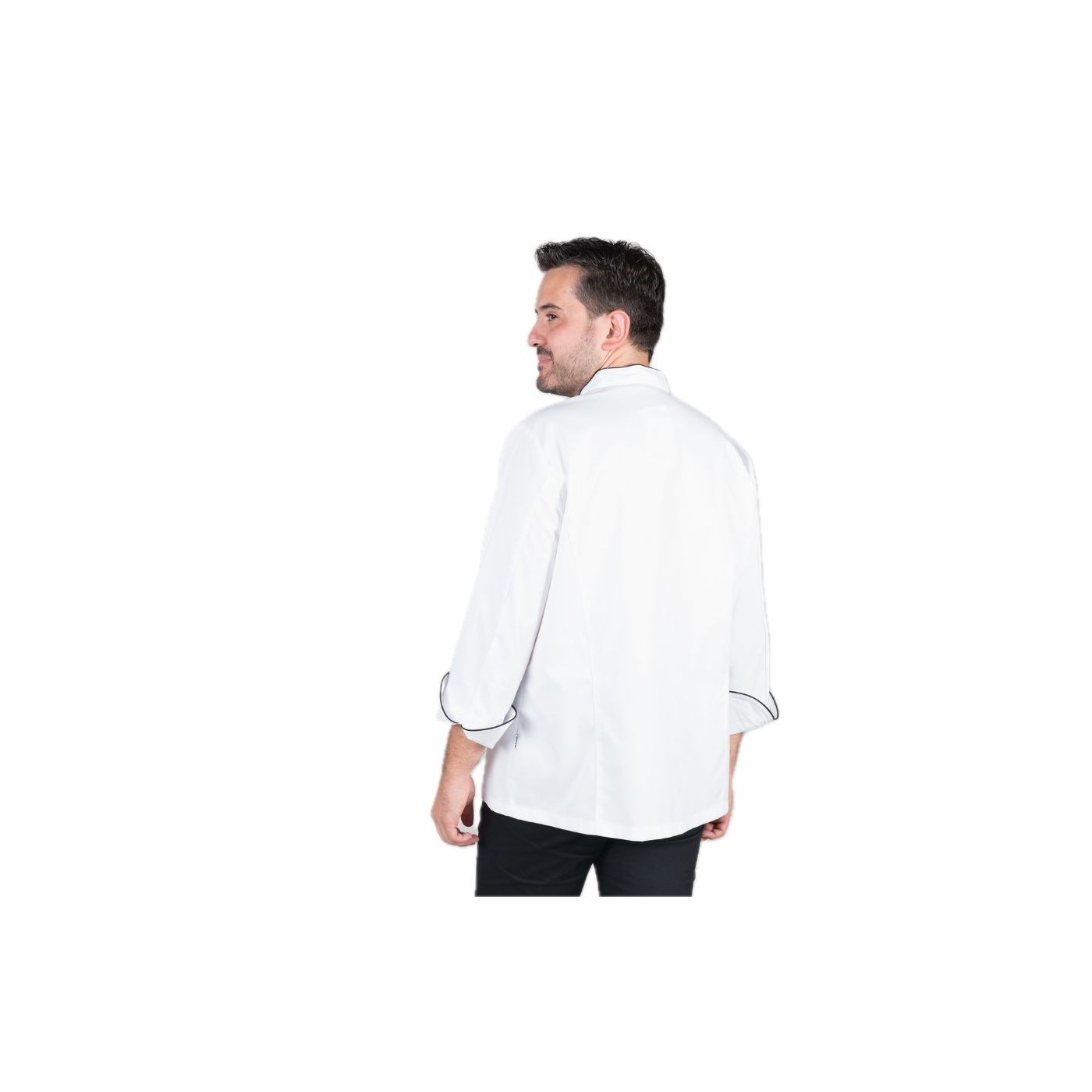 Confeccionada en Resistente Sarga Blanca: La durabilidad y facilidad de cuidado de la sarga blanca hacen que esta chaqueta sea una compañera confiable en tu día a día en la cocina.