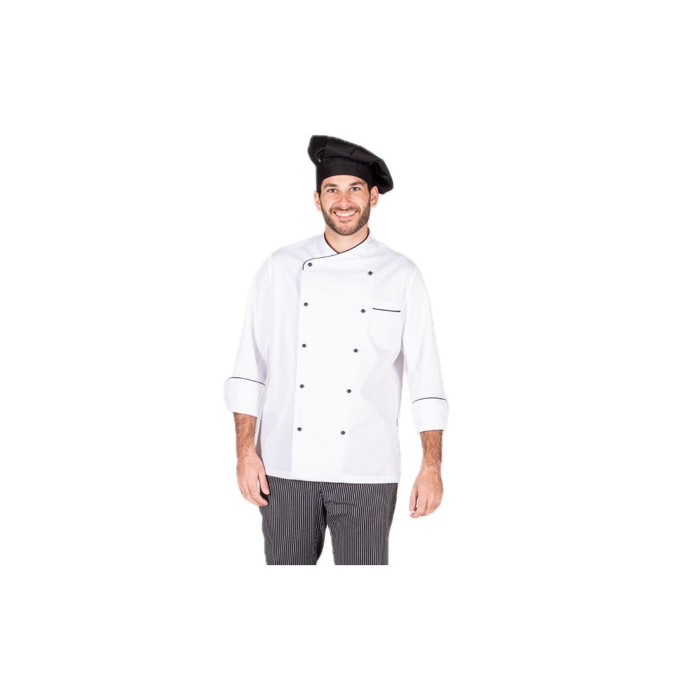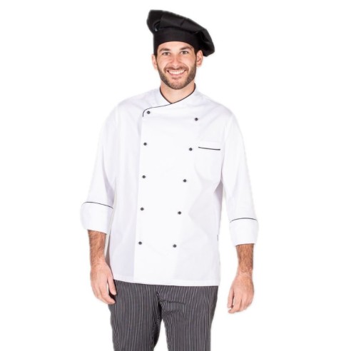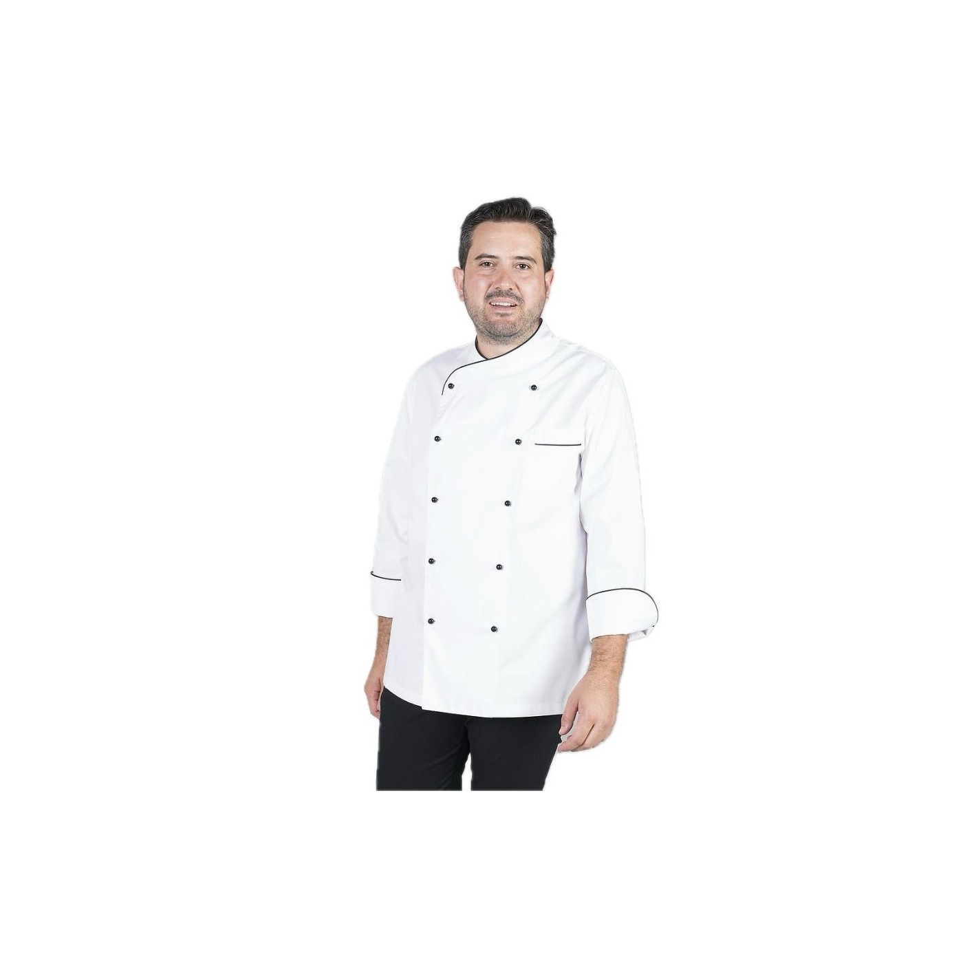 La chaqueta de cocina unisex NÁPOLES combina estilo y funcionalidad para profesionales de la hostelería. Su diseño holgado y detalles en negro ofrecen comodidad y elegancia. Fabricada en resistente sarga blanca con AEROSILVER en las sisas para frescura. Incluye botones de chupete y bolsillo en el pecho para mayor practicidad.