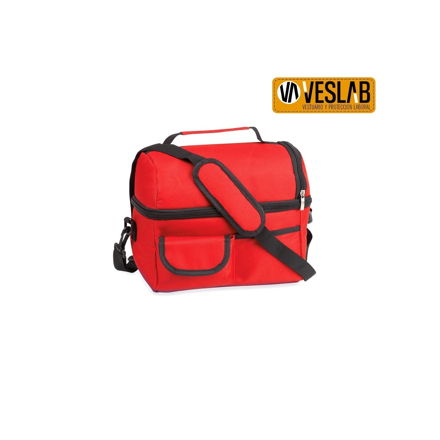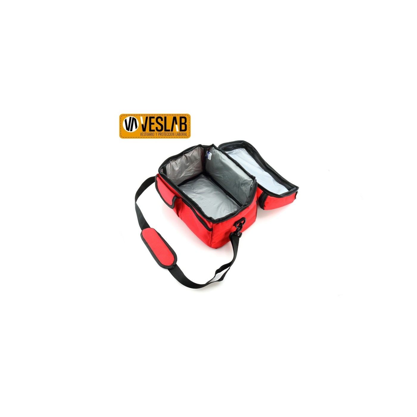 Interior isotermo en acabado de aluminio. Con cinta para hombro extensible con cierre de mosquetón y refuerzo acolchado para hombro a juego.