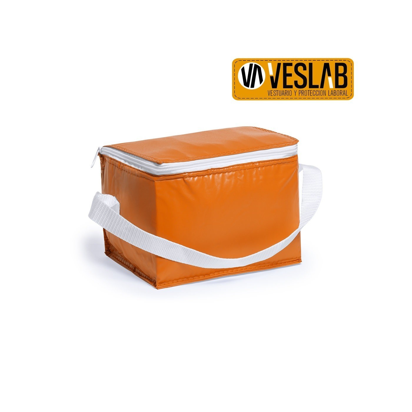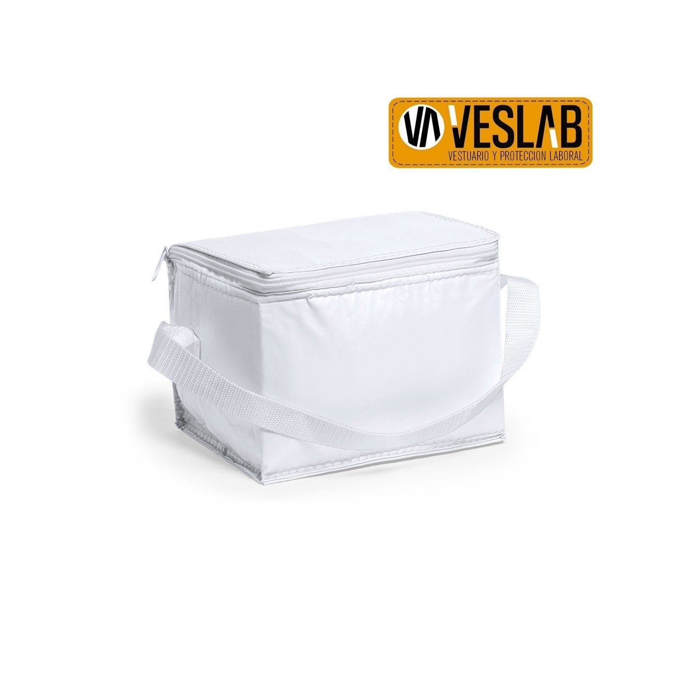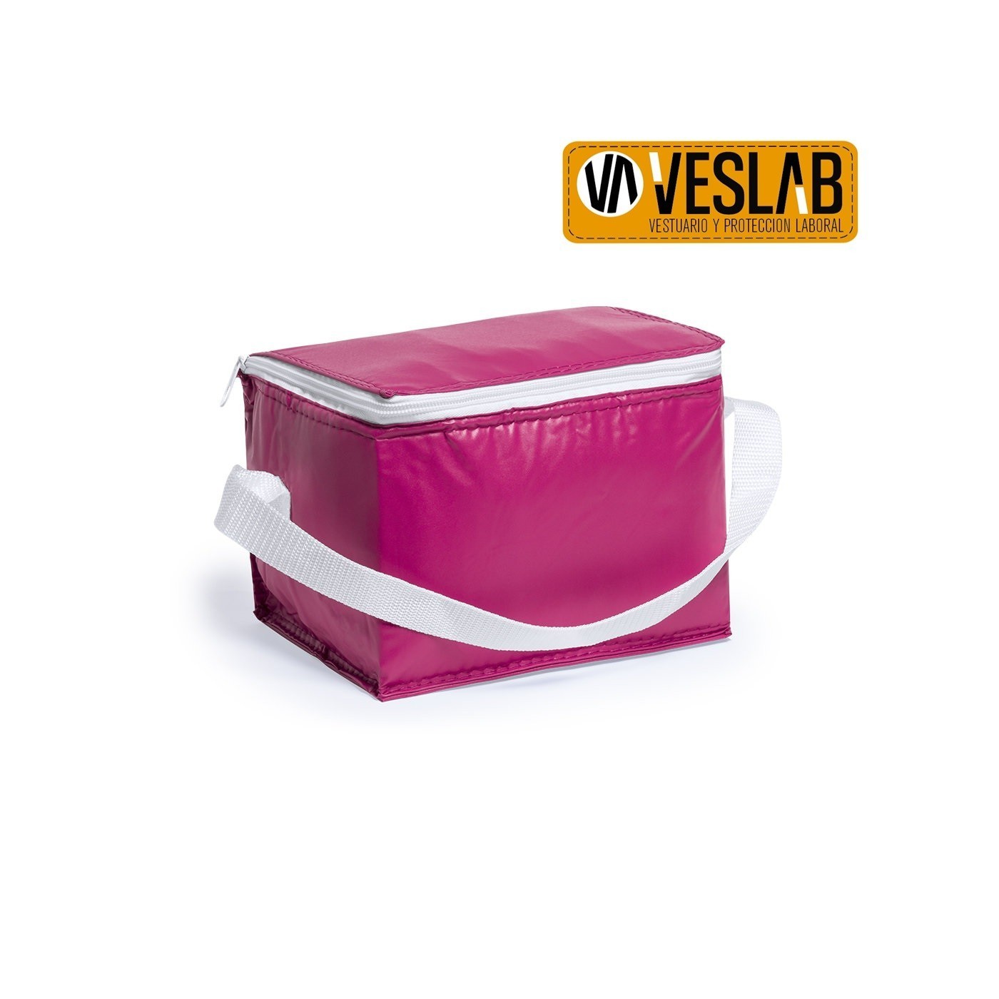 Nevera de 6 latas en resistente PVC de vivos colores. Interior isotermo en acabado de aluminio. Con cremallera y asa de transporte en color blanco a juego.