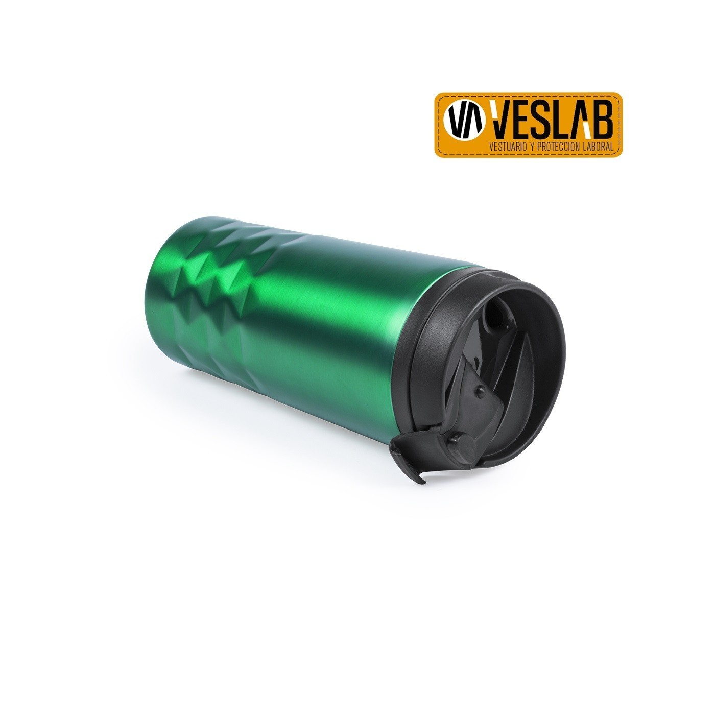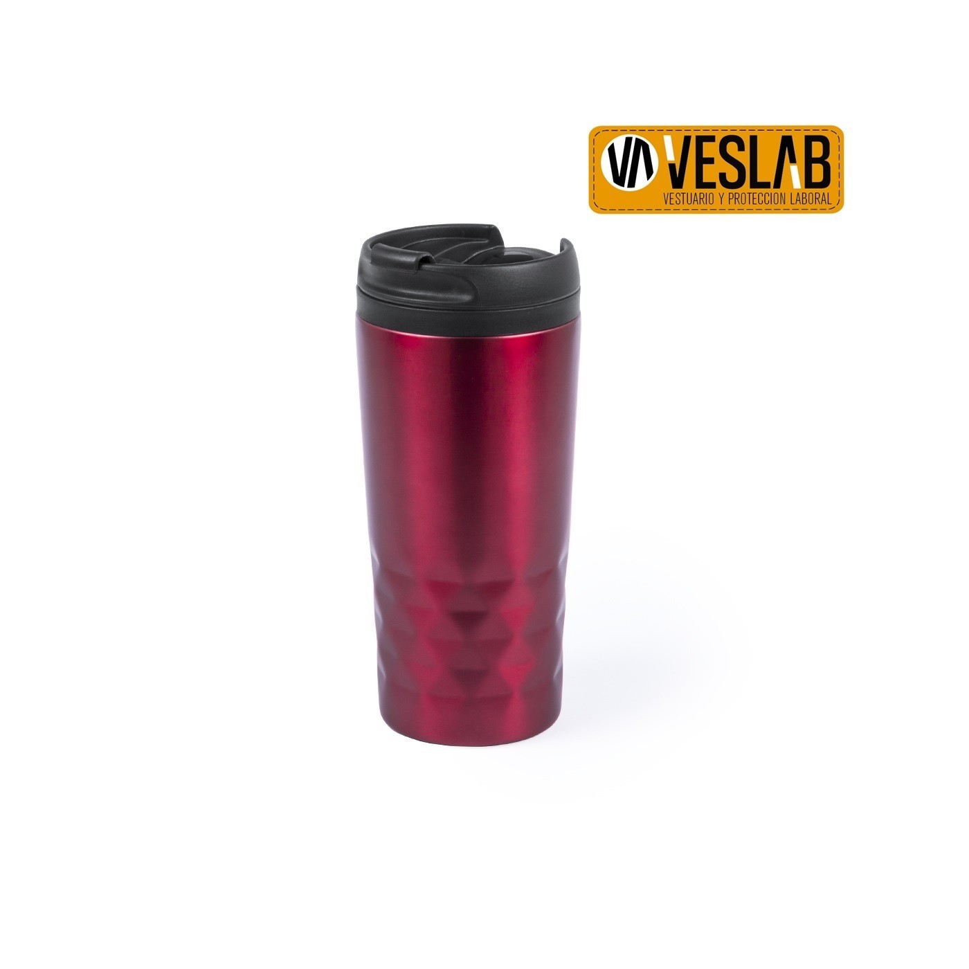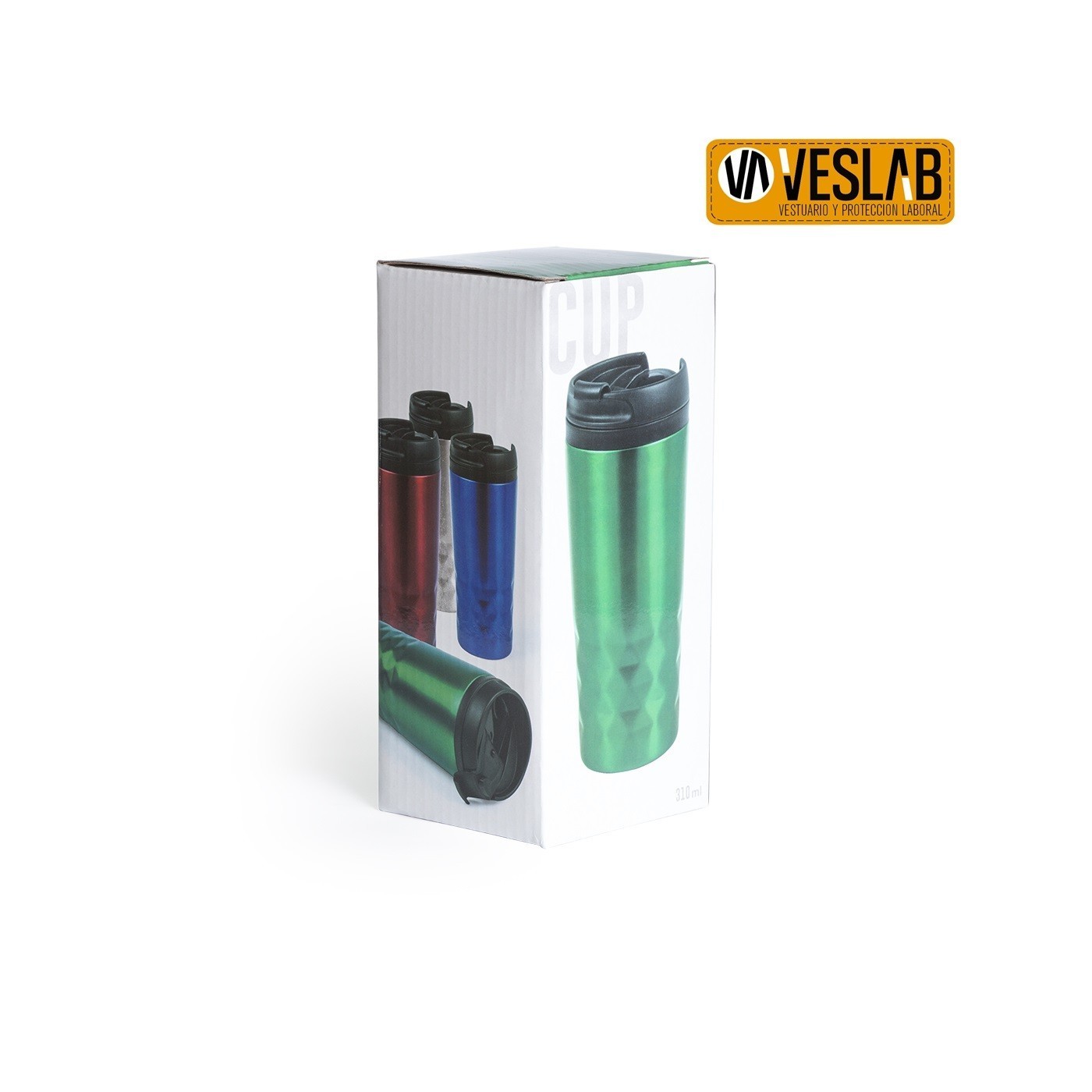 Vaso de acero inox de 310ml de capacidad con cuerpo en vivos colores de acabado brillante y diseño en rombos. Con tapa dosificador de seguridad y base acolchada de suave espuma. Presentado en caja individual.