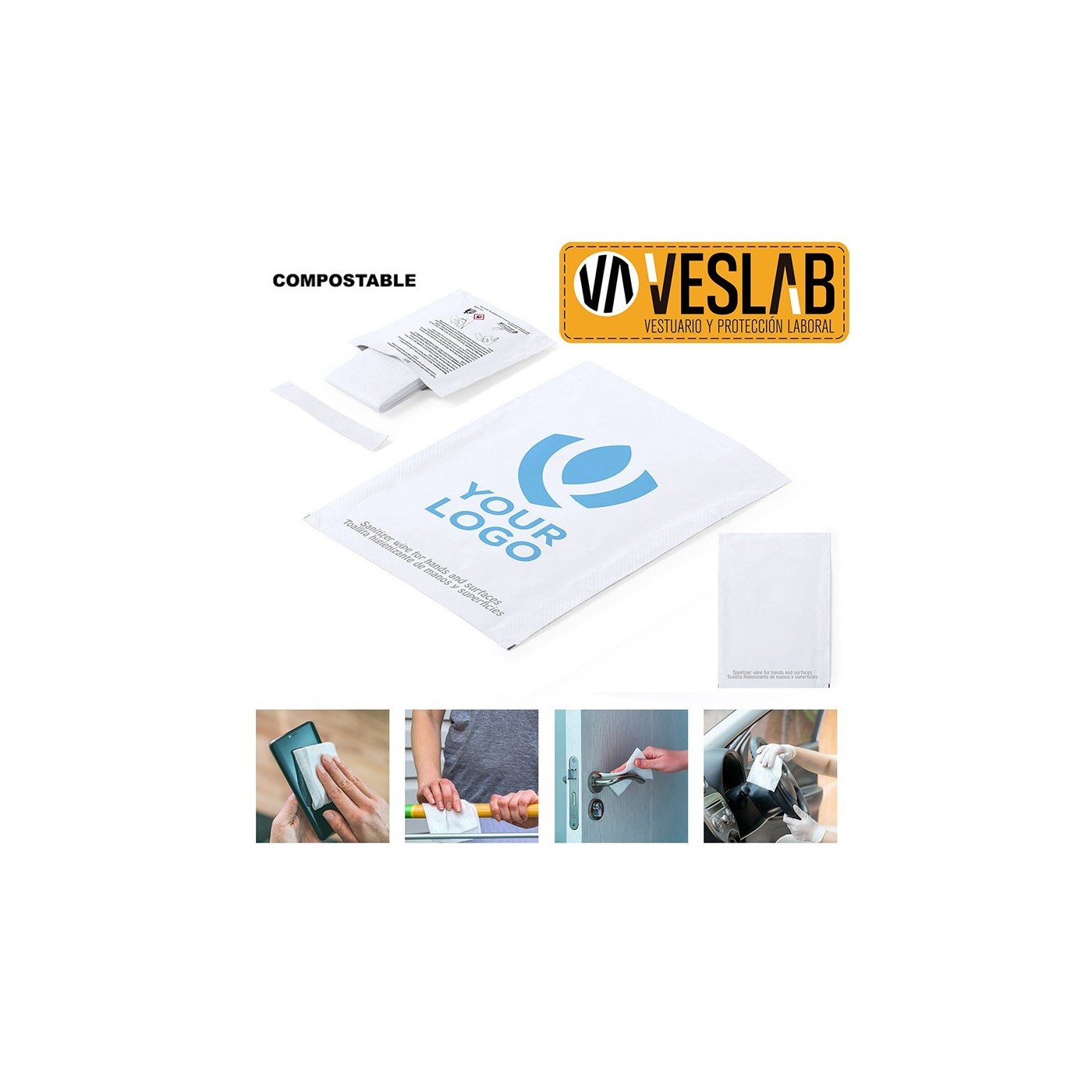 Toallita húmeda higienizante hidroalcohólica para limpieza y desinfección de manos y superficies de uso frecuente (smartphones, barras del carrito de la compra, teclados…). Fabricada en material compostable y presentada en sobre monodosis de 2 ml, con amplia superficie de marcaje.