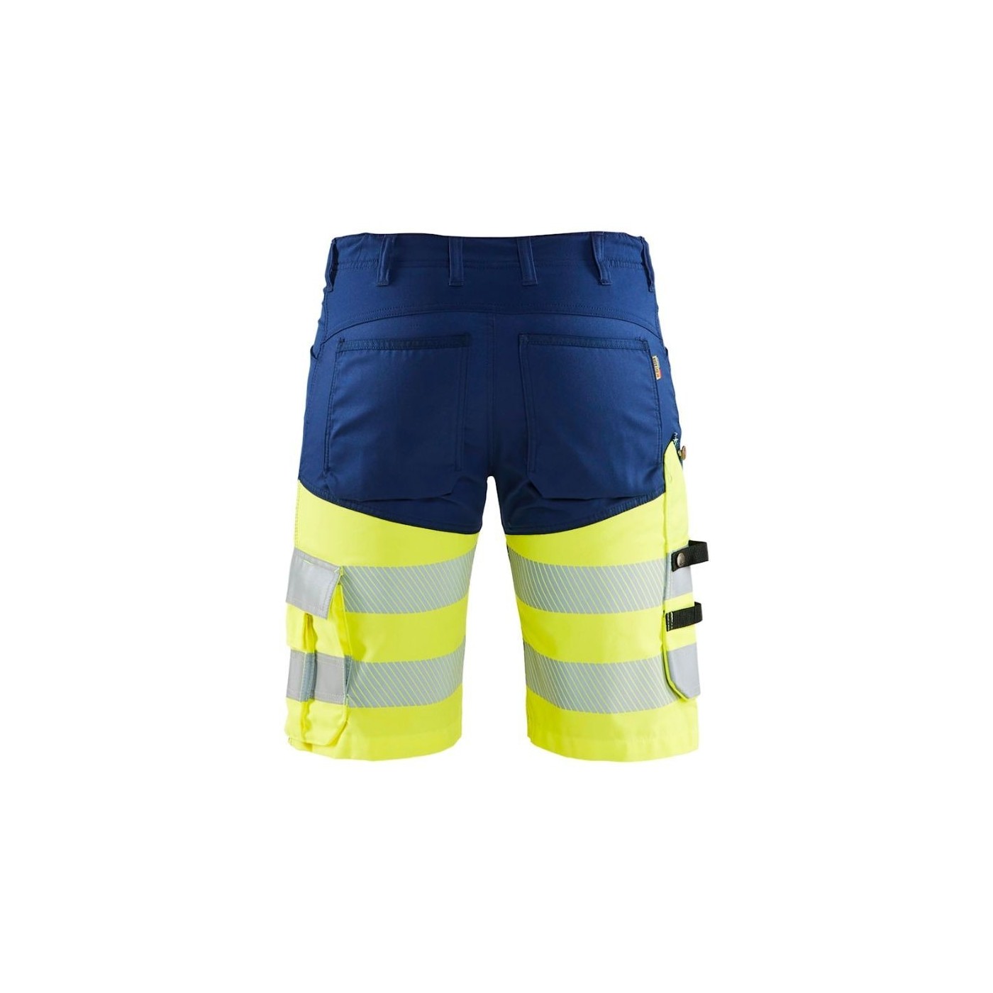Pantalón Corto de Alta Visibilidad Elásticos Blakläder certificado Clase 1, con paneles elásticos para libertad de movimiento. Bolsillos prácticos y tejido resistente al agua. Ideal para trabajadores que buscan seguridad y comodidad.