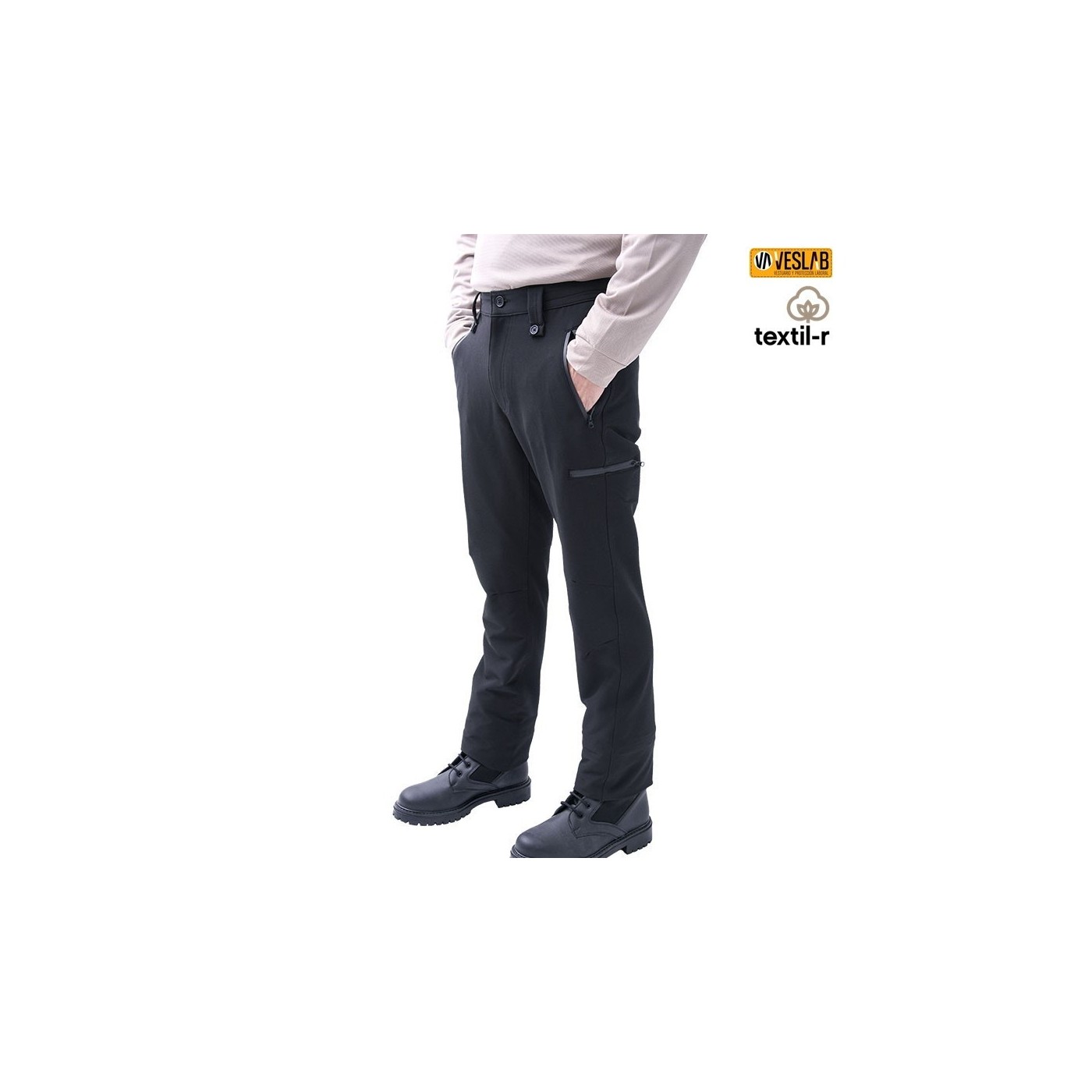 Pantalón bistretch unisex tejido softhell. 5 bolsillos con cremalleras resistentes al agua. Tejido extensible y cintura elástica. Bajos con cordón elástico y pieza ajustable. Ideal para vigilantes de seguridad, personal de servicios o para uso individual. Composicion: 90%poliester 10%spandex.