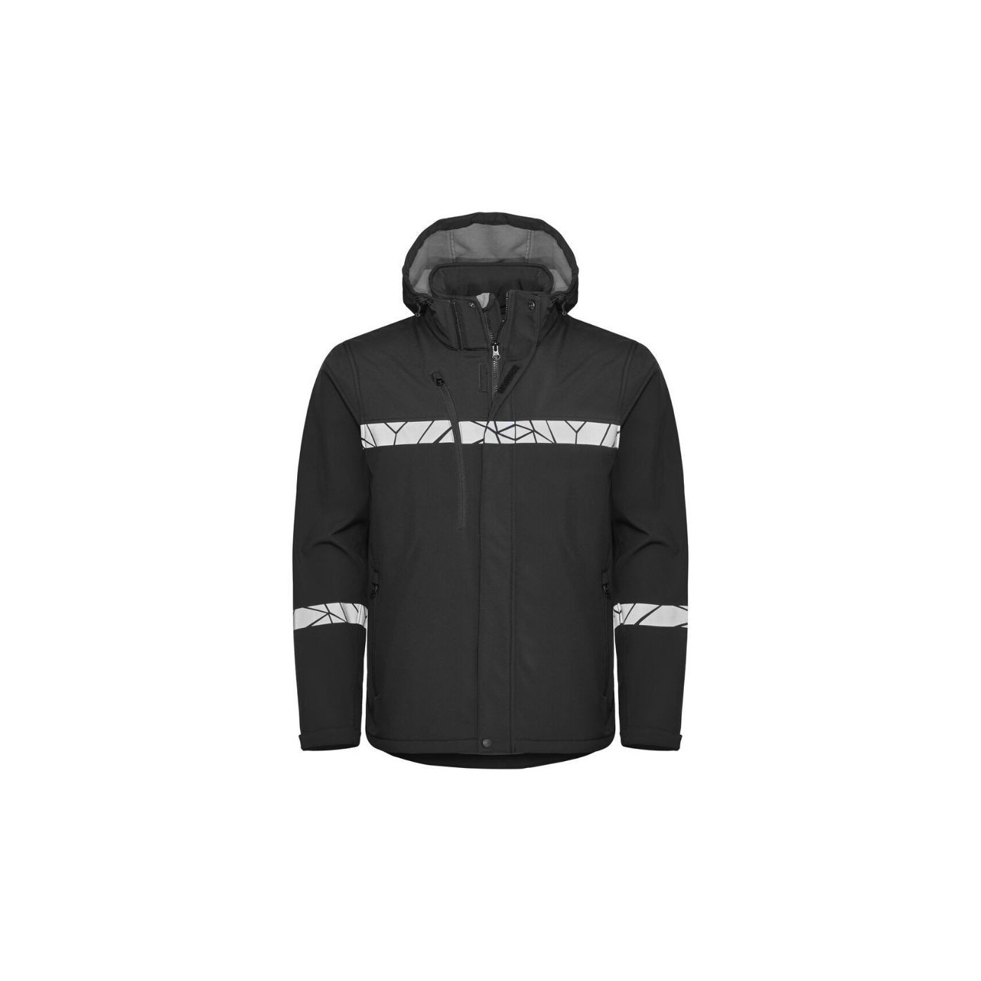 Chaqueta Softshell 9910-VIS resistente al viento y al agua, con alta visibilidad EN 17353, capucha desmontable y múltiples bolsillos funcionales.