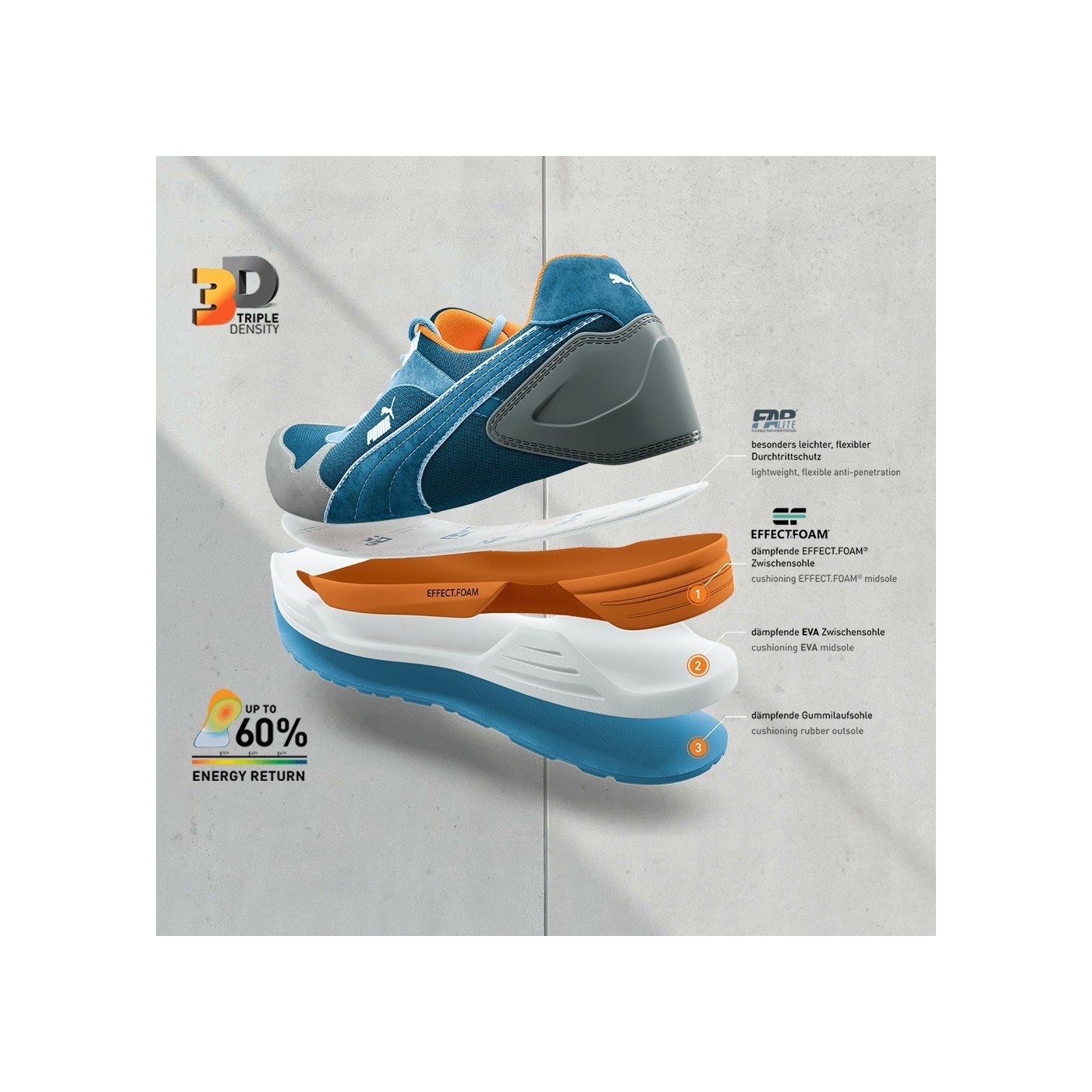 Descubre el calzado de seguridad Puma Safety, diseñado para brindarte una protección óptima en diversas áreas de aplicación. Con su puntera de fibra de vidrio y la protección flexible antiperforación FAP®lite, te sentirás seguro y cómodo en cada paso. Además, cuenta con extras como un ojal de TPU para un refuerzo adicional y protección del talón de TPU. Su corte de malla sandwich con microfibra y forro técnico BreathActive proporcionan transpirabilidad y comodidad durante todo el día. La plantilla evercushion® CUSTOM FIT se adapta a la forma de tu pie para brindar un ajuste personalizado. La suela URBAN EFFECT ofrece un agarre confiable en diferentes superficies. Disponible en colores azul y naranja, este calzado de Puma Safety combina estilo y funcionalidad. Perfecto para almacenes, logística, artesanía, oficinas y producción. Fabricado con materiales de alta calidad como mesh y microfibra. ¡Experimenta la seguridad sin renunciar al estilo con Puma Safety!