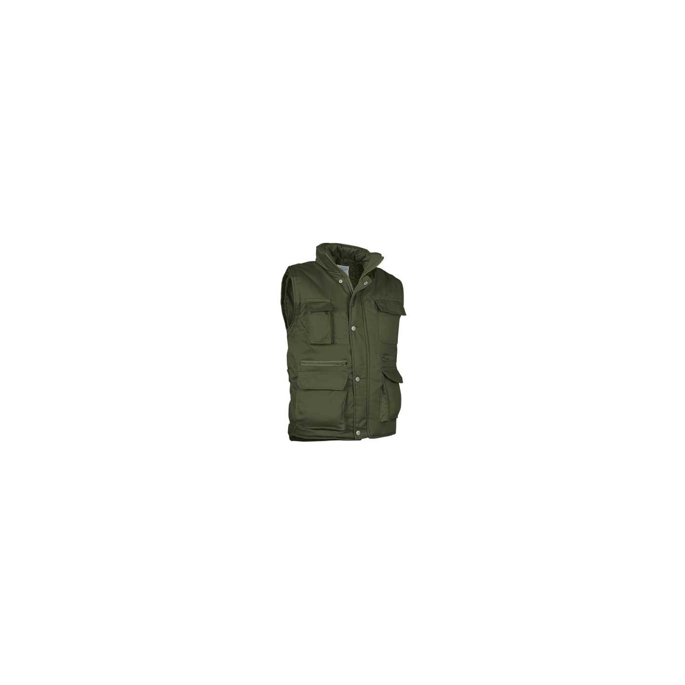 Chaleco multibolsillos confeccionado en tejido de sarga con relleno acolchado y forro interior. Cuello alto y cremallera frontal entera. Incluye una sopata sobre la cremallera, con cierres de presión. 8 bolsillos en la cara exterior incluyendo dos departamentos para bolígrafo y un bolsillo para el teléfono móvil.
