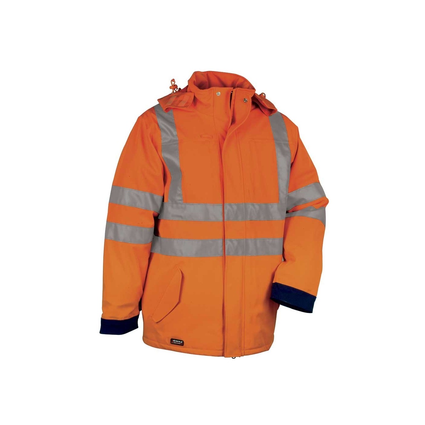DESCRIPCIÓN: 2 bolsillos delanteros con velcro, 2 bolsillos interiores en pecho con cremallera bajo la solapa, 3M™ SCOTCHLITE™ Reflective Material - 8906 Silver Fabric vertical y horizontal, bajo de la prenda con cierre de cremallera, capucha despegable, costuras termoselladas, cremallera YKK®, pasador porta tarjeta, puños elásticos