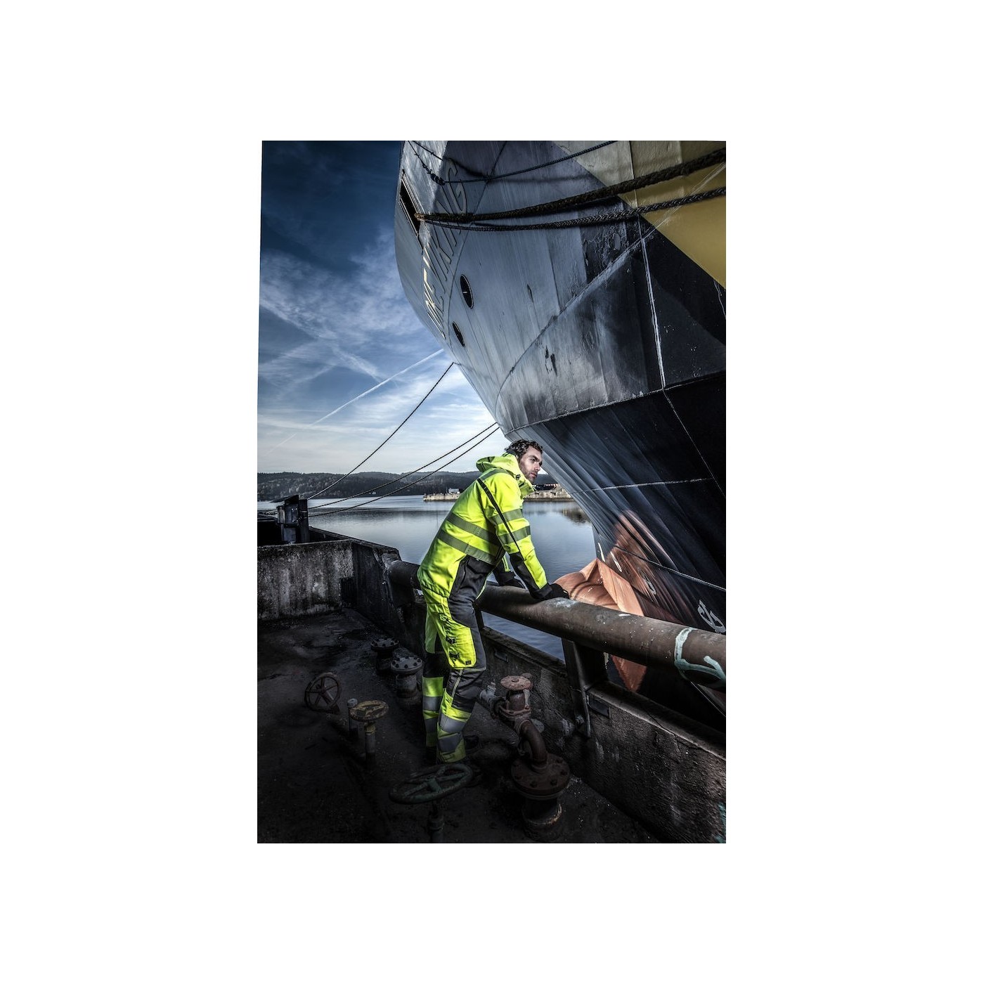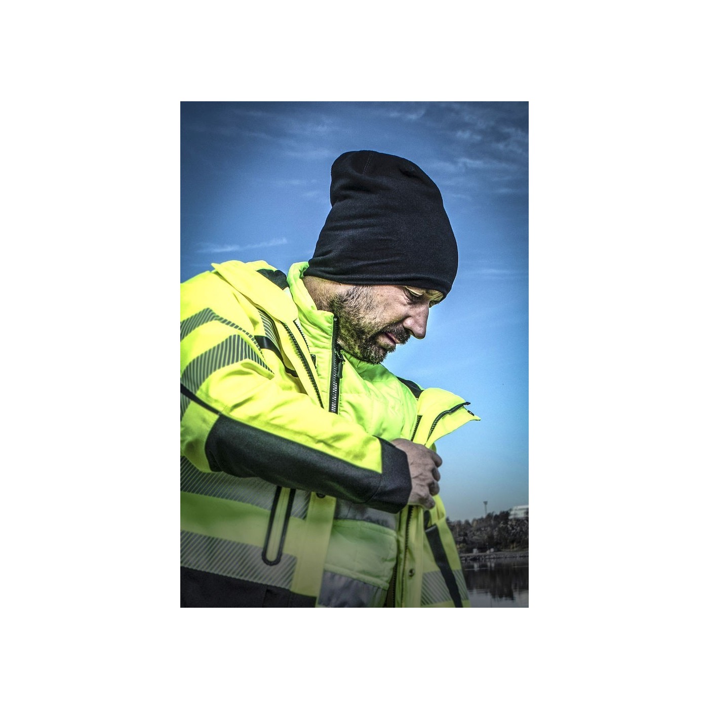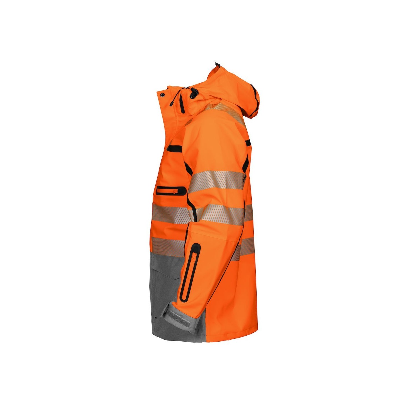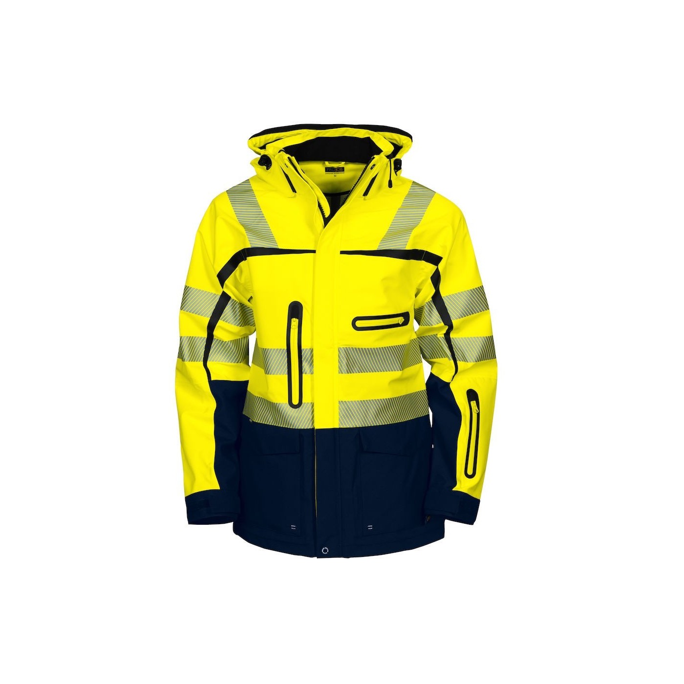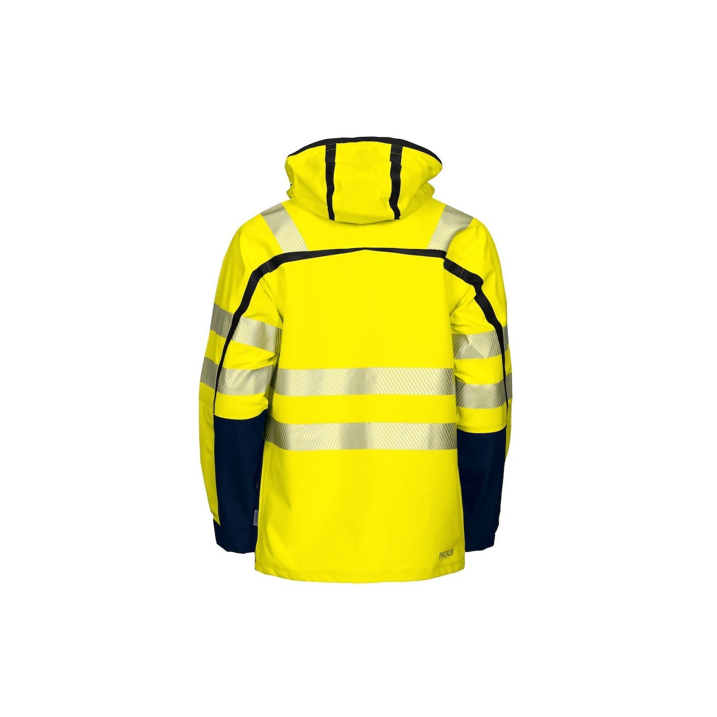 Chaqueta Projob de alta visibilidad de última generación. 3ª capa resistente a viento y agua con capucha extraíble. Cordón ajustable en cintura. Tres bolsillos con cremallera resistente al agua, dos frontales y uno en antebrazo. Dos bolsillos laterales forrados y dos en solapa. Doble tapeta con cremallera frontal. Brazos pre-curvados. Ideal para llevar con 6444 y 3423.