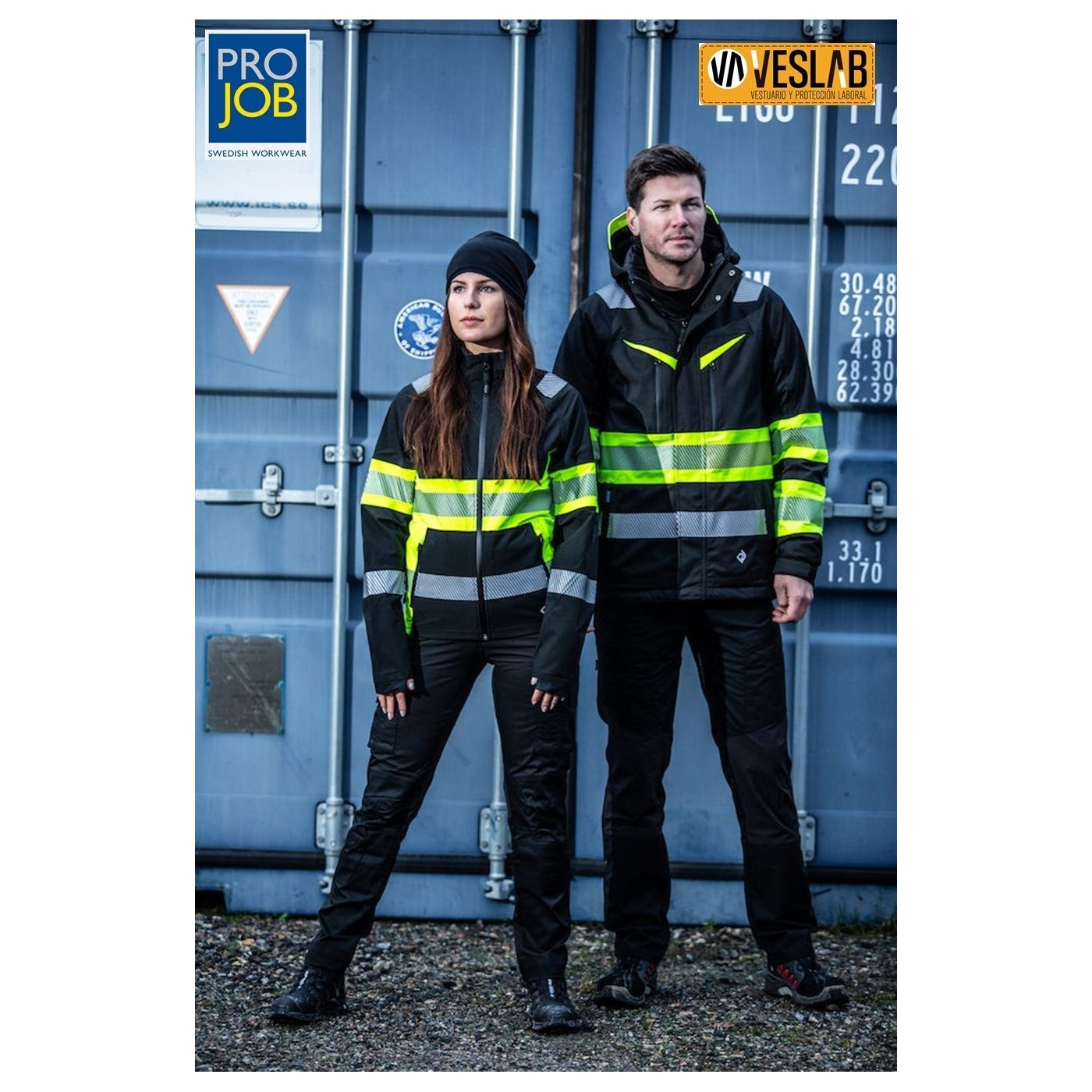 Chaqueta Projob de alta visibilidad flexible resistente a viento y agua con costuras selladas. El acolchado es de Primaloft® y proporciona un tacto y una calidez extra.