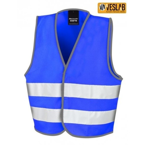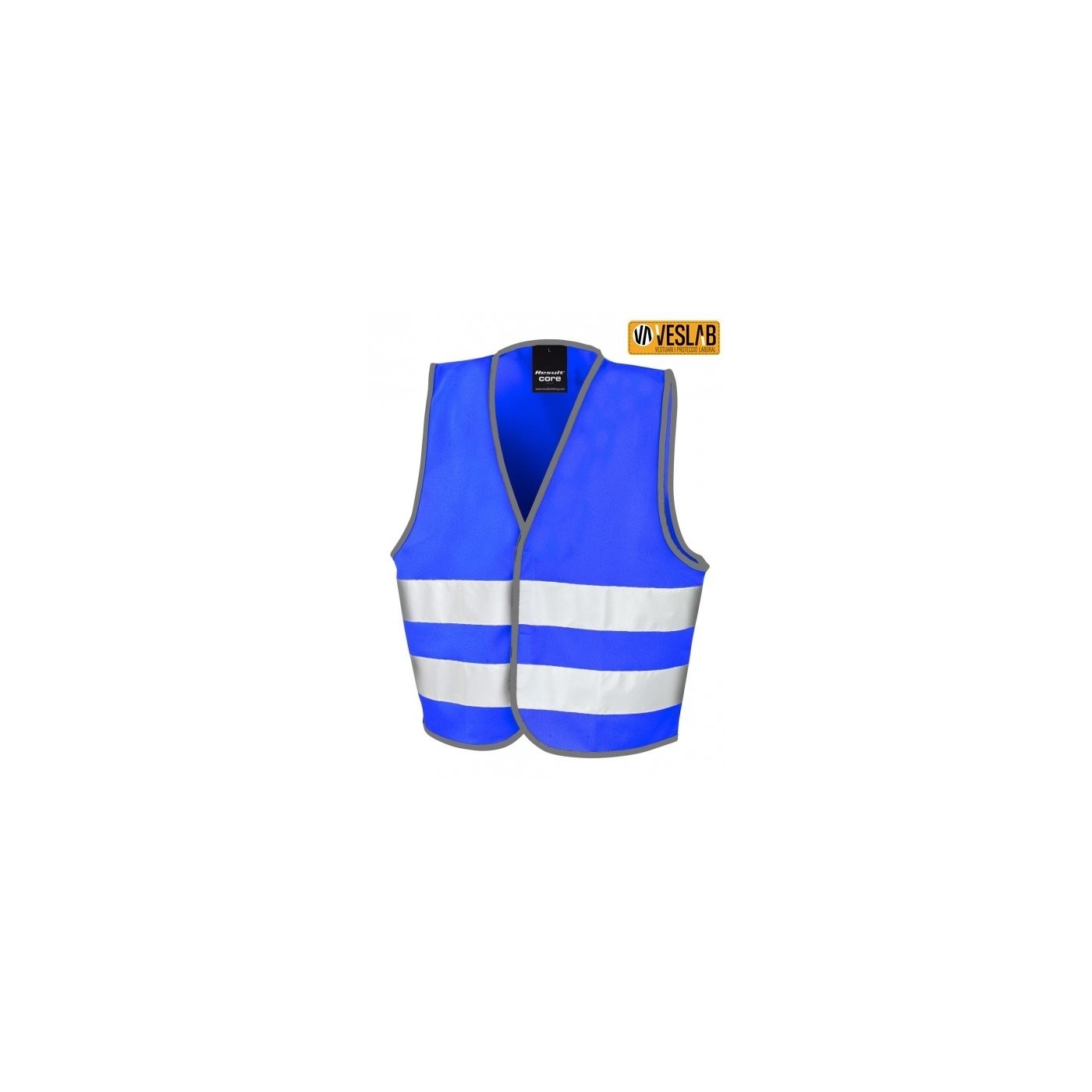 Chaleco infantil de alta visibilidad disponible en varios colores y tallas. Con un gramaje muy ligero de 120 g/m², confeccionado completamente en poliéster al 100%. Destaca por sus bandas reflectantes de 50 mm cosidas y ribetes de color gris que aumentan la visibilidad. El cierre frontal tipo velcro facilita la colocación, y su ajuste holgado permite llevarlo cómodamente como prenda superior. Ideal para garantizar la seguridad de los más pequeños en cualquier entorno: uso de bicicletas, escolar, excursiones, medio ambiente, aglomeraciones, etc...