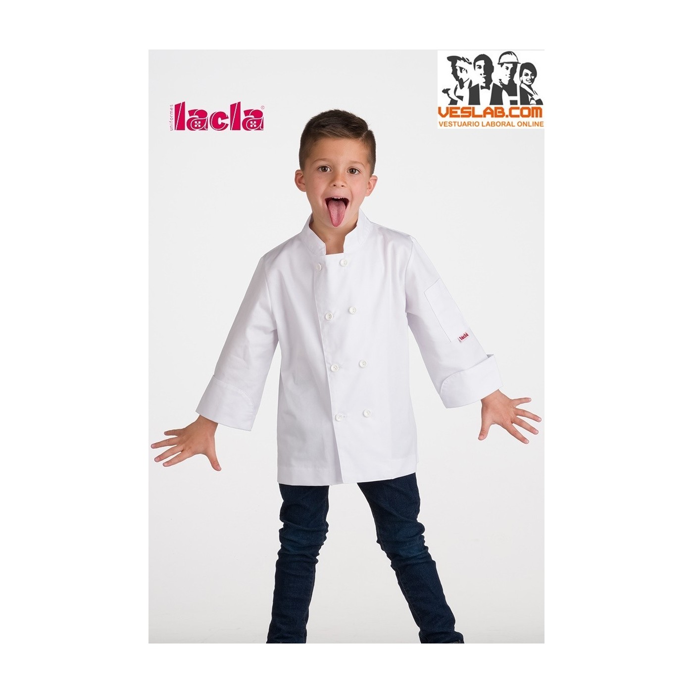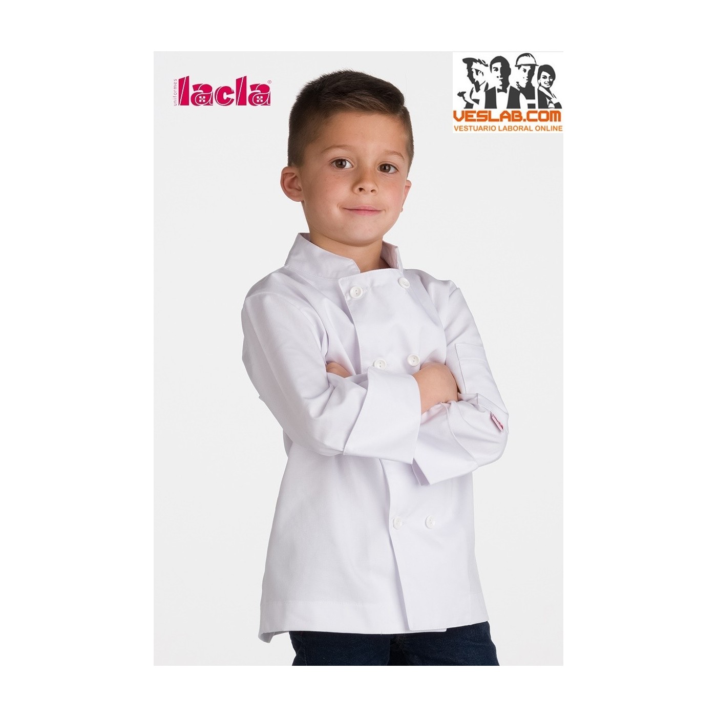 Chaqueta cocina infantil lisa , cruzada con doble botonadura , cuello mao , manga larga con bocamanga lisa y un bolsillo pequeño en la manga.