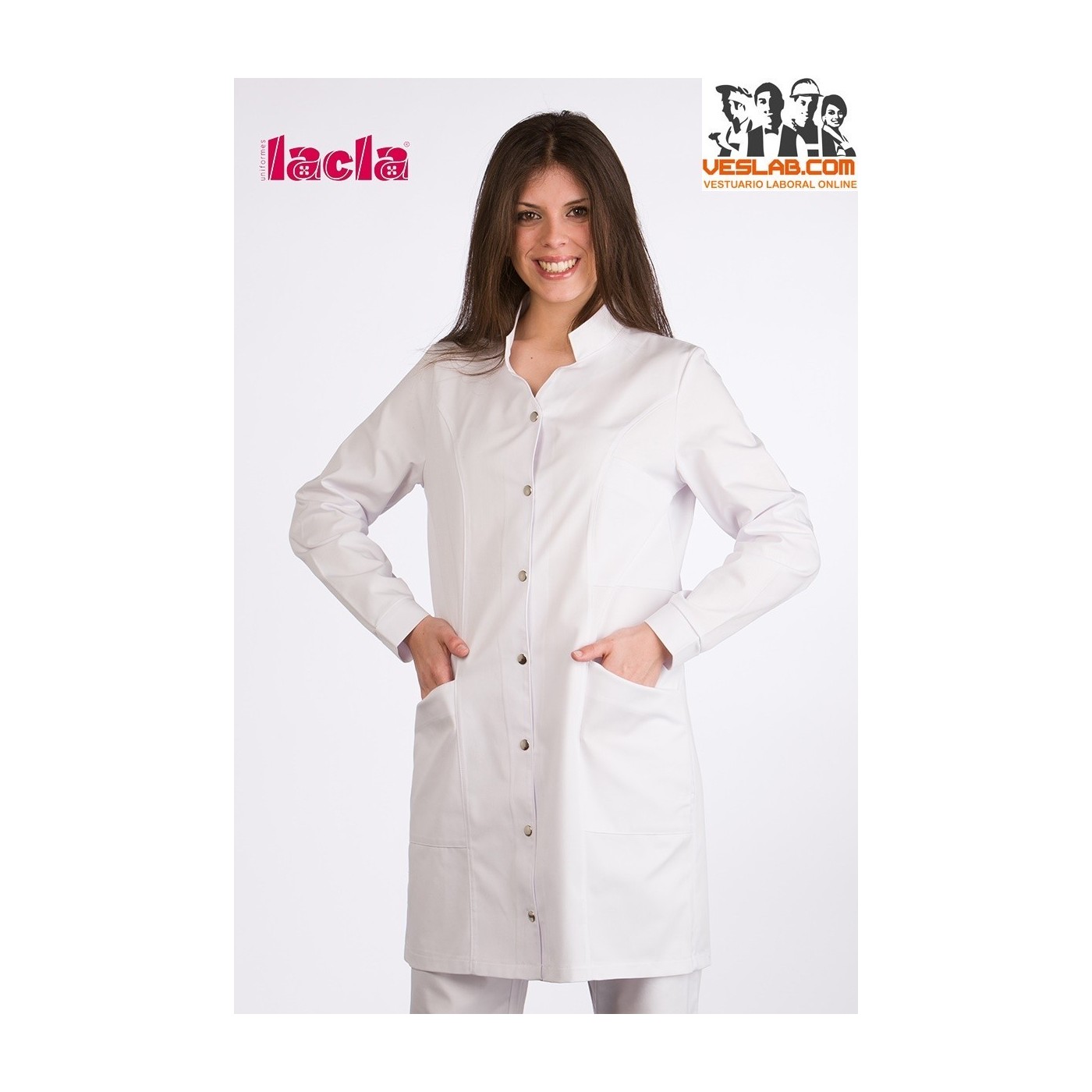 Bata lisa con costadillos delante y espalda con pinzas , manga larga con puño y corhete , delante abrochada con corchetes metálicos , 2 bolsillos 1 de pecho , con cuello mao y escote pico.