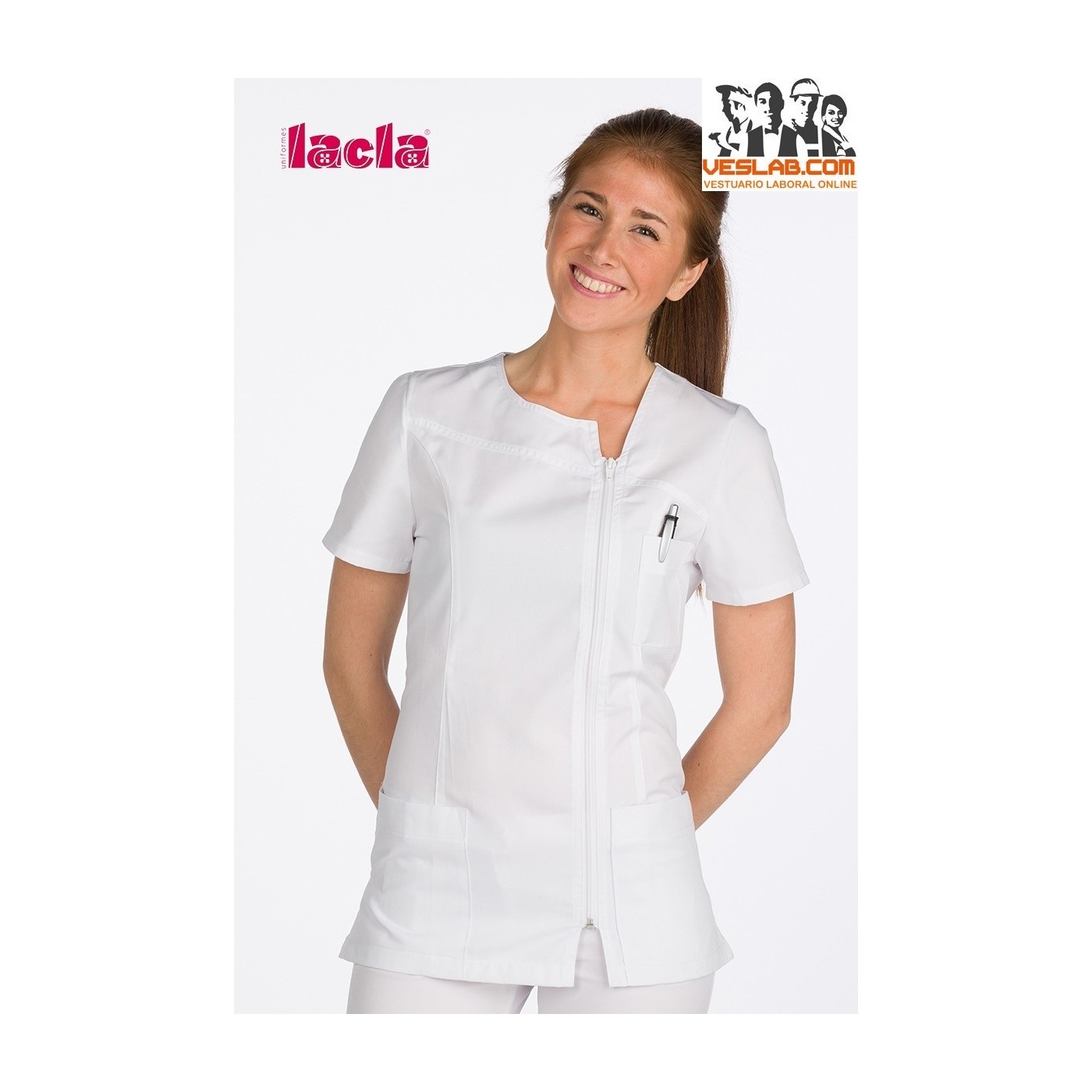 Casaca lisa , con escote redondo y canesú irregular , delanteros con costadillos , bolsillo superior y inferiores , cremallera lateral , espalda con pinzas , aberturas laterales , manga corta.