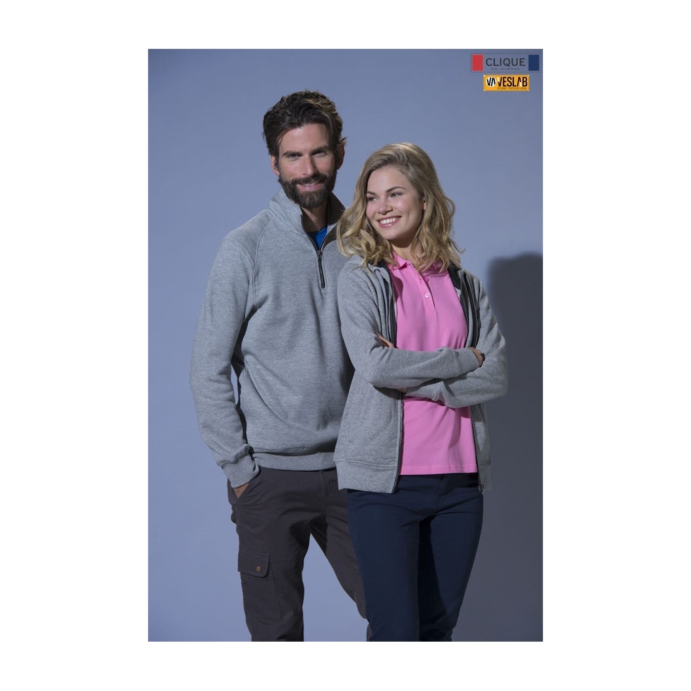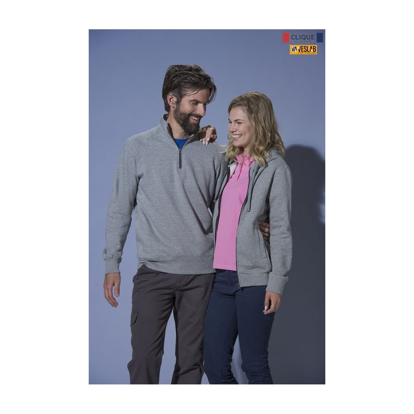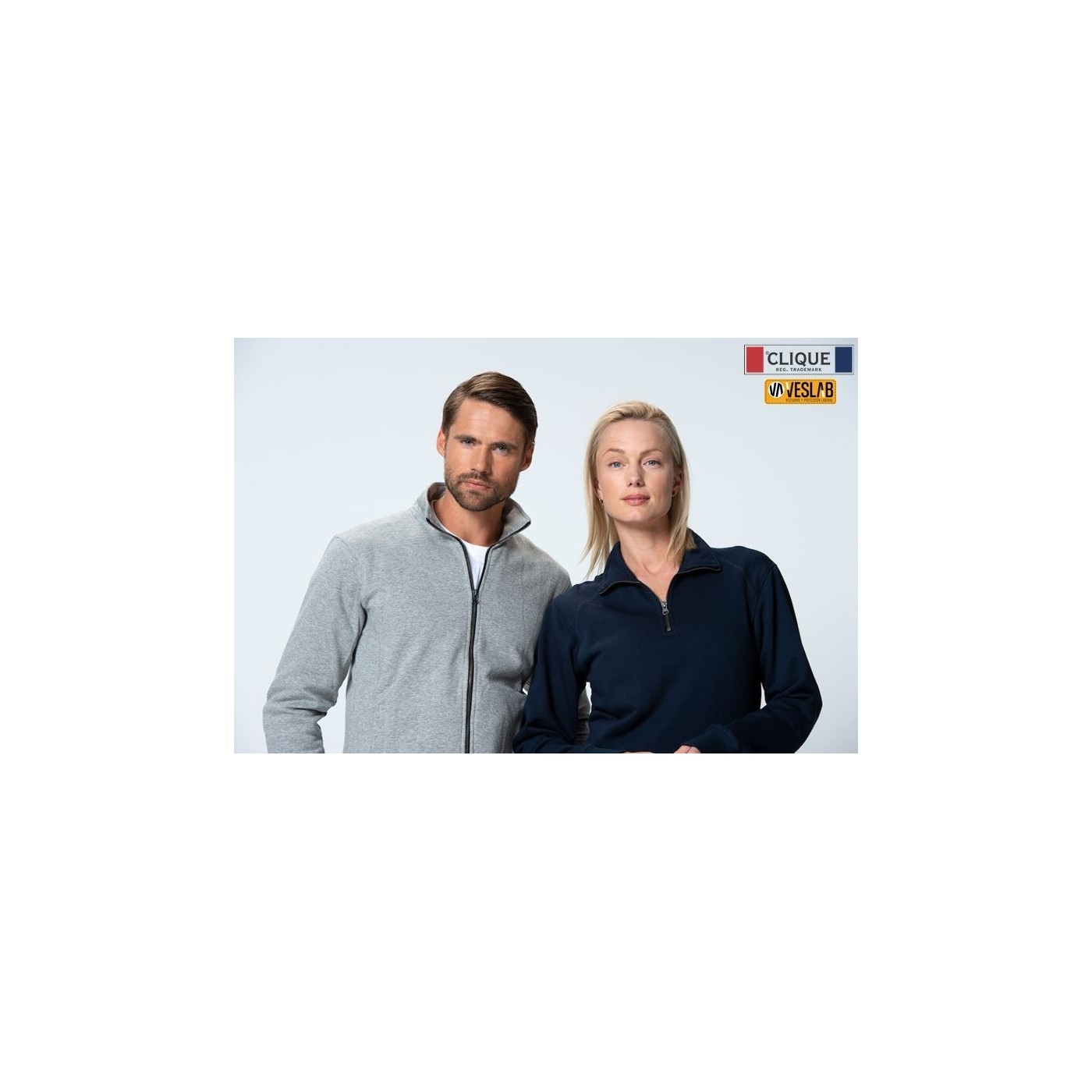 Sudadera cárdigan con práctica solución para el móvil y bolsillos laterales con cremallera. Canalé elástico 2x2 en mangas y cintura. Costuras a tono.