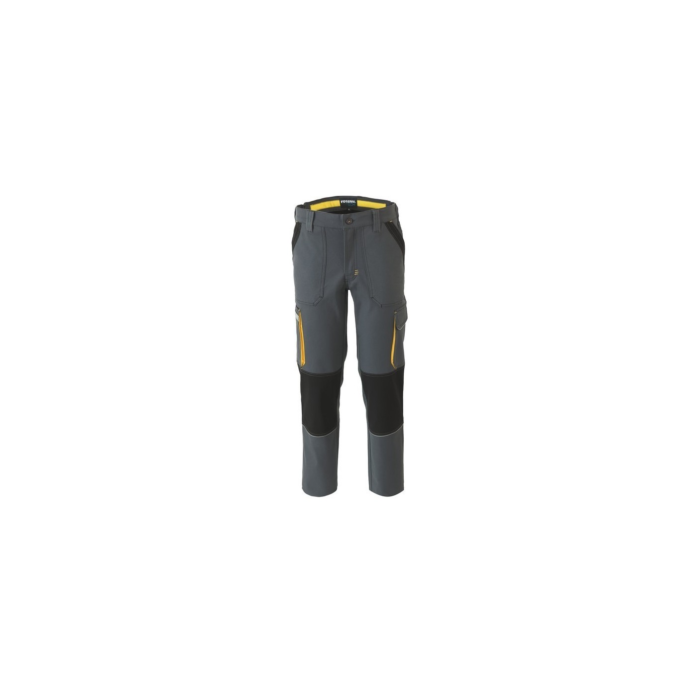 Cintura elástica lateral y trabillas para el cinturón, dos bolsillos delanteros grandes con refuerzo externo en contraste, bolsillo lateral de fuelle multifunción con banda reflectante, bolsillo con fuelle lateral con cierre de velcro, bolsillo trasero con solapa y velcro, refuerzos de tela en contraste en las rodillas, inserciones en contraste.