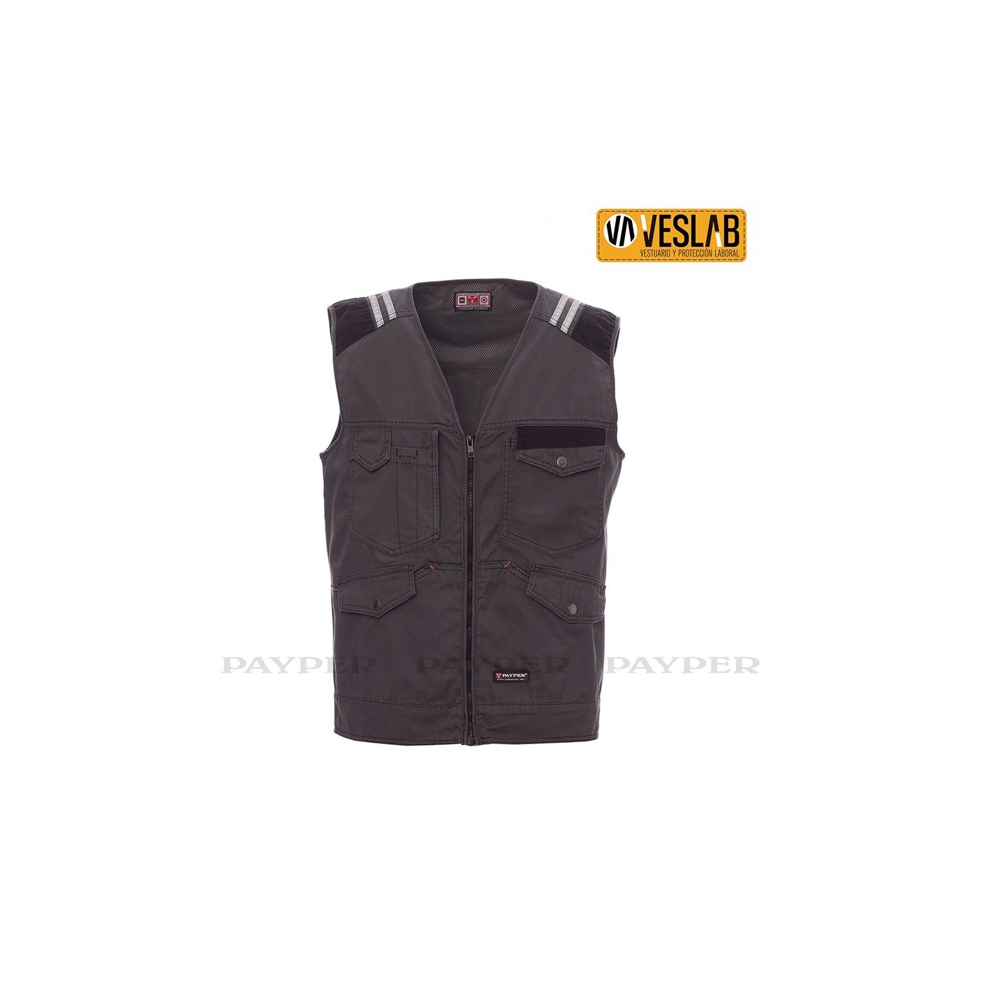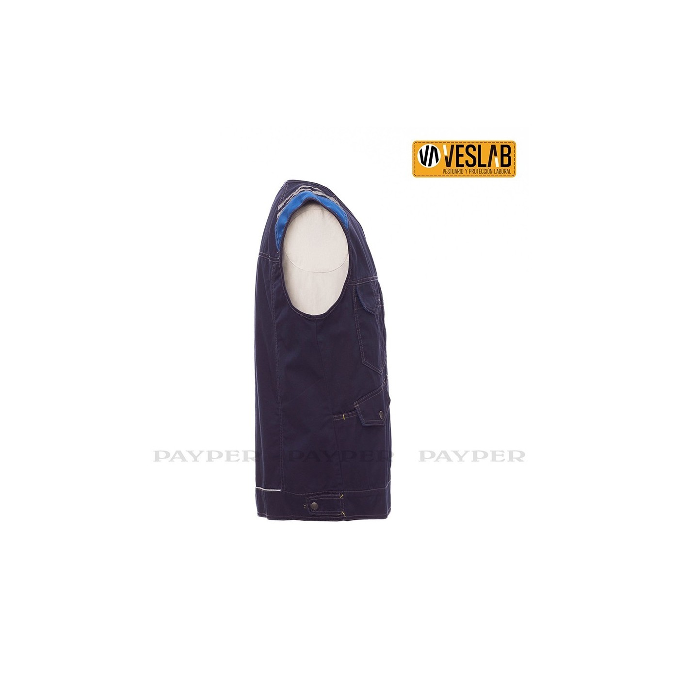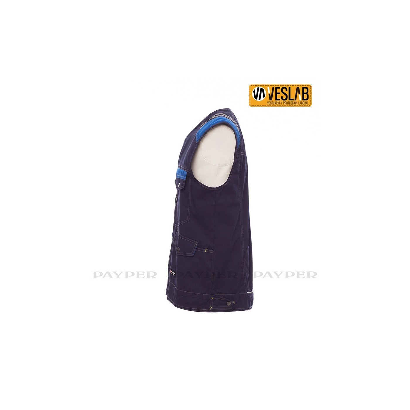 Chaleco de trabajo bicolor multibolsillos para hombre. Dispone de un cierre delantero con cremallera de plástico, cierre con botón en la cintura, tres bolsillos LOCK SYSTEM delanteros, dos como bolsillos canguro con solapa y botón metálico.