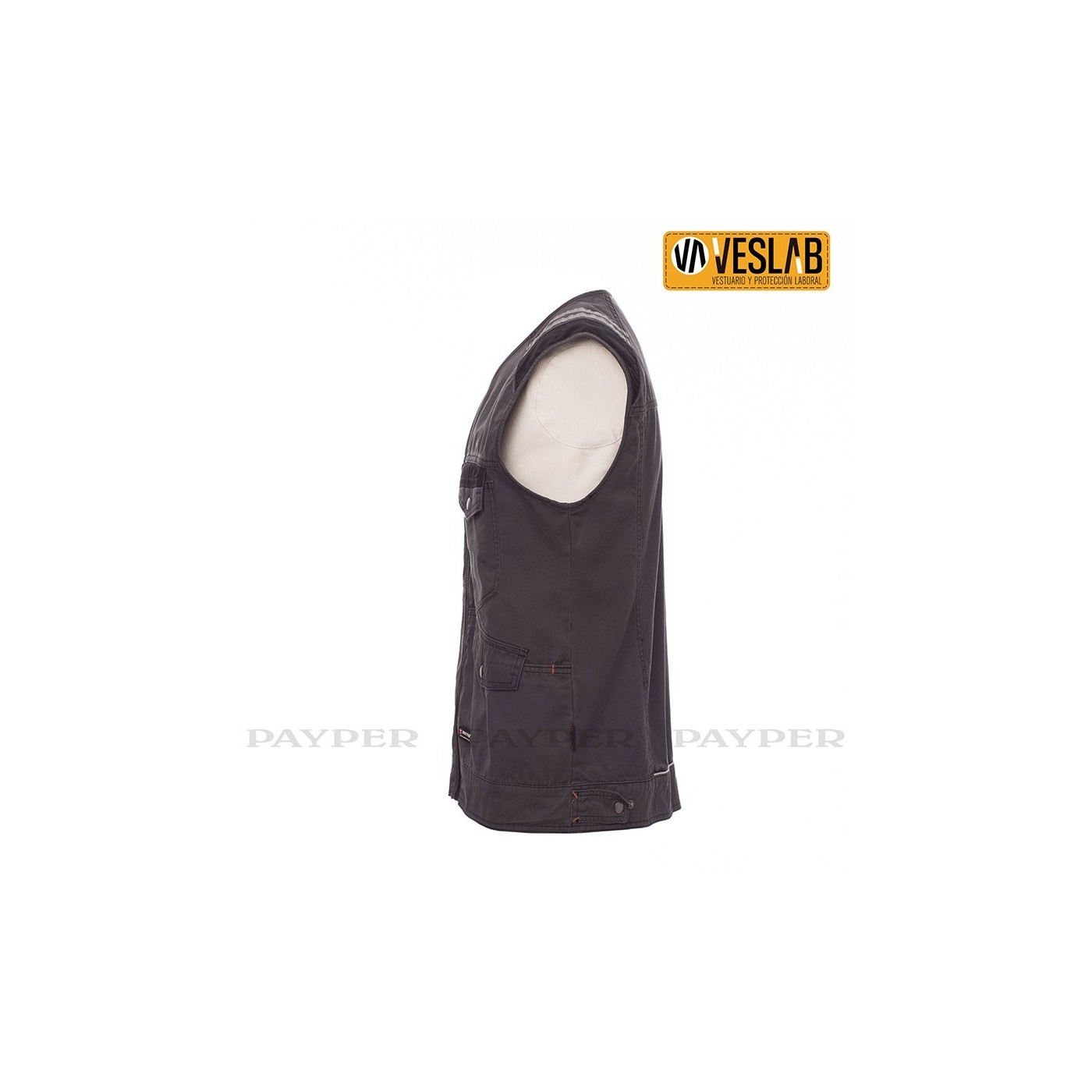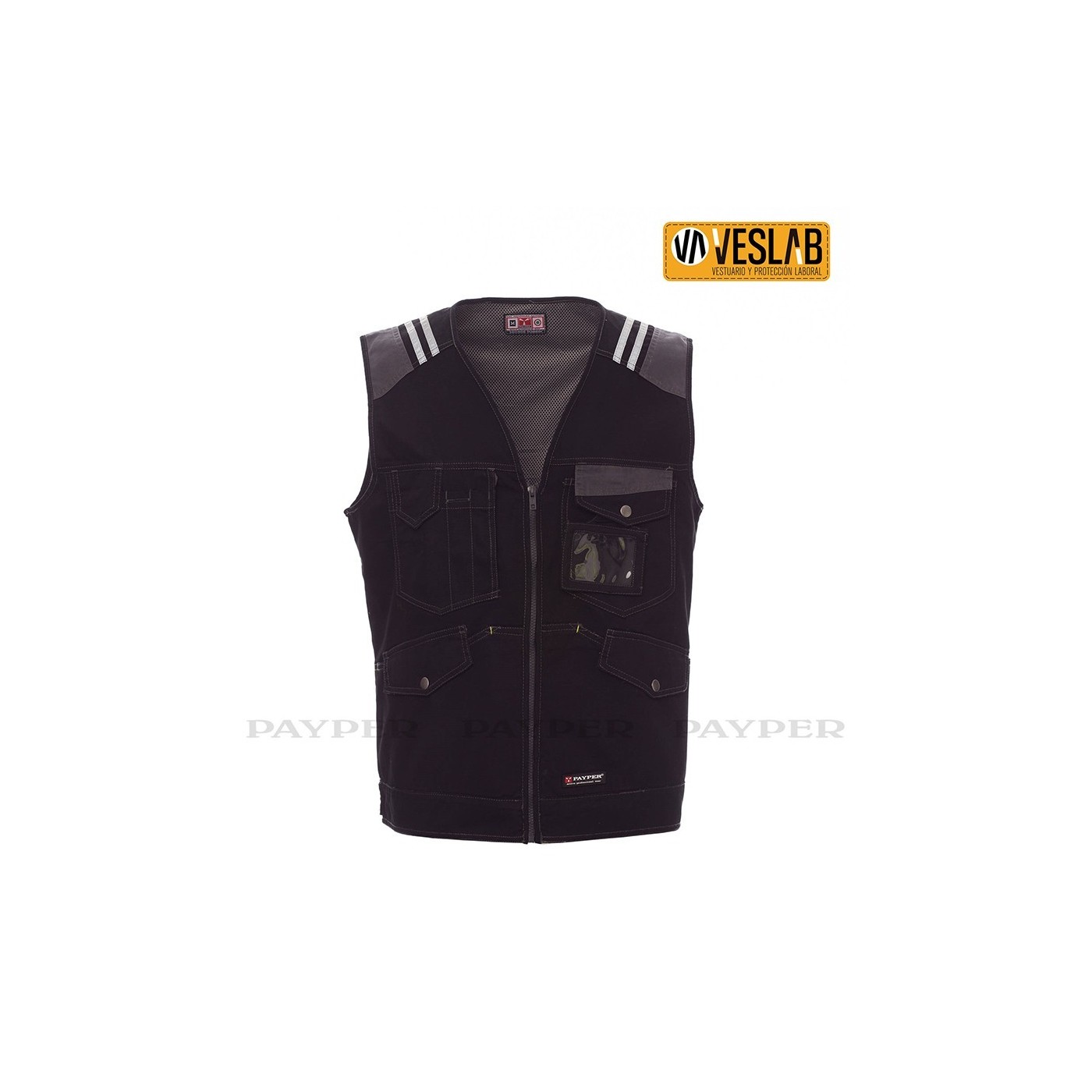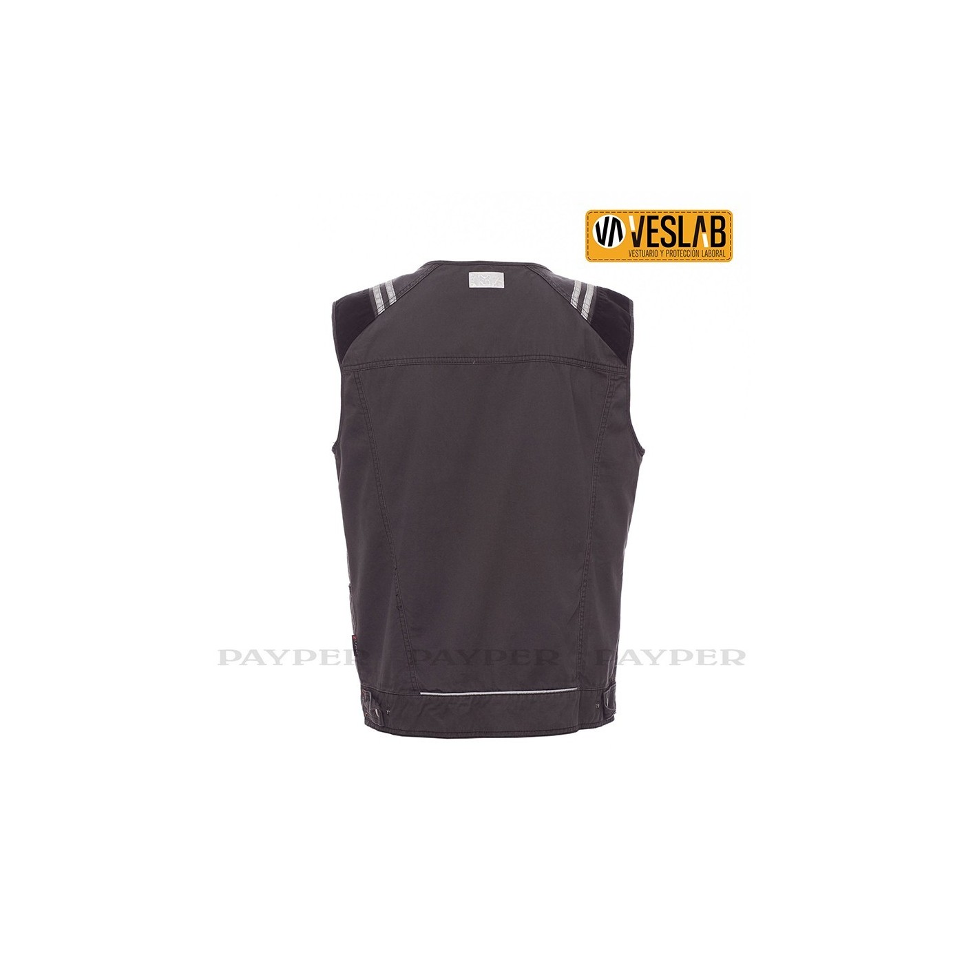 Chaleco de trabajo bicolor multibolsillos para hombre. Dispone de un cierre delantero con cremallera de plástico, cierre con botón en la cintura, tres bolsillos LOCK SYSTEM delanteros, dos como bolsillos canguro con solapa y botón metálico.