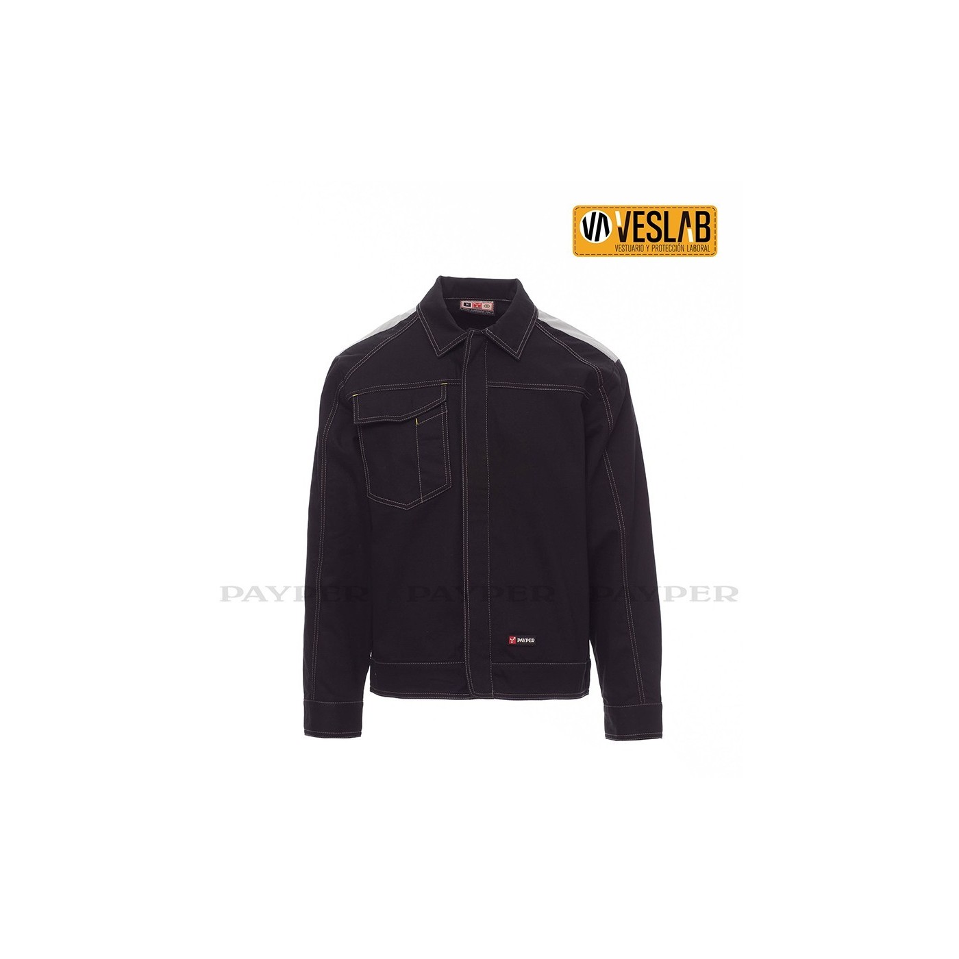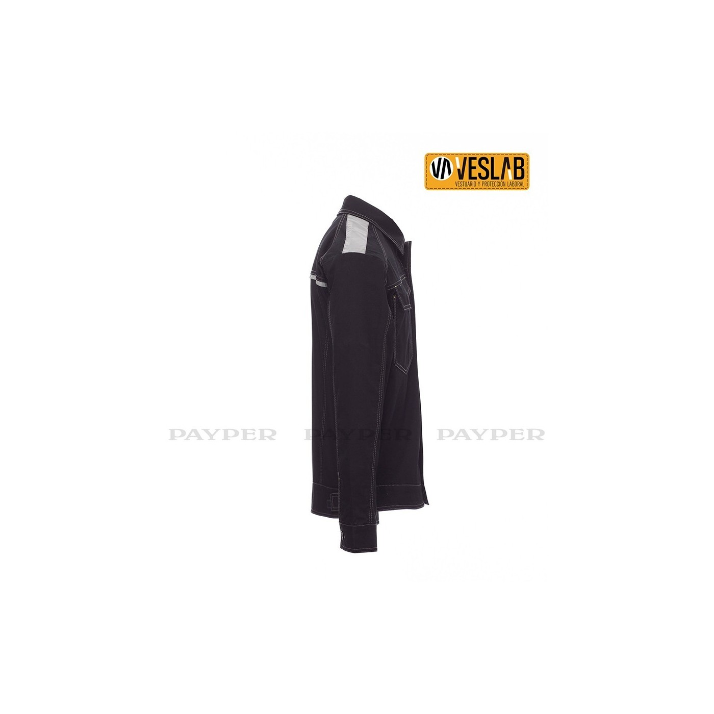 Dispone de puños con botón, cintura ajustable con velcro. Pespuntes de contraste, bolsillo para smartphone, soporte para insignia de identificación y soporte para bolígrafo en el bolsillo a la altura del pecho con solapa y velcro. Inserciones reflectantes en los hombros y la espalda, modelo de corte tipo vaquero.