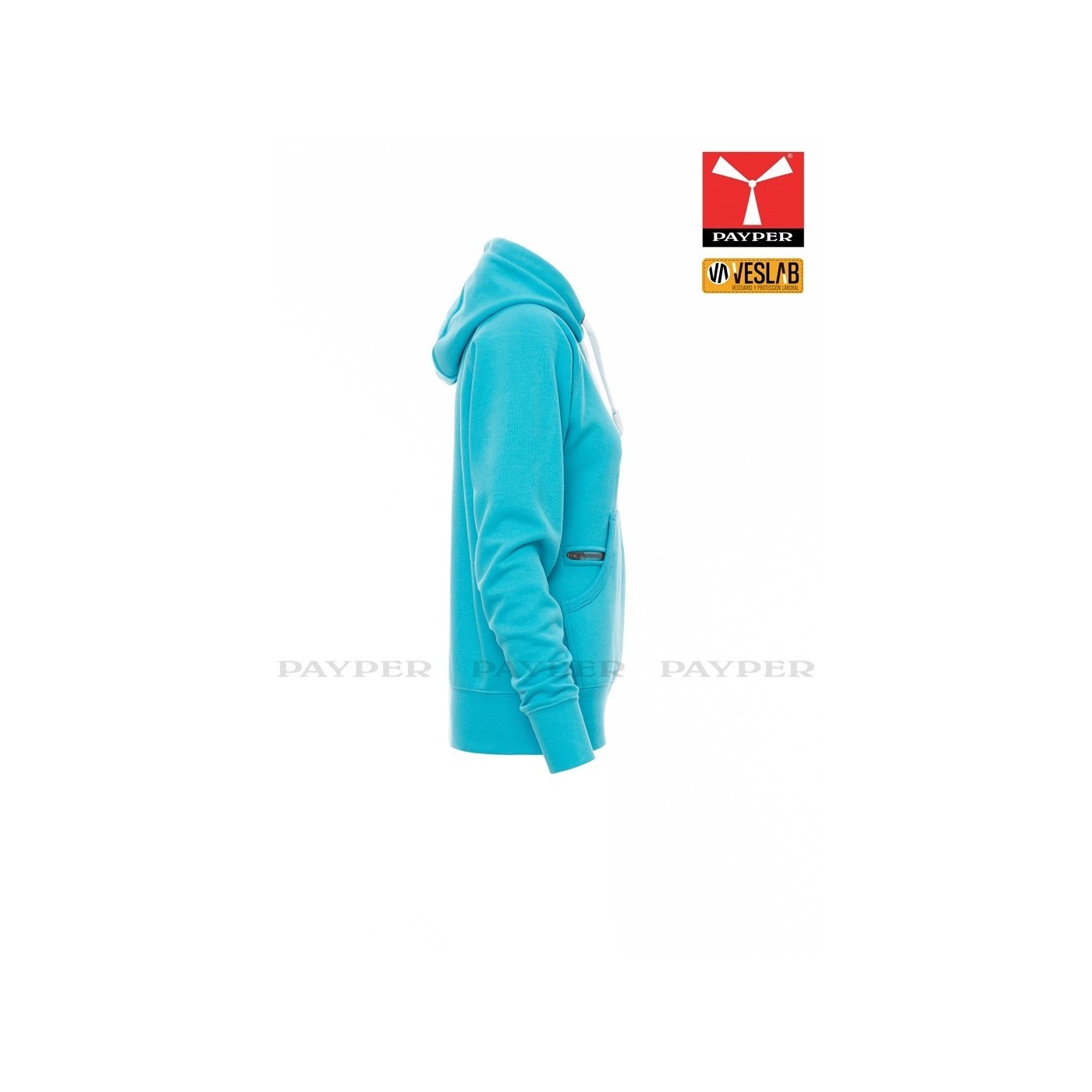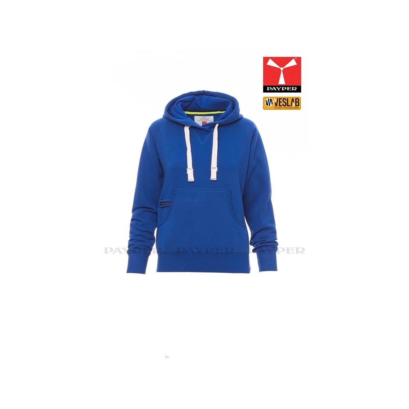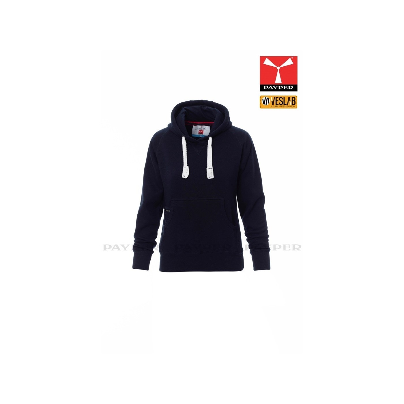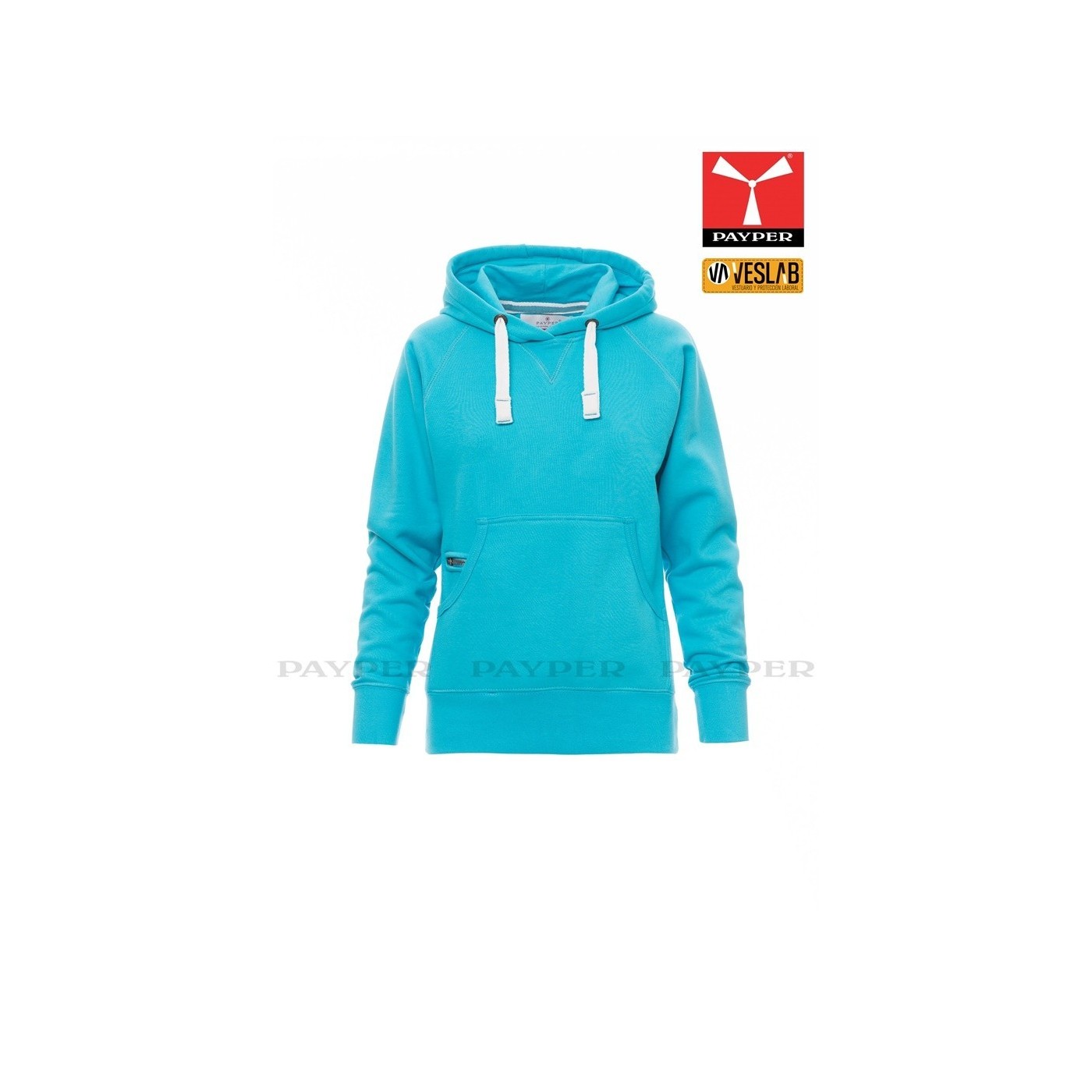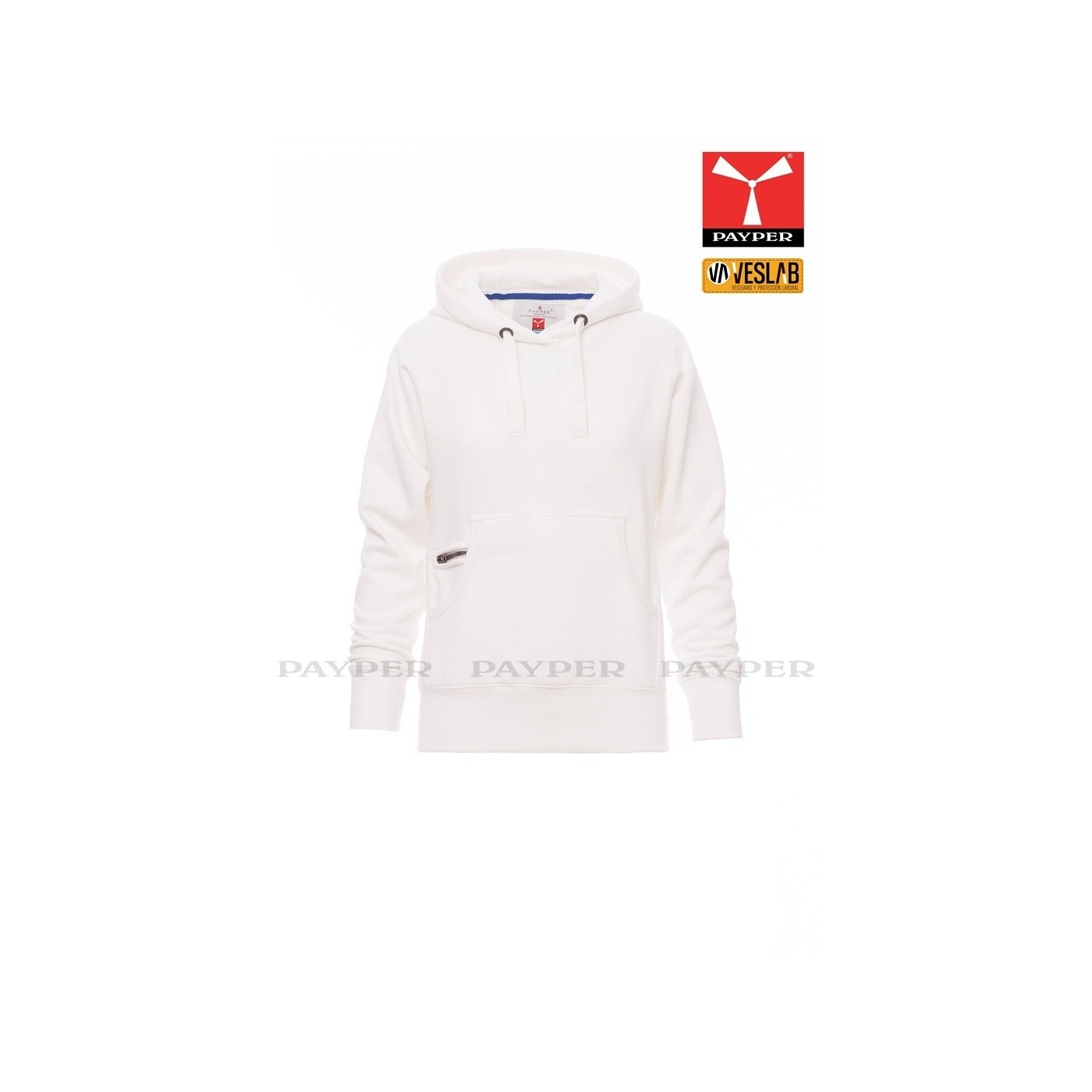 Se trata de una moderna sudadera entallada para mujer con capucha con doble costura y un ancho cordón blanco con puntadas y aros metálicos de contraste. Muy recomendable para quien quiera dar una imagen corporativa moderna y deportiva.