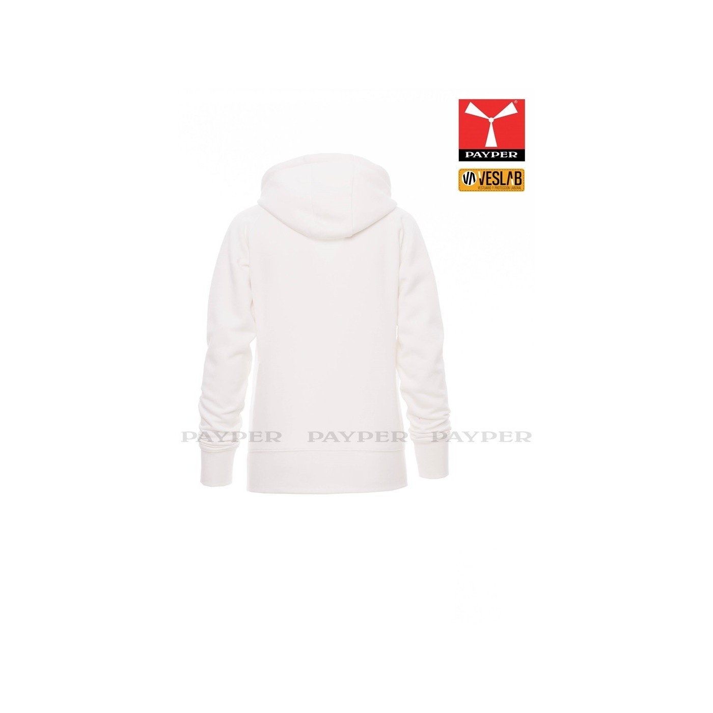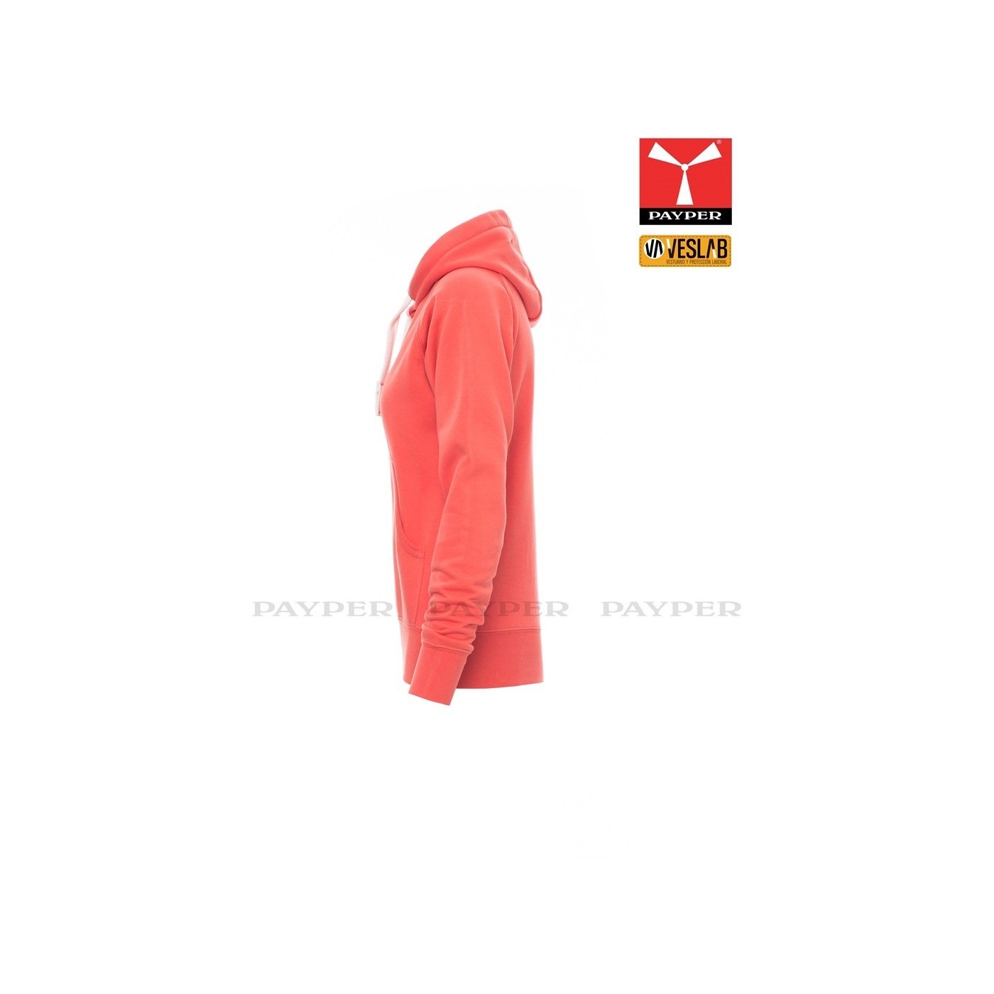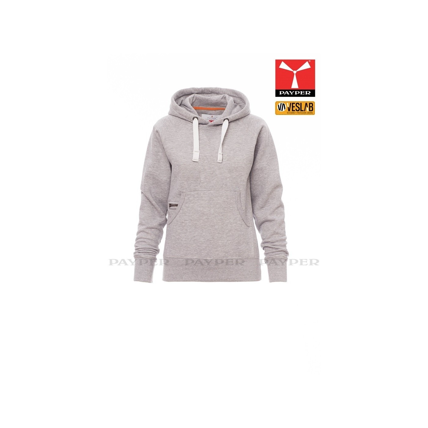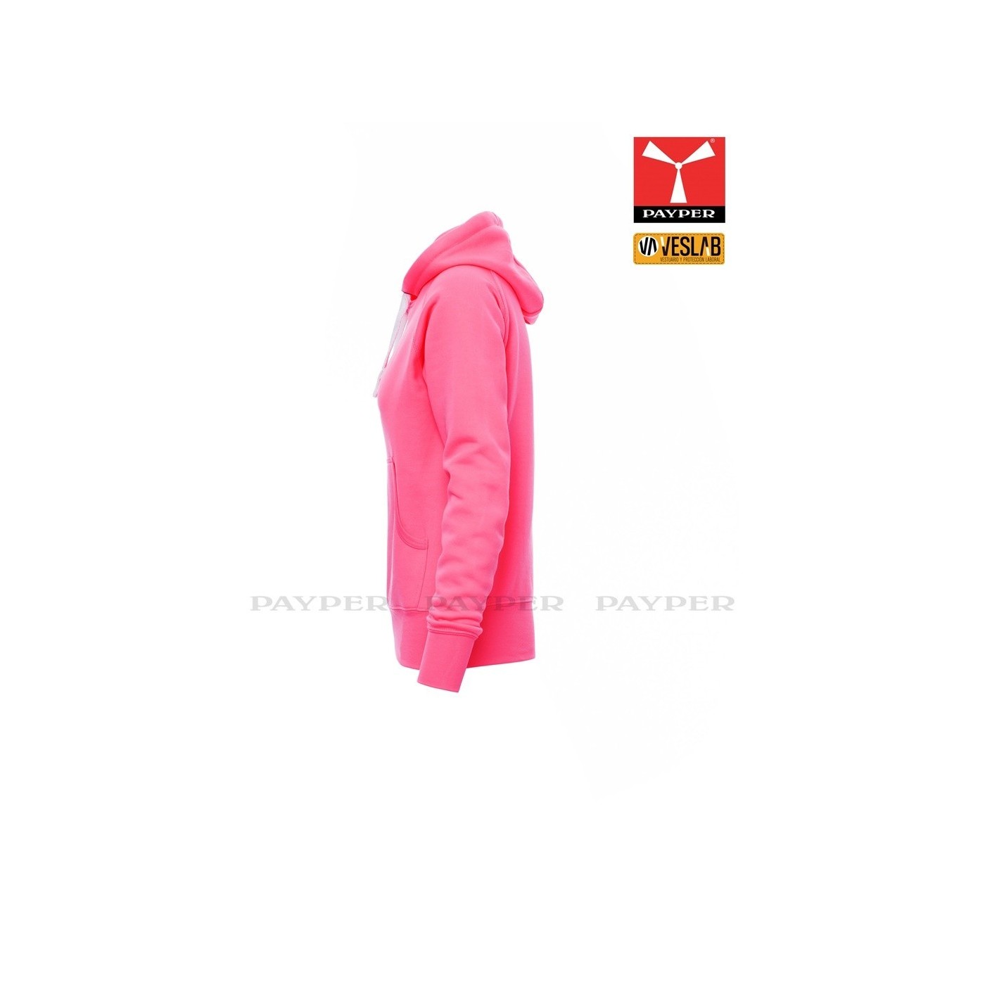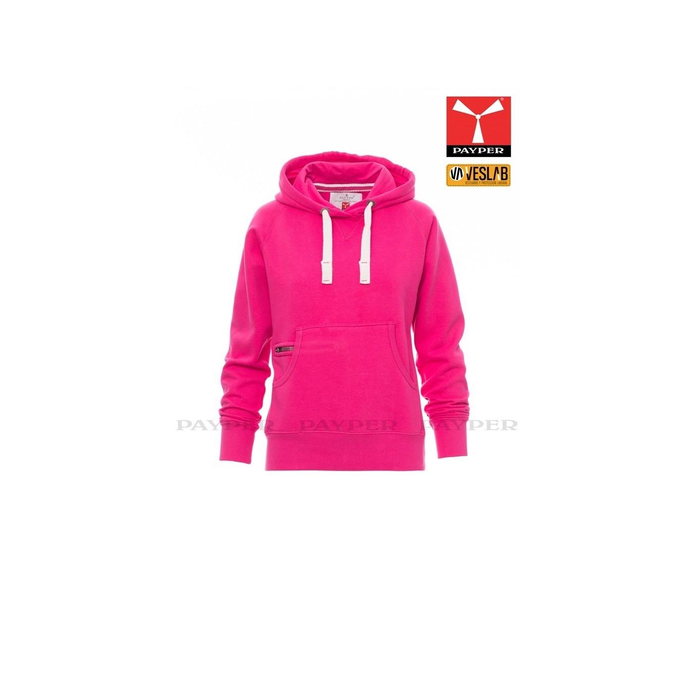 Se trata de una moderna sudadera entallada para mujer con capucha con doble costura y un ancho cordón blanco con puntadas y aros metálicos de contraste. Muy recomendable para quien quiera dar una imagen corporativa moderna y deportiva.