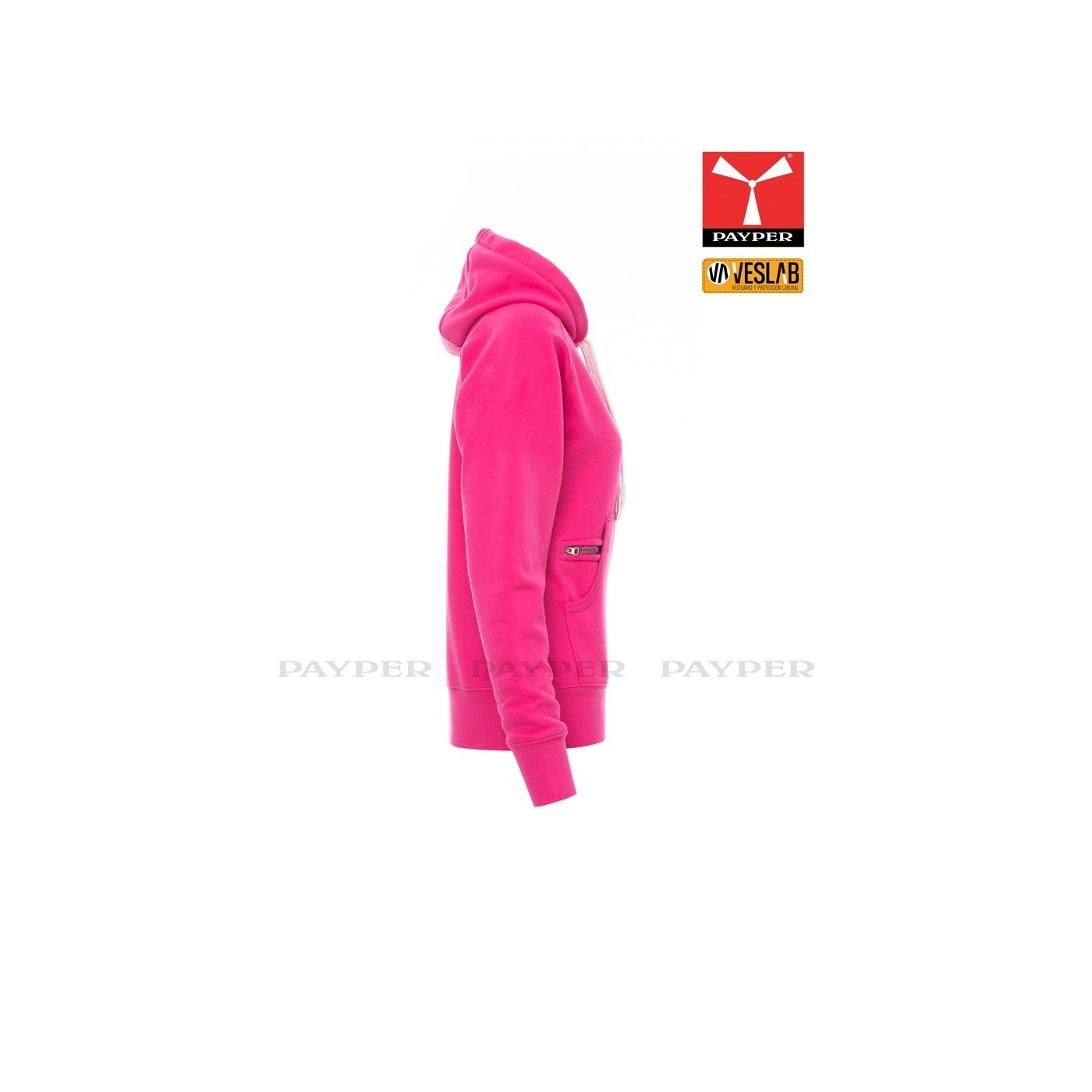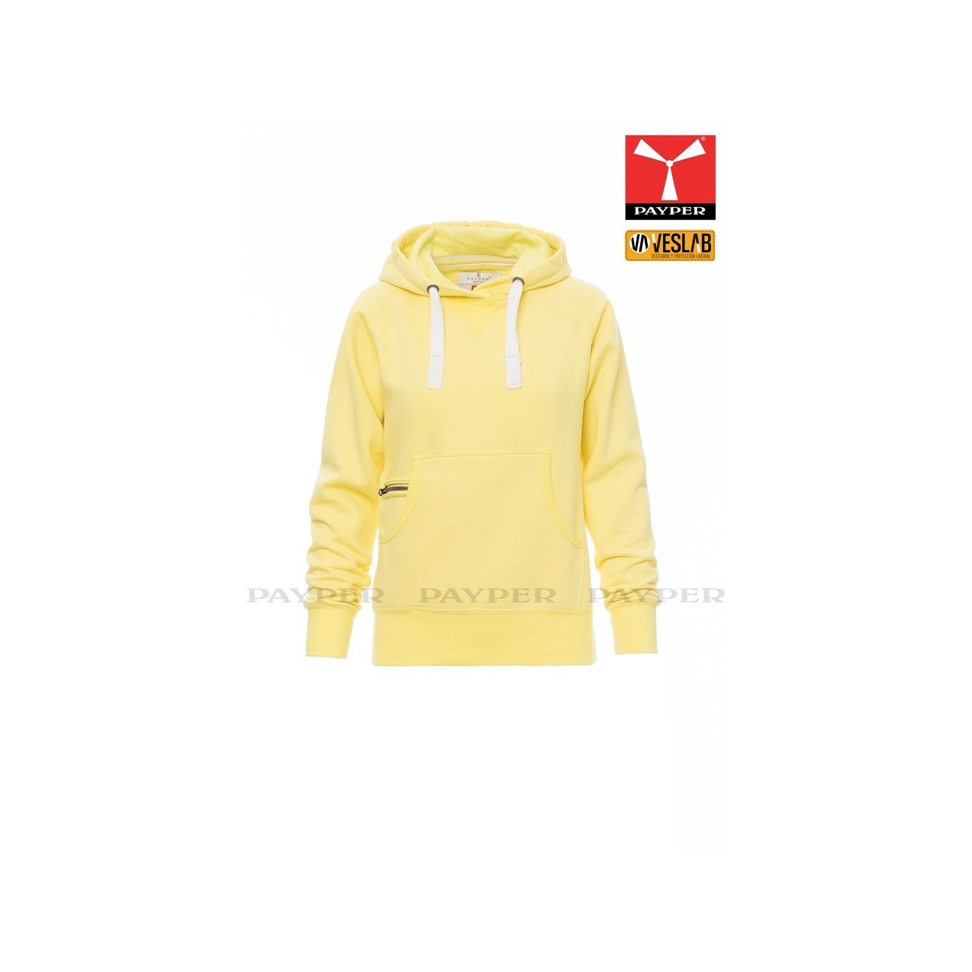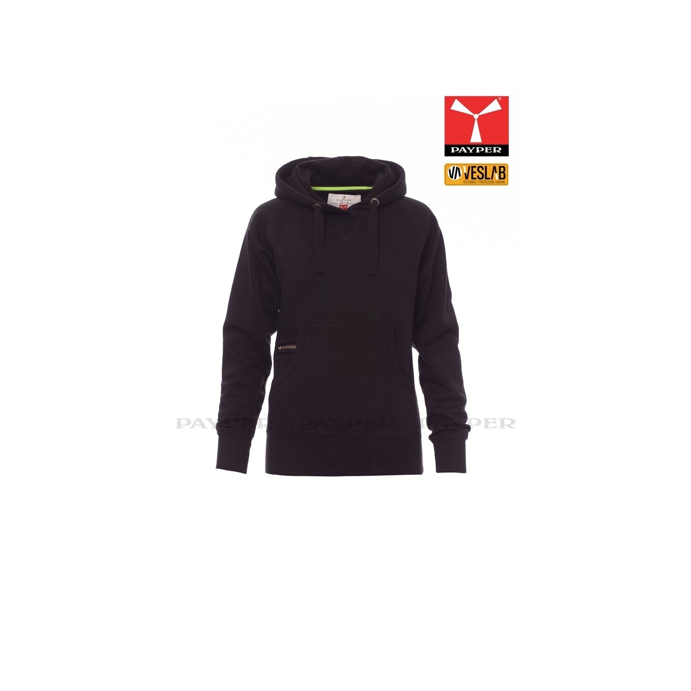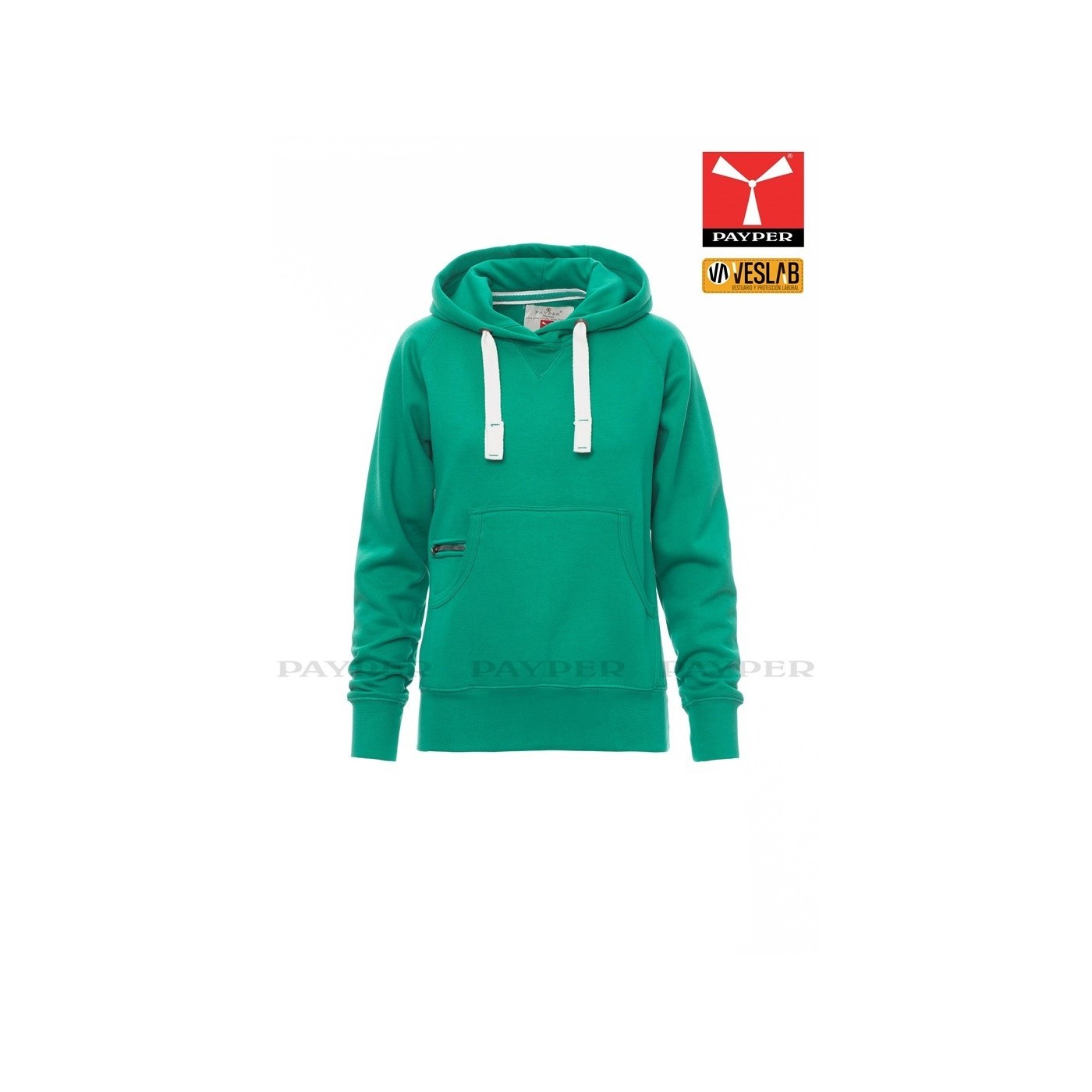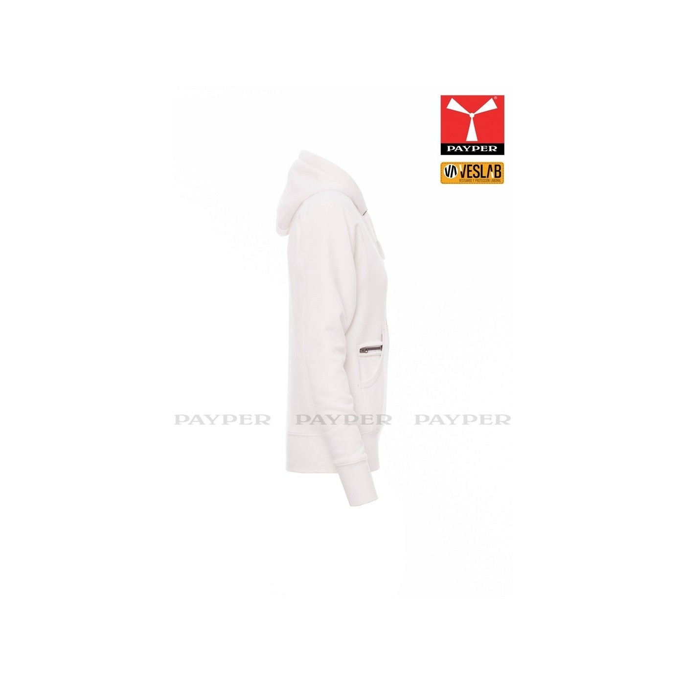 Se trata de una moderna sudadera entallada para mujer con capucha con doble costura y un ancho cordón blanco con puntadas y aros metálicos de contraste. Muy recomendable para quien quiera dar una imagen corporativa moderna y deportiva.