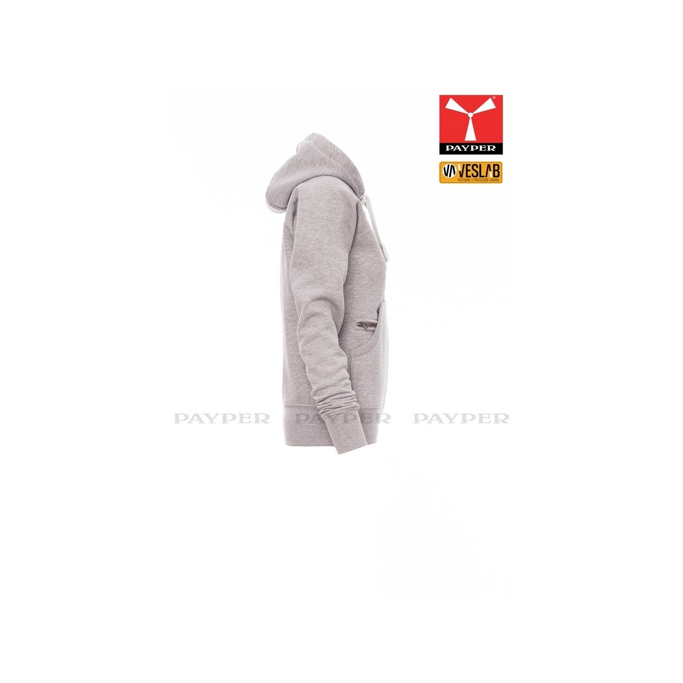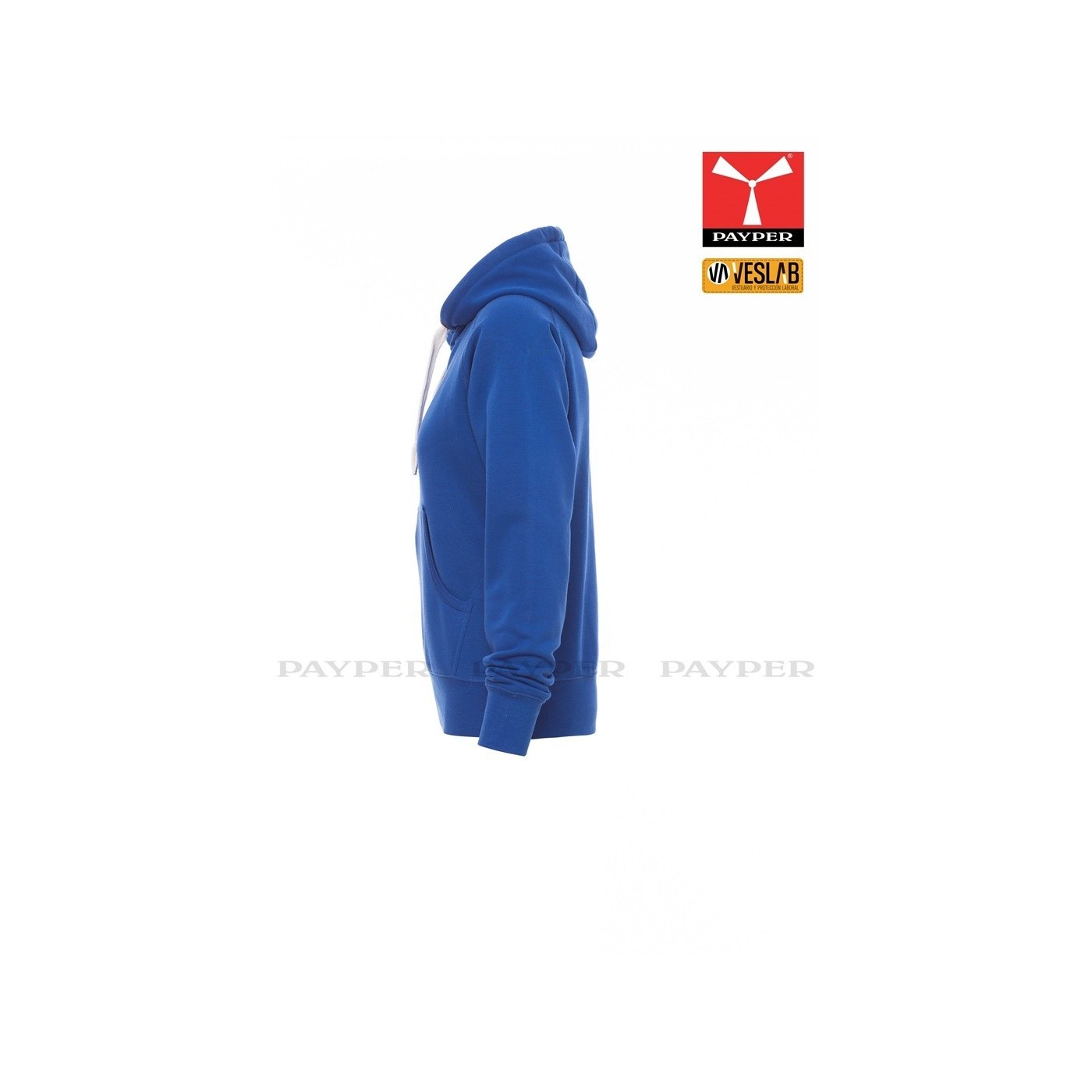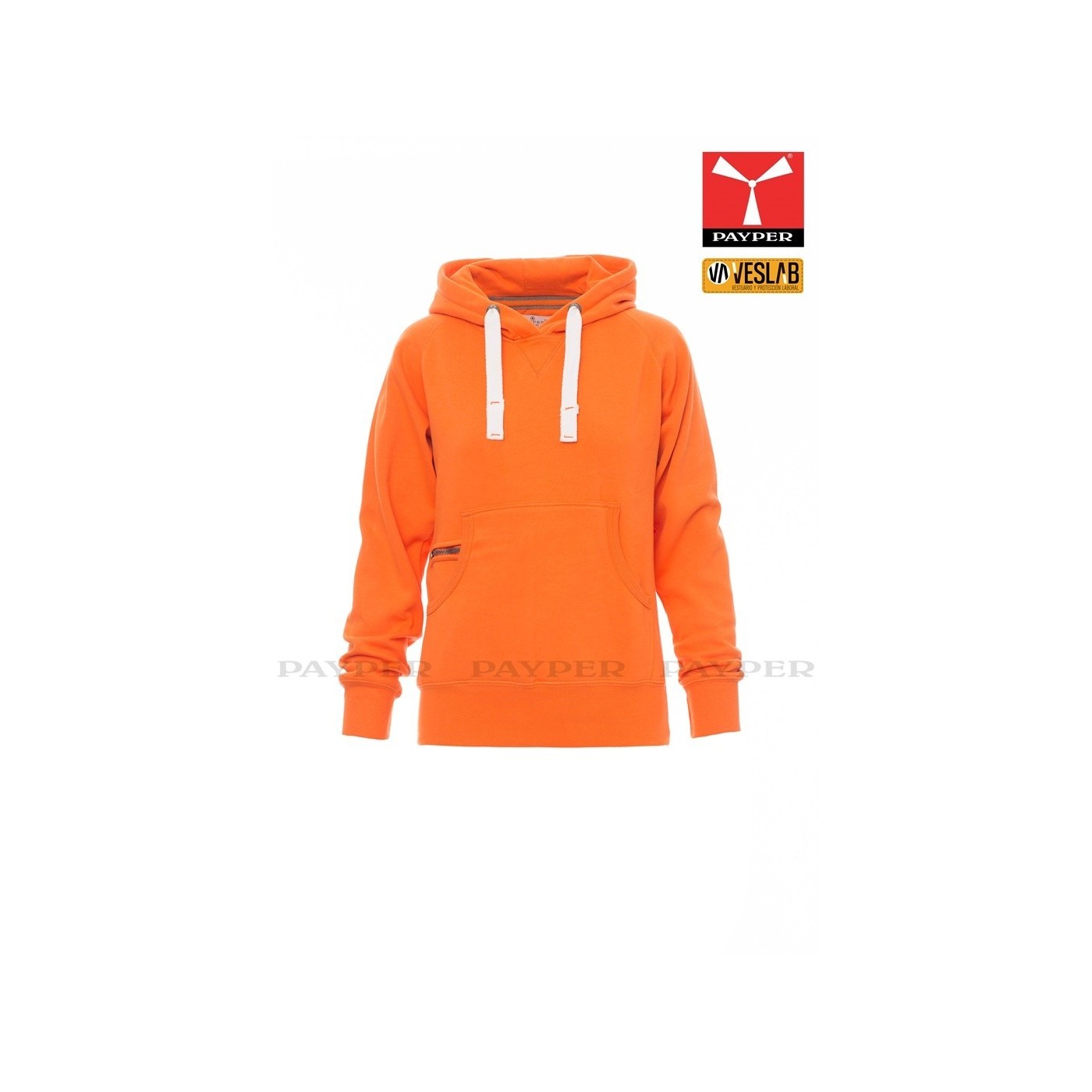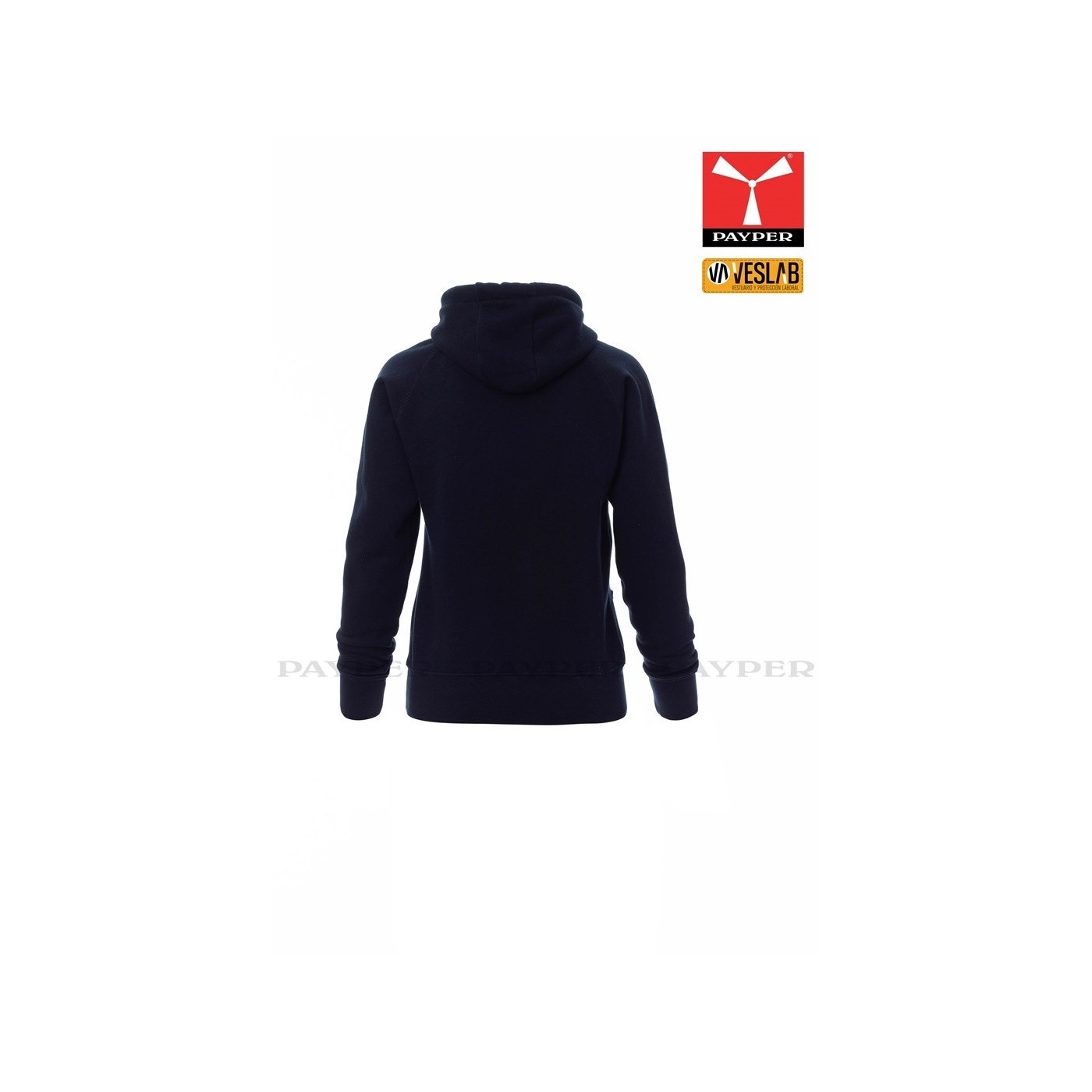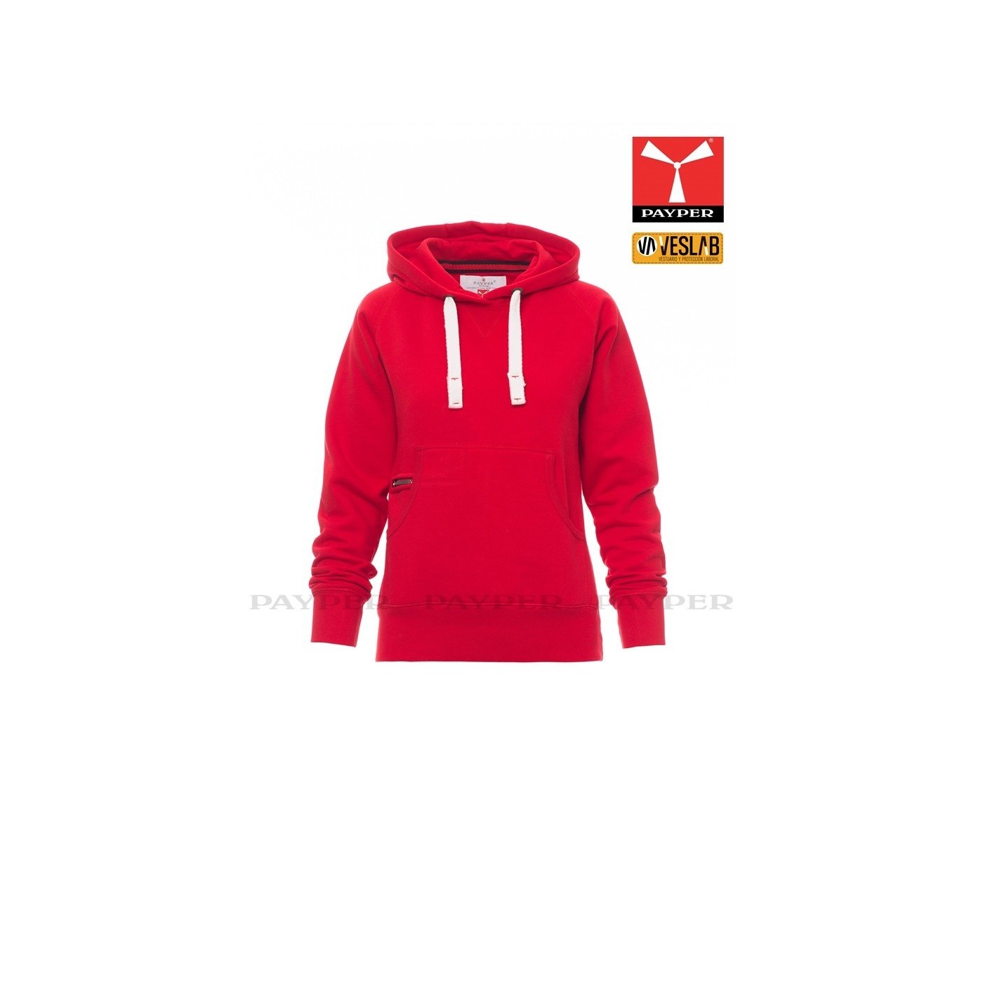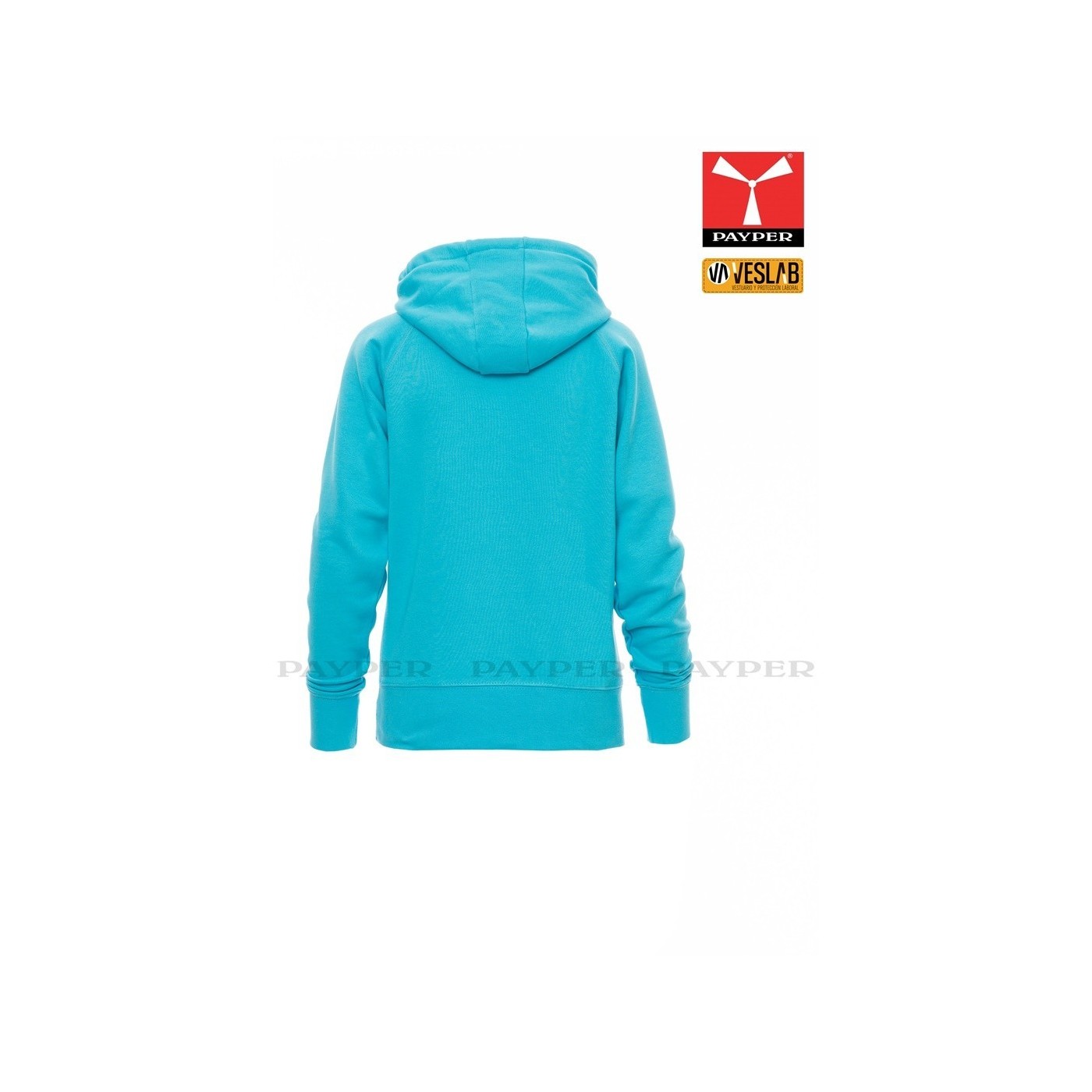 Se trata de una moderna sudadera entallada para mujer con capucha con doble costura y un ancho cordón blanco con puntadas y aros metálicos de contraste. Muy recomendable para quien quiera dar una imagen corporativa moderna y deportiva.