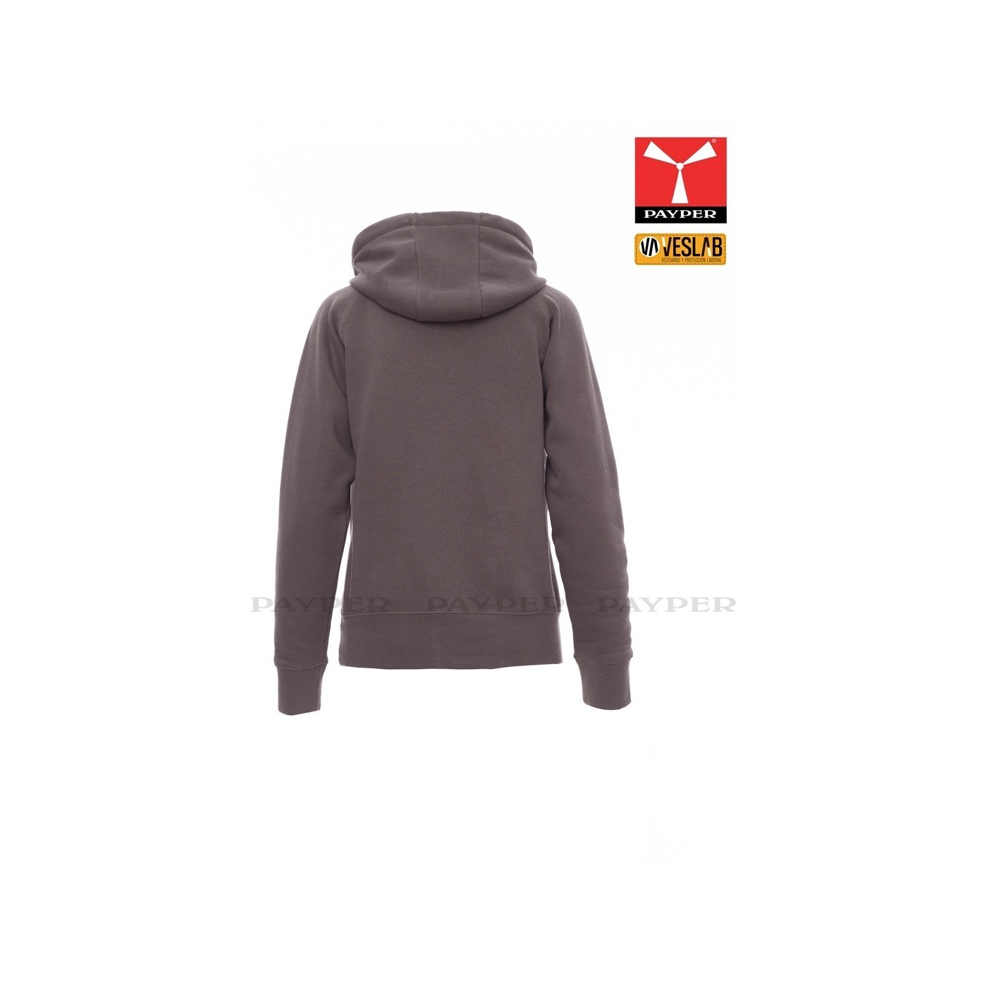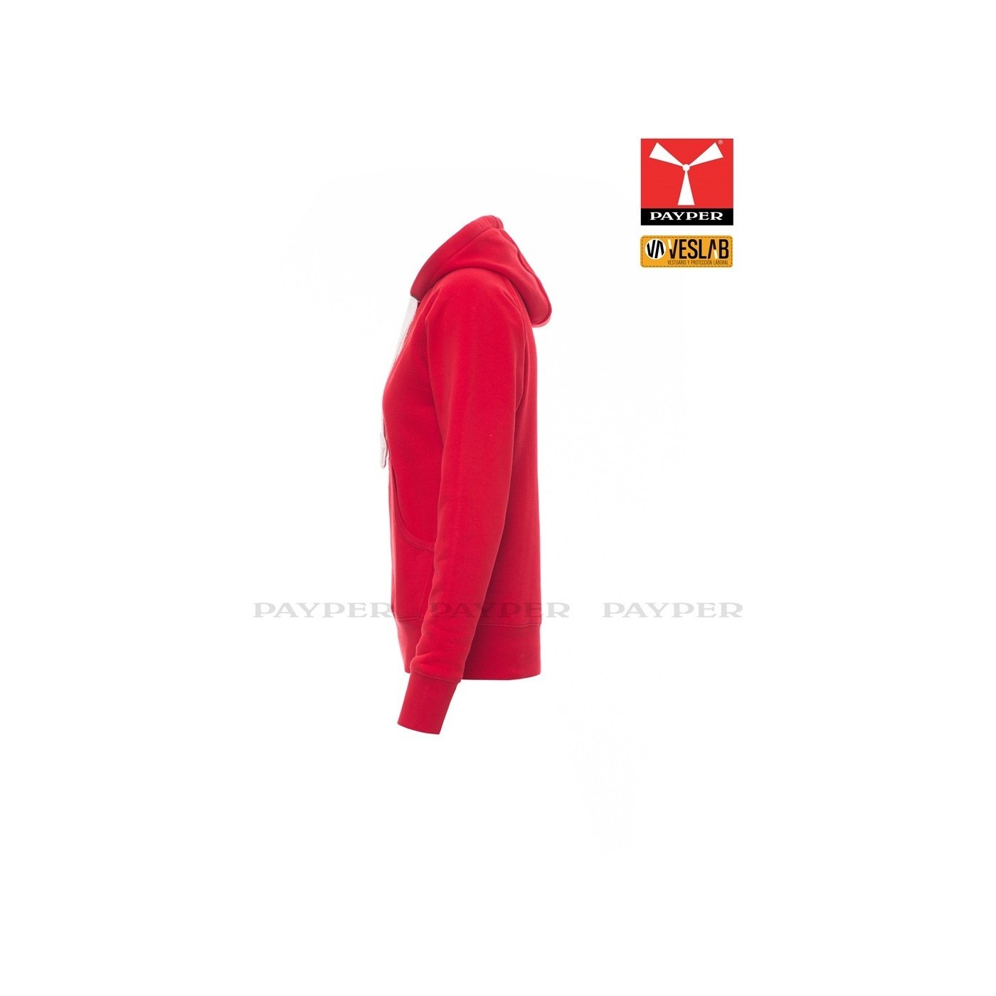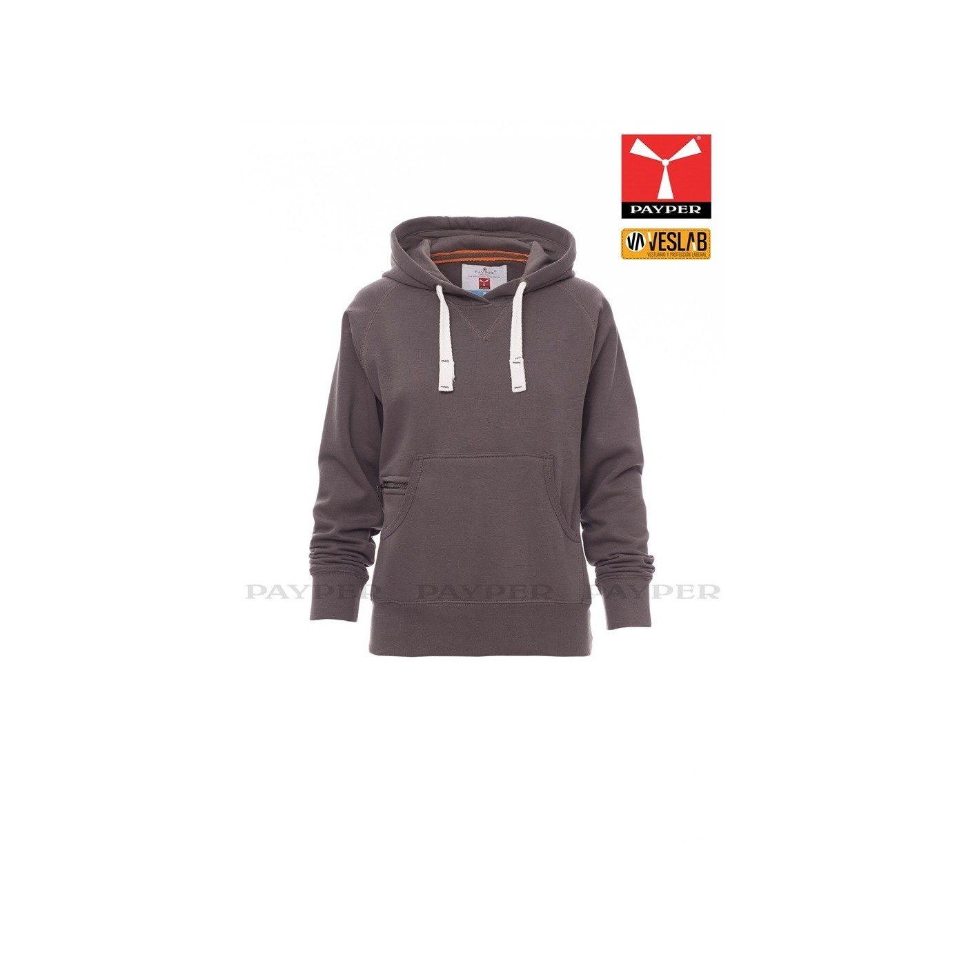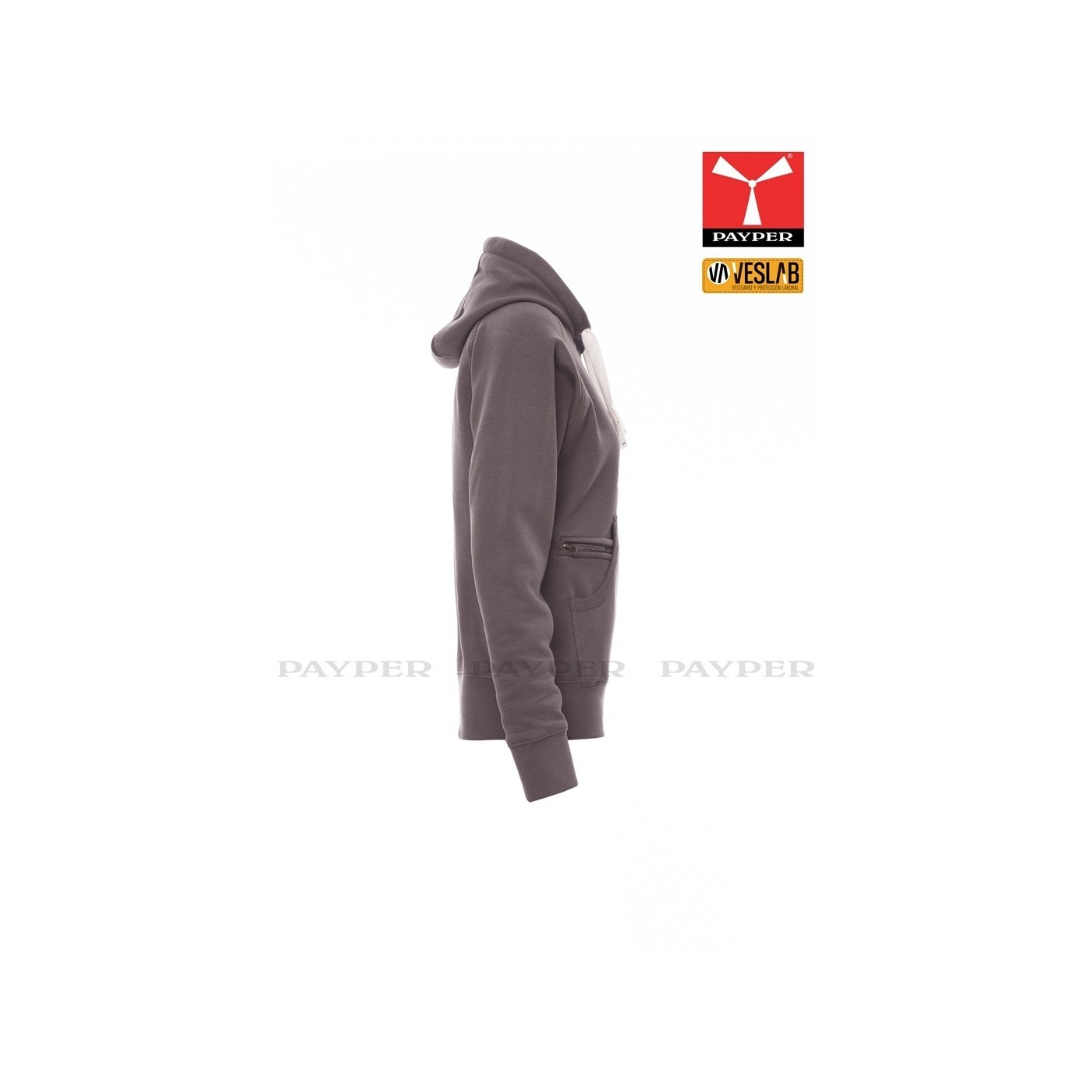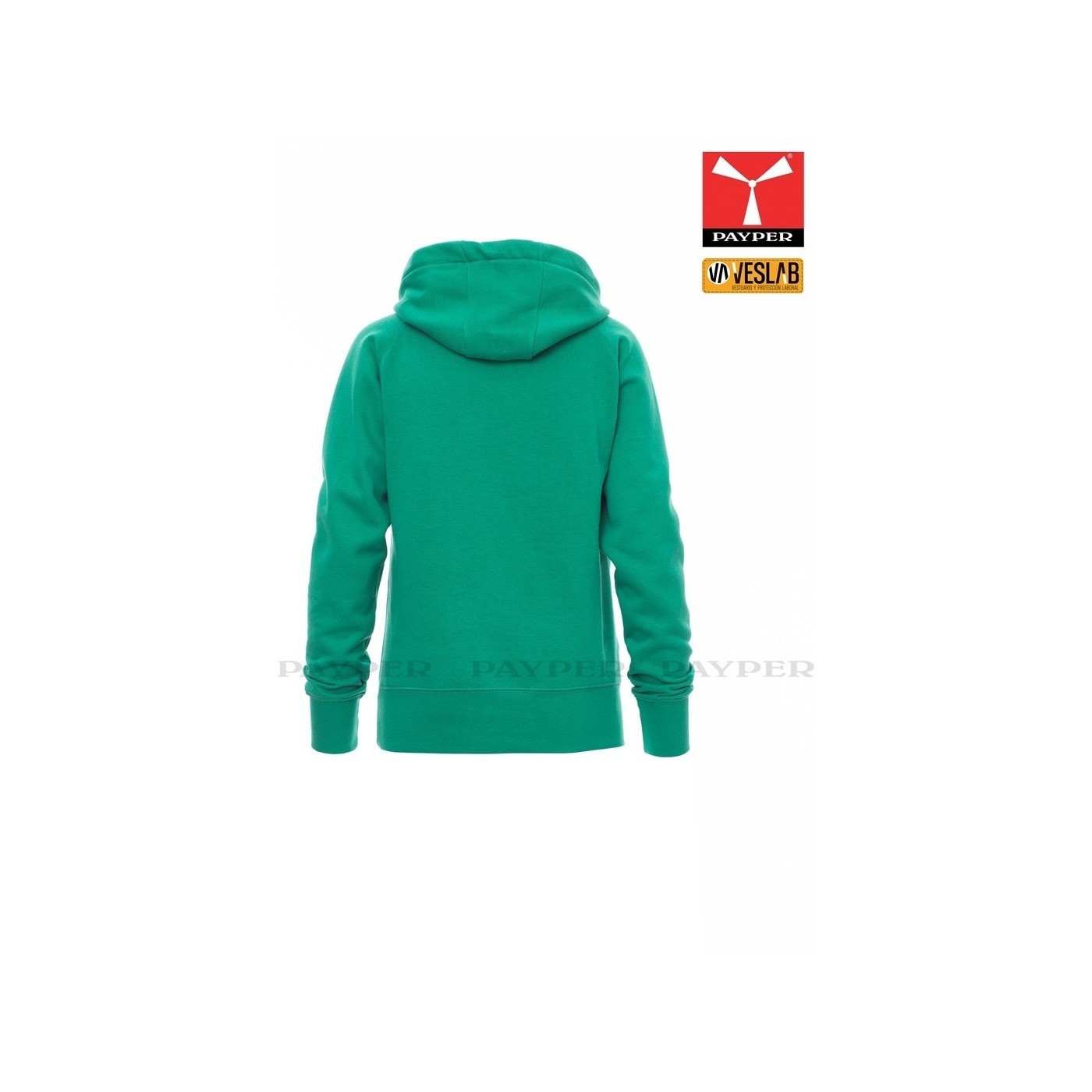 Se trata de una moderna sudadera entallada para mujer con capucha con doble costura y un ancho cordón blanco con puntadas y aros metálicos de contraste. Muy recomendable para quien quiera dar una imagen corporativa moderna y deportiva.