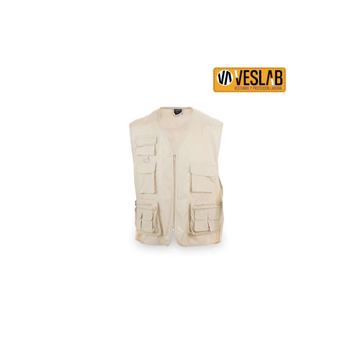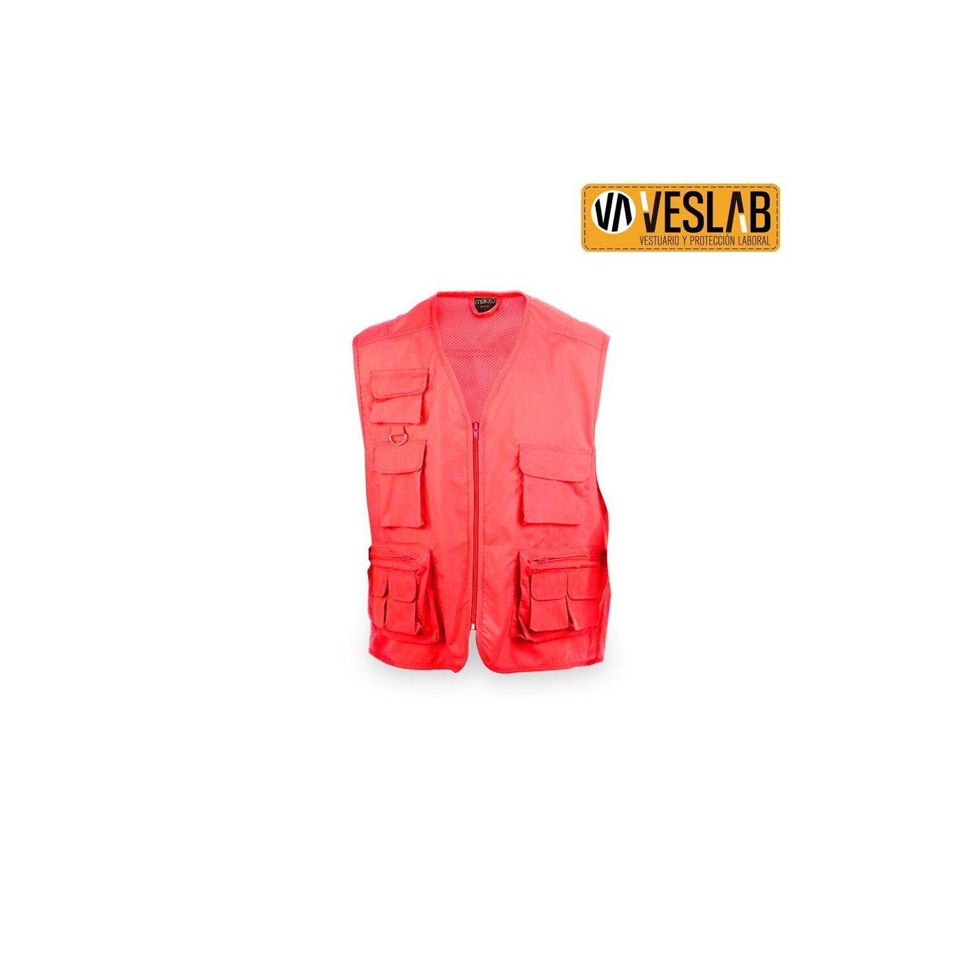 Chaleco de trabajo multibolsillos en una resistente combinación de materiales algodón y poliéster de vivos colores.
