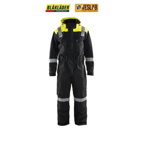 Traje largo con capucha y detalles reflectantes en los hombros, mangas y piernas. Dispone de un forro acolchado, de material impermeable y cortavientos, transpirable, con costuras selladas y ventilación debajo de las mangas. Contiene bolsillo posterior con fuelle y solapa, en la pierna, en el pecho con cremallera resistente al agua y forro polar. Bolsillos frontales y internos.