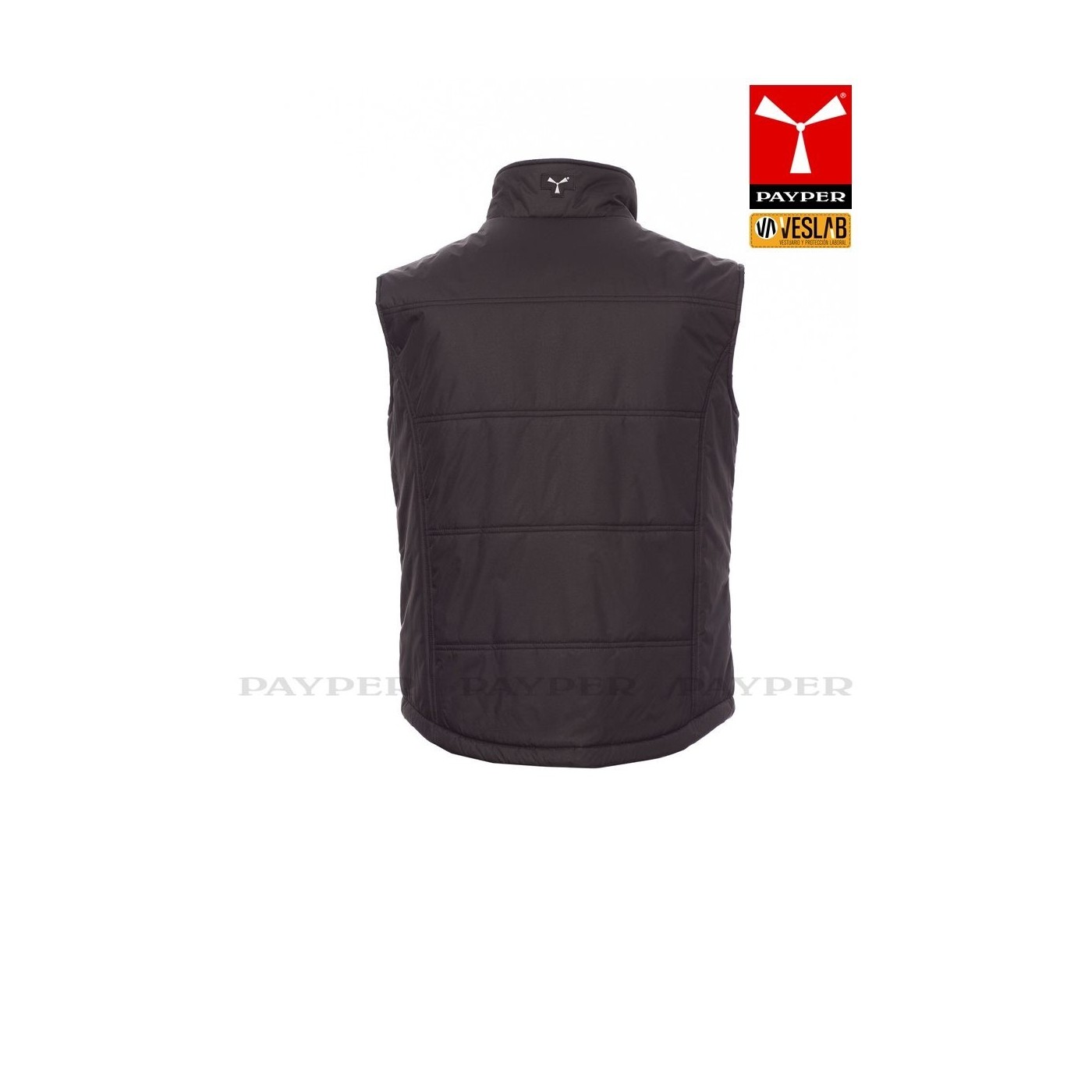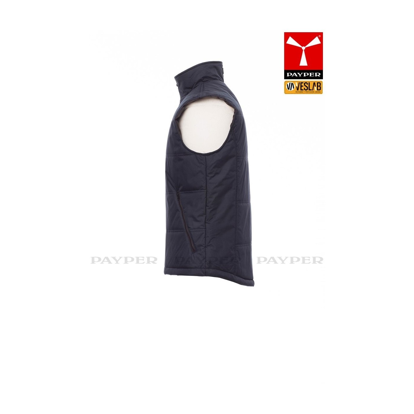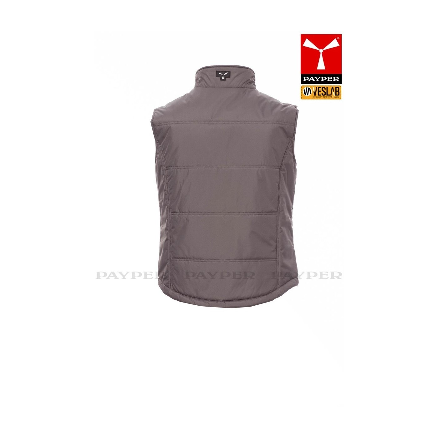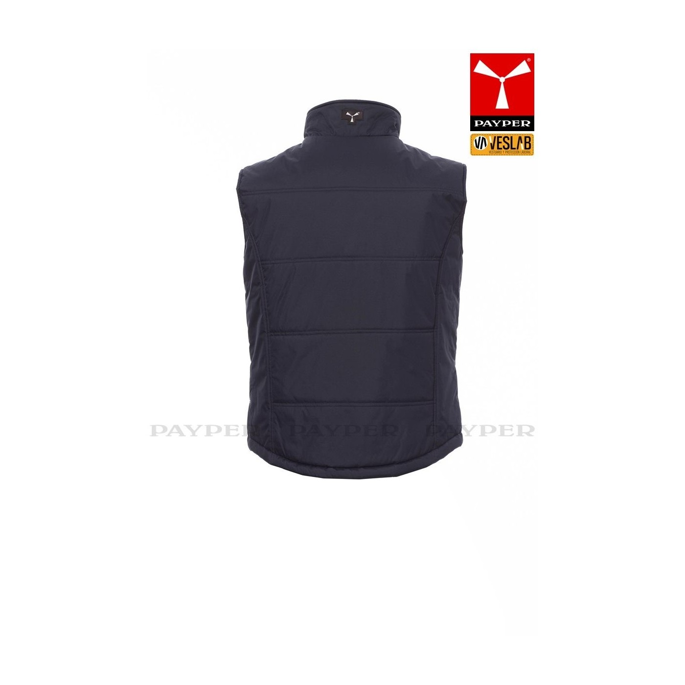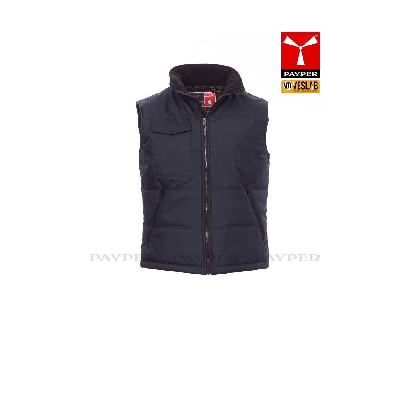 Chaleco de trabajo con relleno acolchado y espalda contorneada. Presenta un acabado con forro de alta densidad y forro polar en la parte interior del cuello. Dos bolsillos amplios con cremallera, bolsillo porta móvil a la altura del pecho y bolsillo interior.