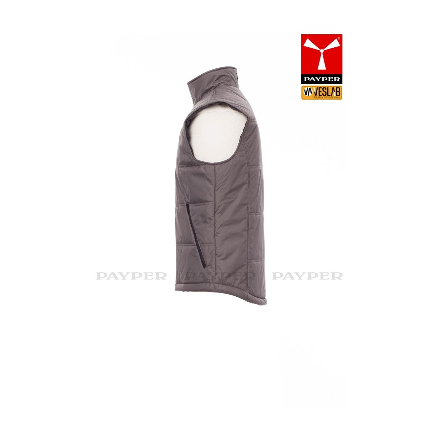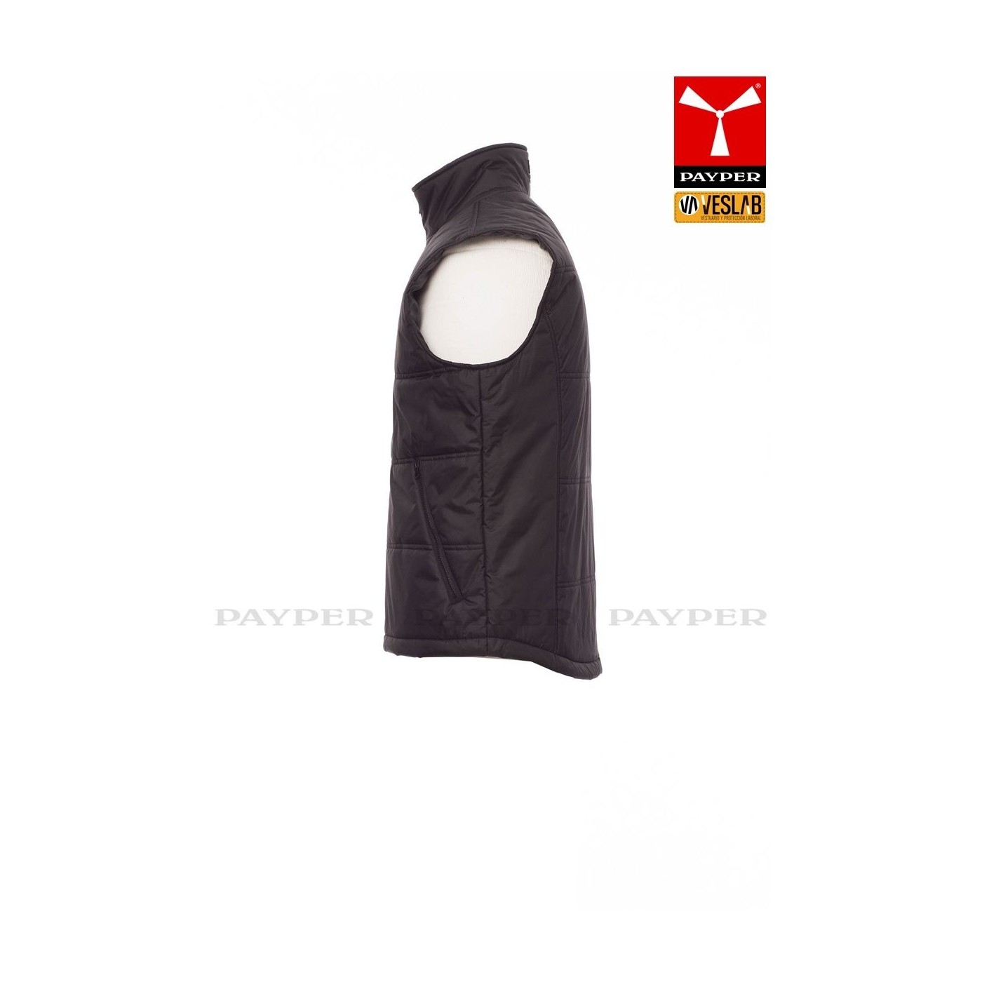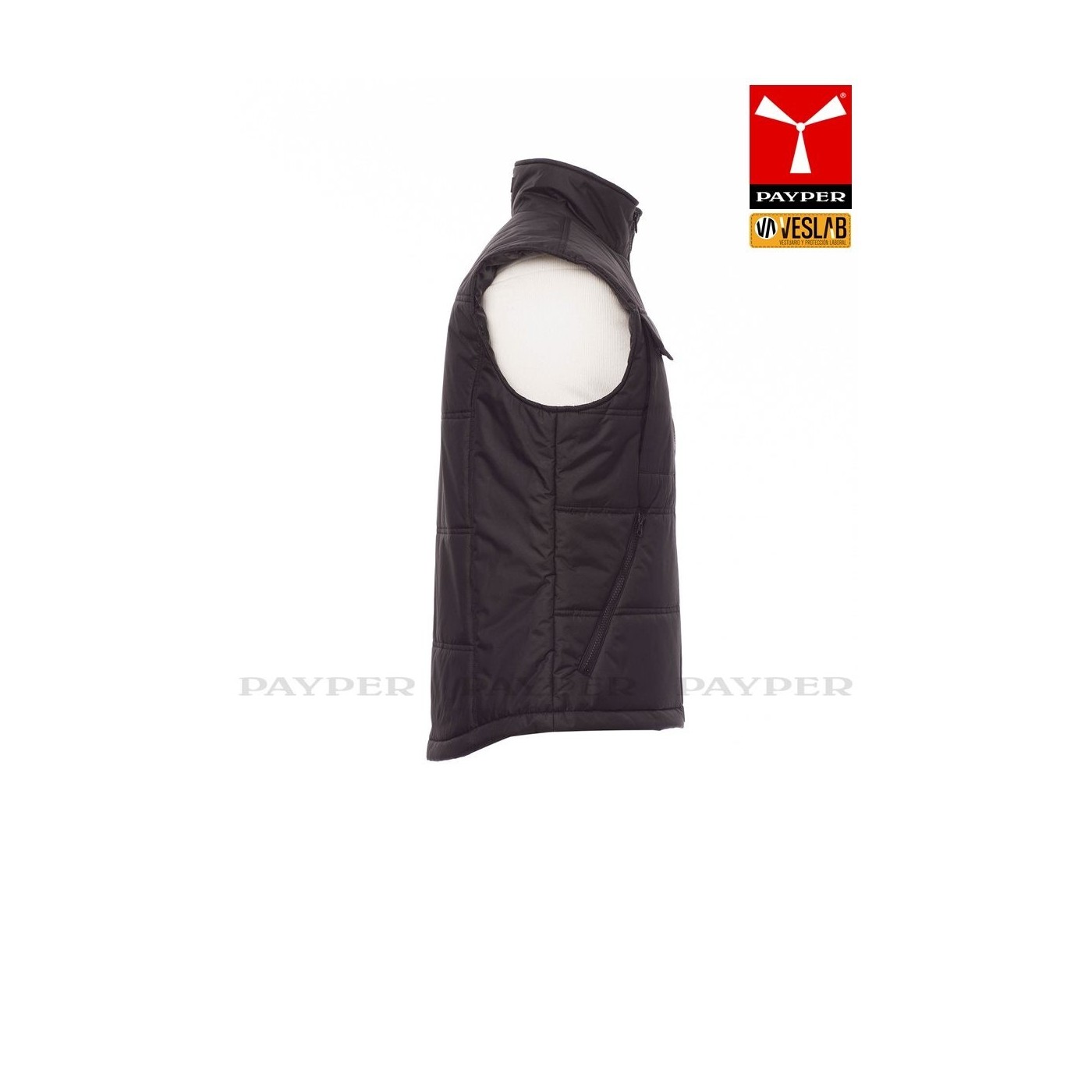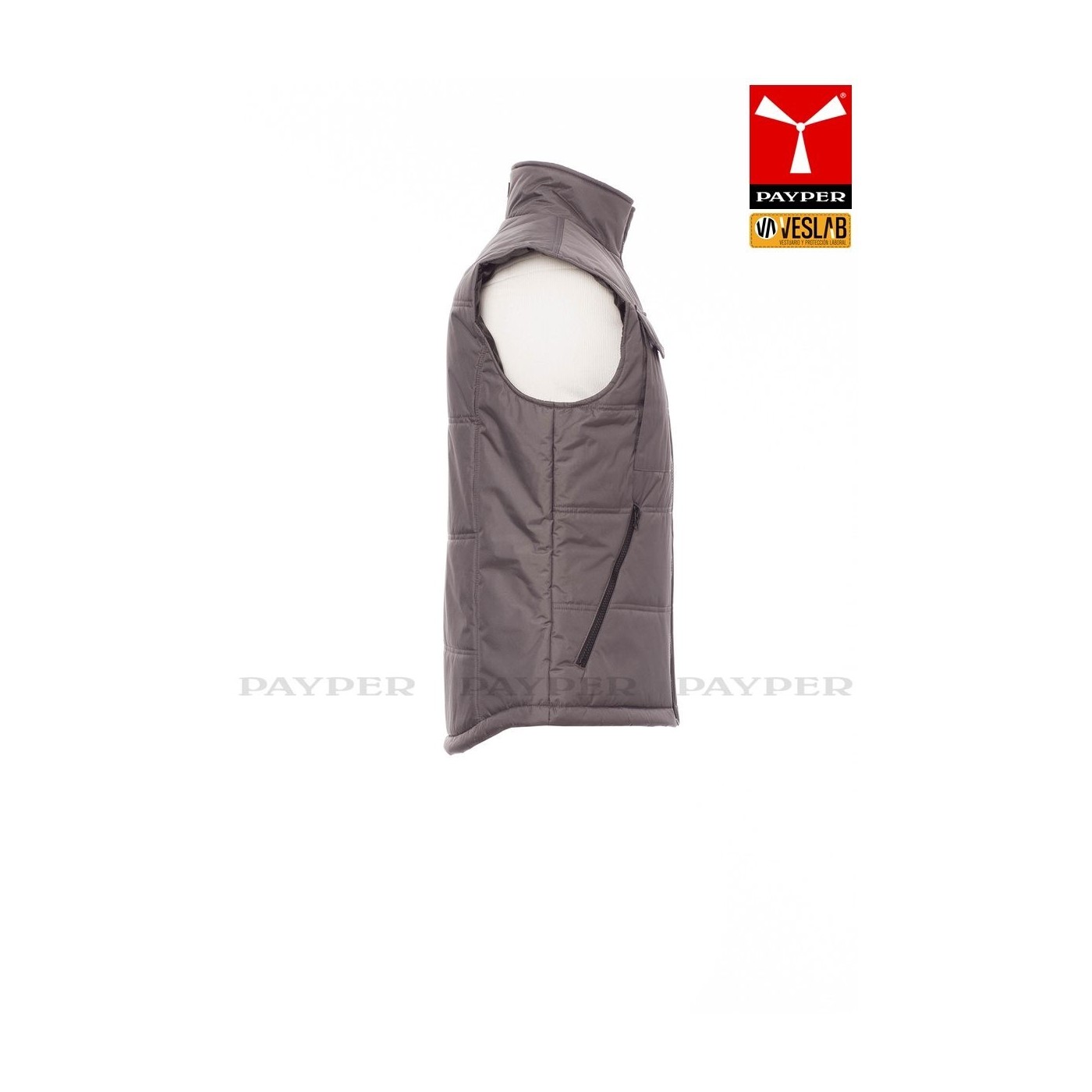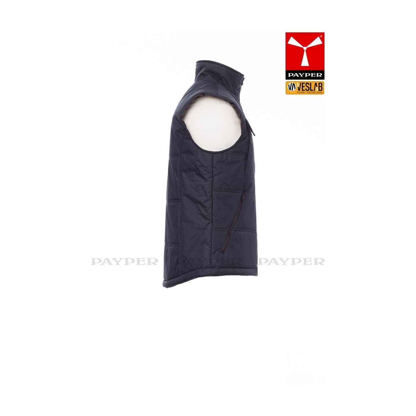 Chaleco de trabajo con relleno acolchado y espalda contorneada. Presenta un acabado con forro de alta densidad y forro polar en la parte interior del cuello. Dos bolsillos amplios con cremallera, bolsillo porta móvil a la altura del pecho y bolsillo interior.
