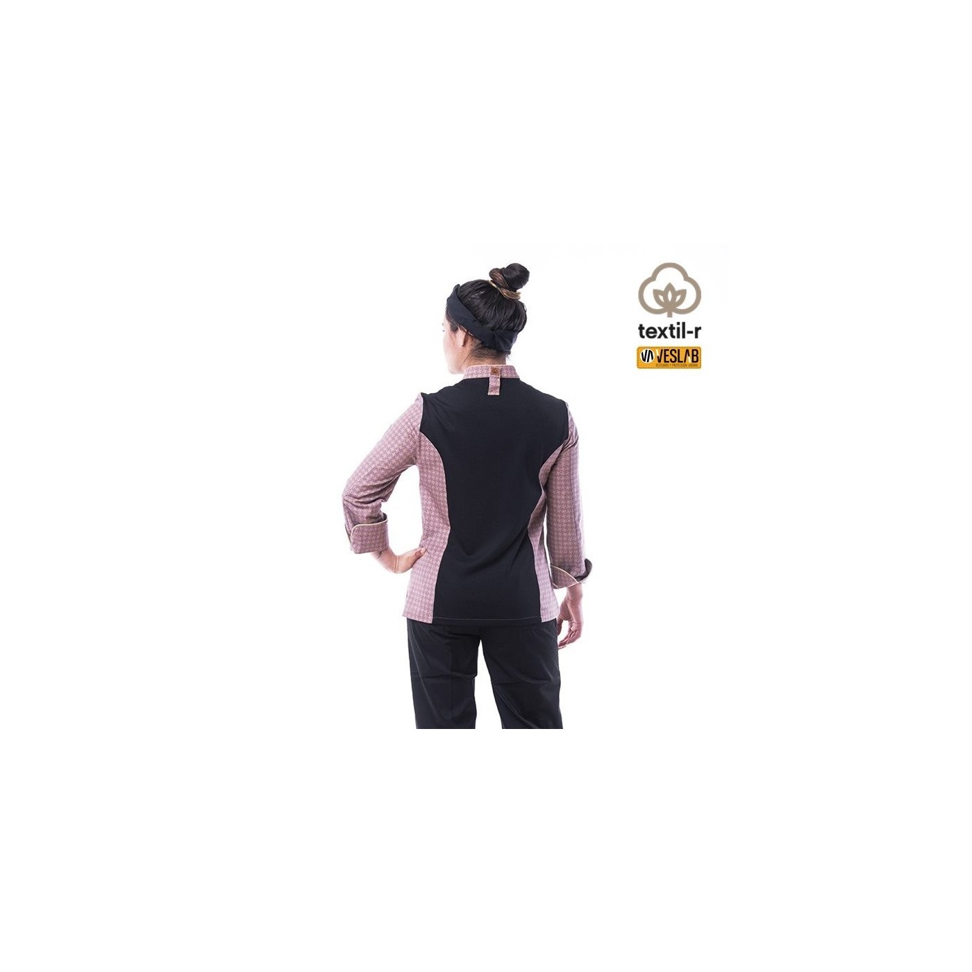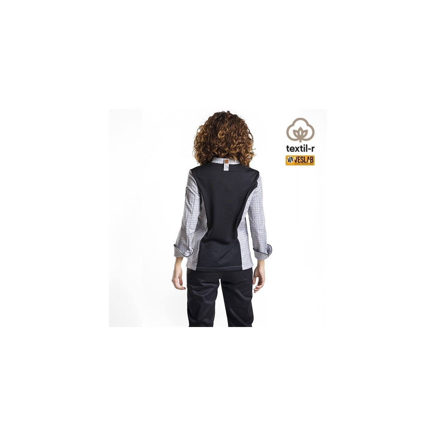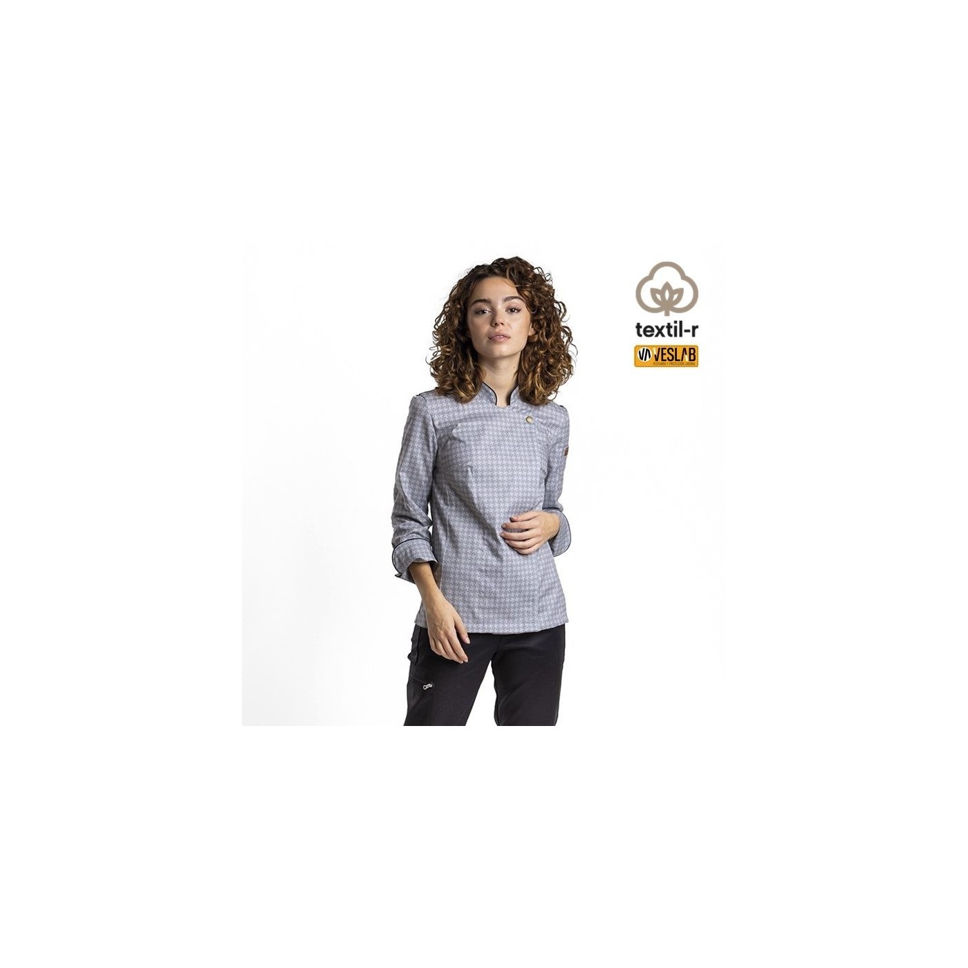 Chaqueta entallada para cocinera en tejido técnico transpirable y estampado de molinillos
