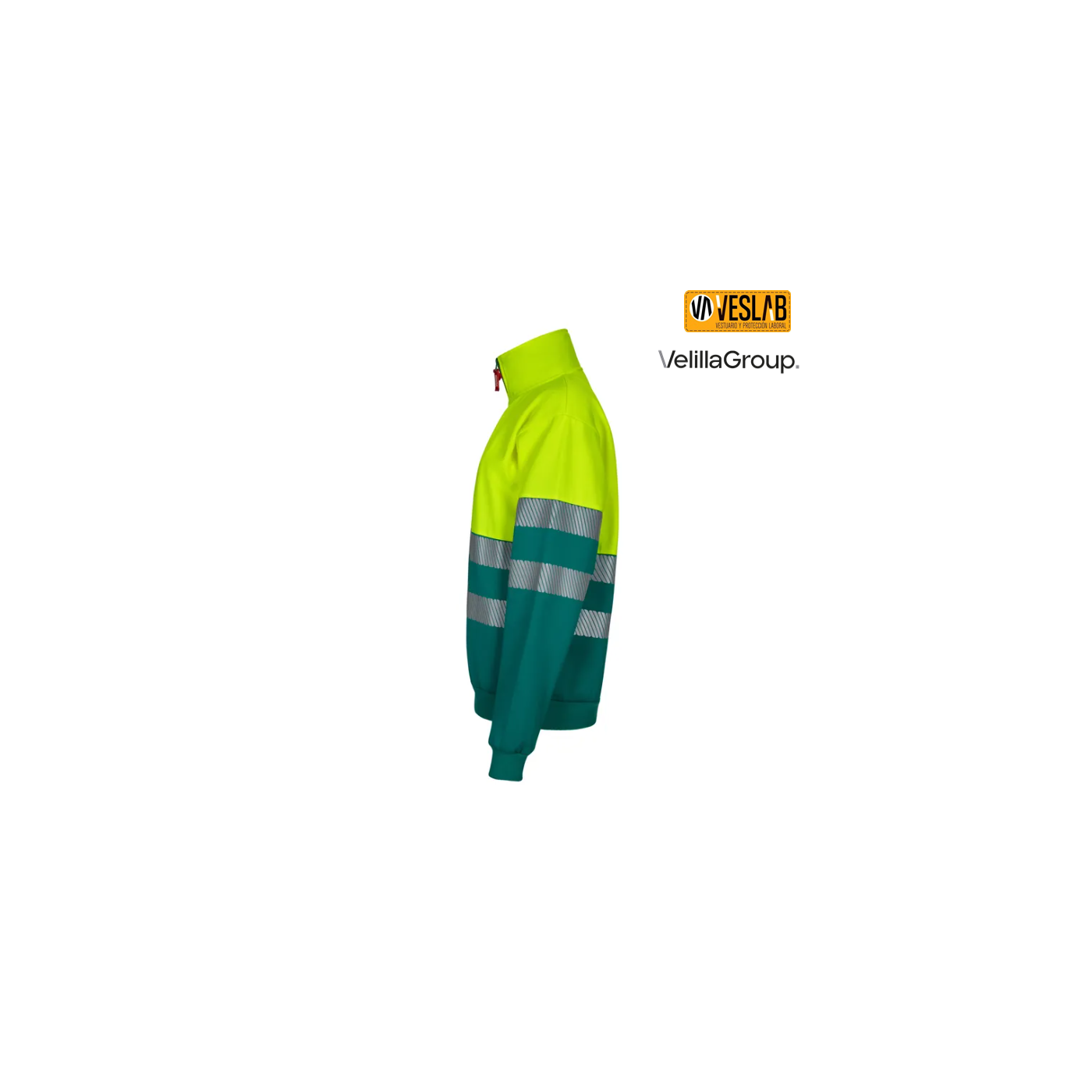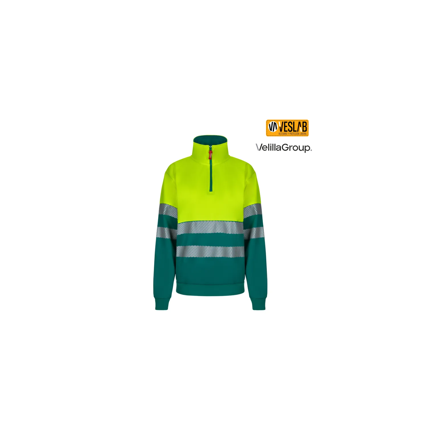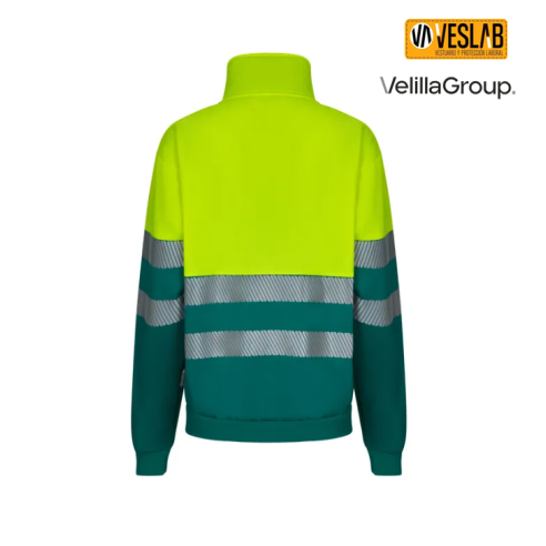 Sudadera de alta visibilidad bicolor con cintas reflectantes, segmentadas termo-fijadas reflatex, en torso y mangas. Le otorgan un mejor movimiento al carecer de costuras.