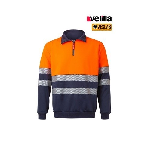 Sudadera de alta visibilidad bicolor con cintas reflectantes, segmentadas termo-fijadas reflatex, en torso y mangas. Le otorgan un mejor movimiento al carecer de costuras.