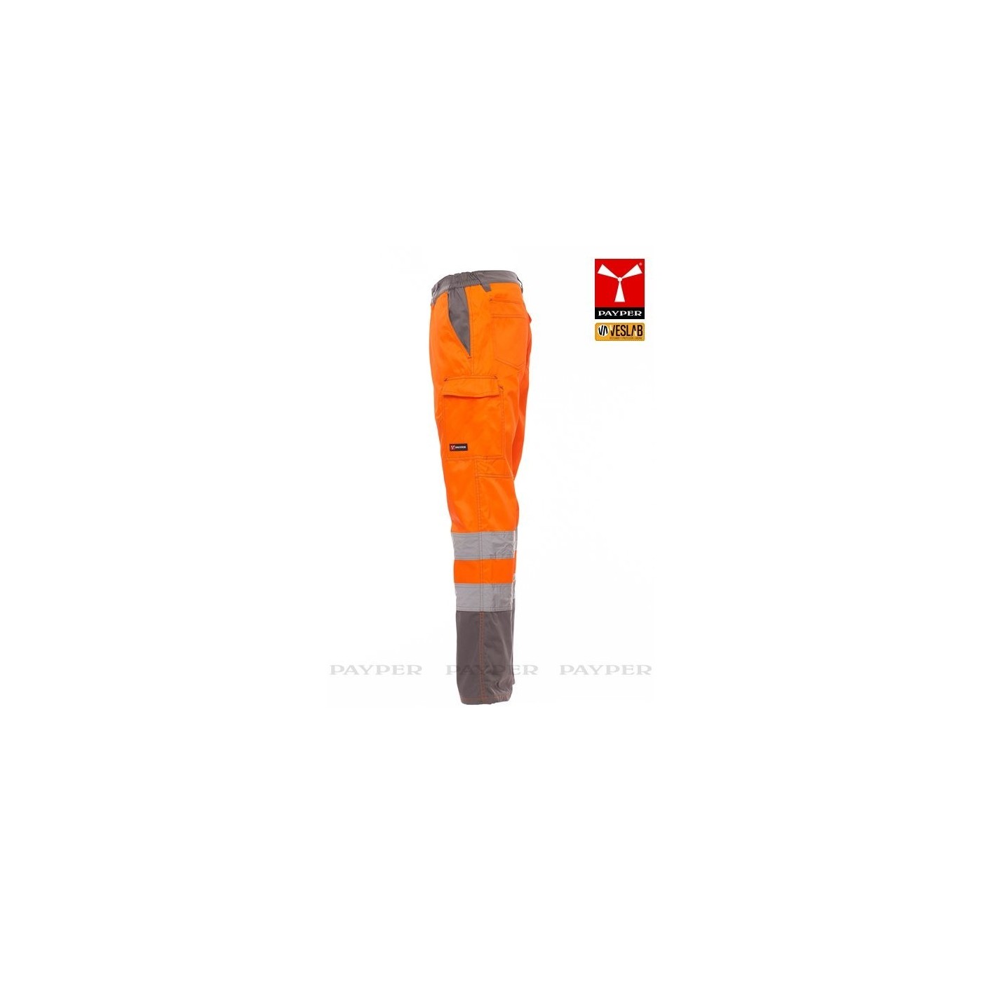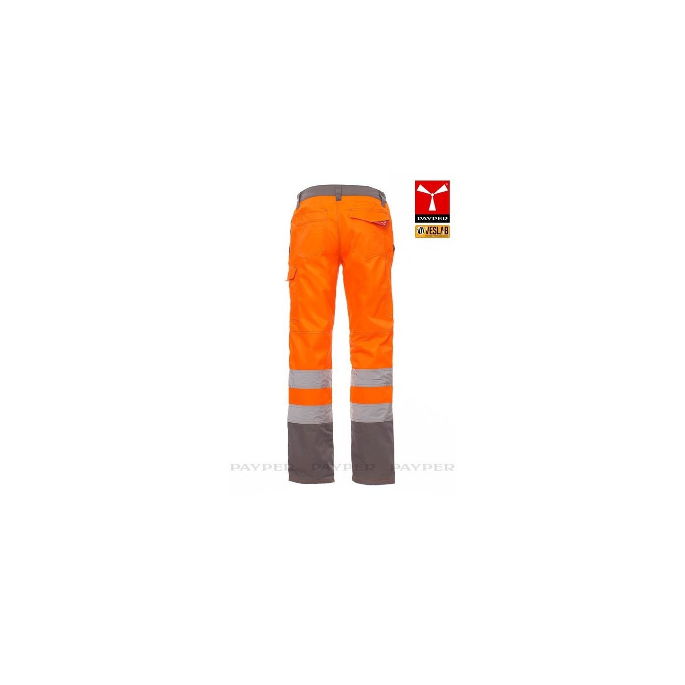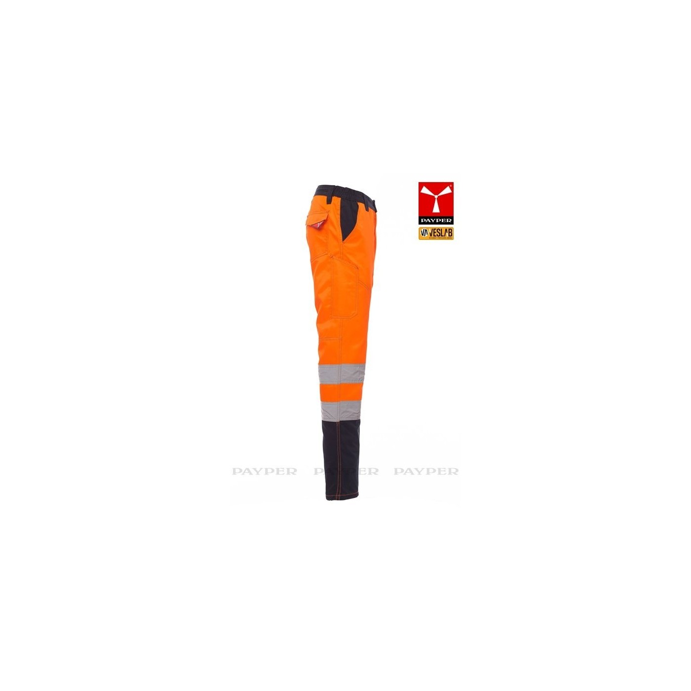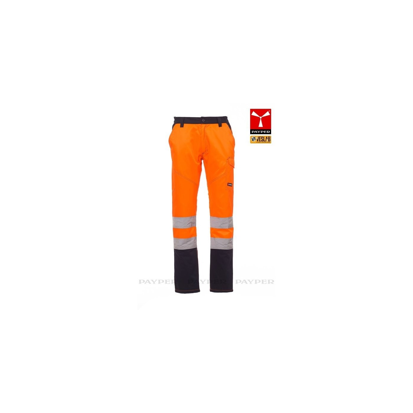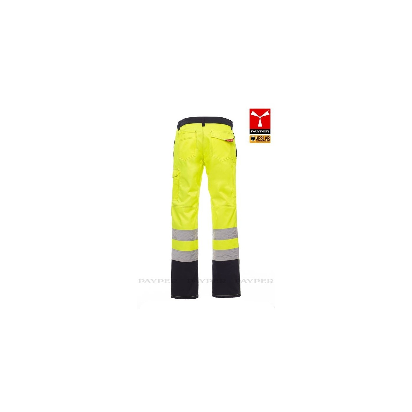 Pantalón de trabajo de alta visibilidad de invierno para hombre, forrado con franela de algodón (peso 150 g/m2), de alta visibilidad, bicolor, con bandas reflectantes, elásticos laterales y trabillas en la cintura, cierre con cremallera y botón de plástico, dos bolsillos delanteros de corte clásico, bolsillo lateral con LOCK SYSTEM, soporte para metro, dos bolsillos traseros, uno con tapeta y velcro y otro abierto. Costuras en contraste, costuras de la entrepierna e interior de la pierna con triple aguja.