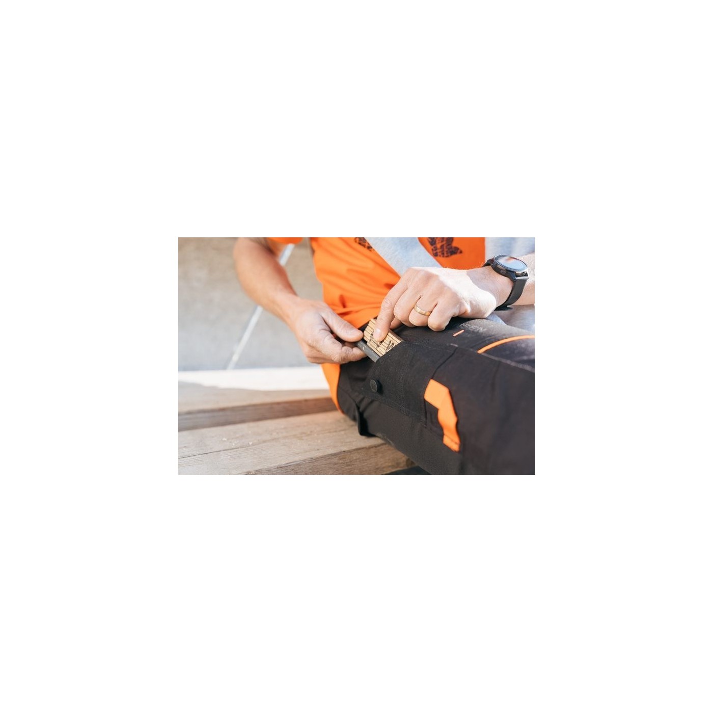 • Bolsillo en el muslo con cierre de broche y varios compartimentos