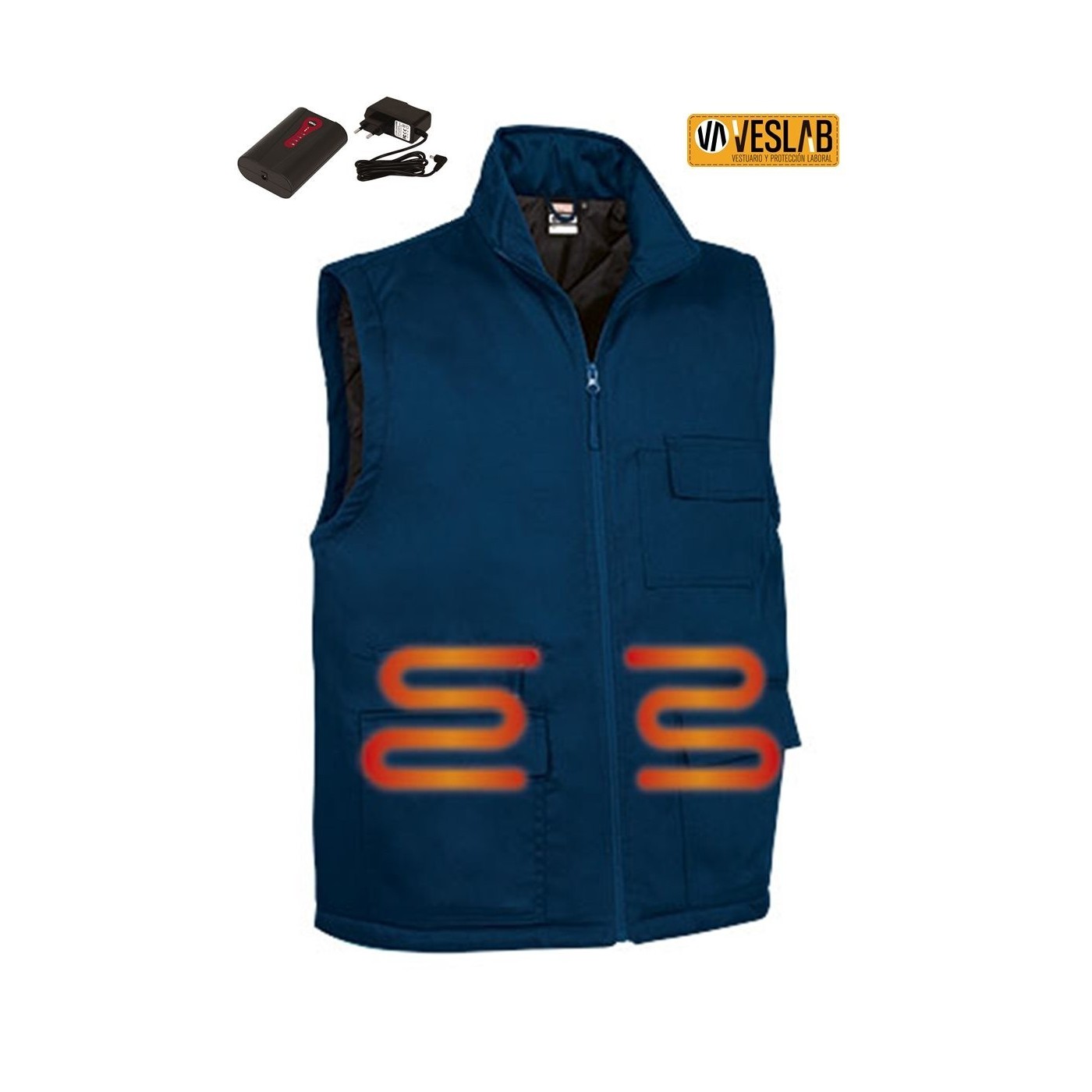 Chaleco multibolsillos calefactable, confeccionado en tejido de sarga resistente con relleno acolchado y forro interior. Cierre central con cremallera frontal y cuello alto. Bajo trasero más largo. Incluye tres bolsillos de parche y cierre de velcro, uno de ellos en el pecho izquierdo con un pequeño departamento para bolígrafo y un bolsillo delantero adicional con cremallera y conexión para alojar la batería extraíble. Incorpora batería y cargador para su sistema calefactable de aporte de calor en tres zonas: abdomen delantero derecho e izquierdo y lumbar trasero.