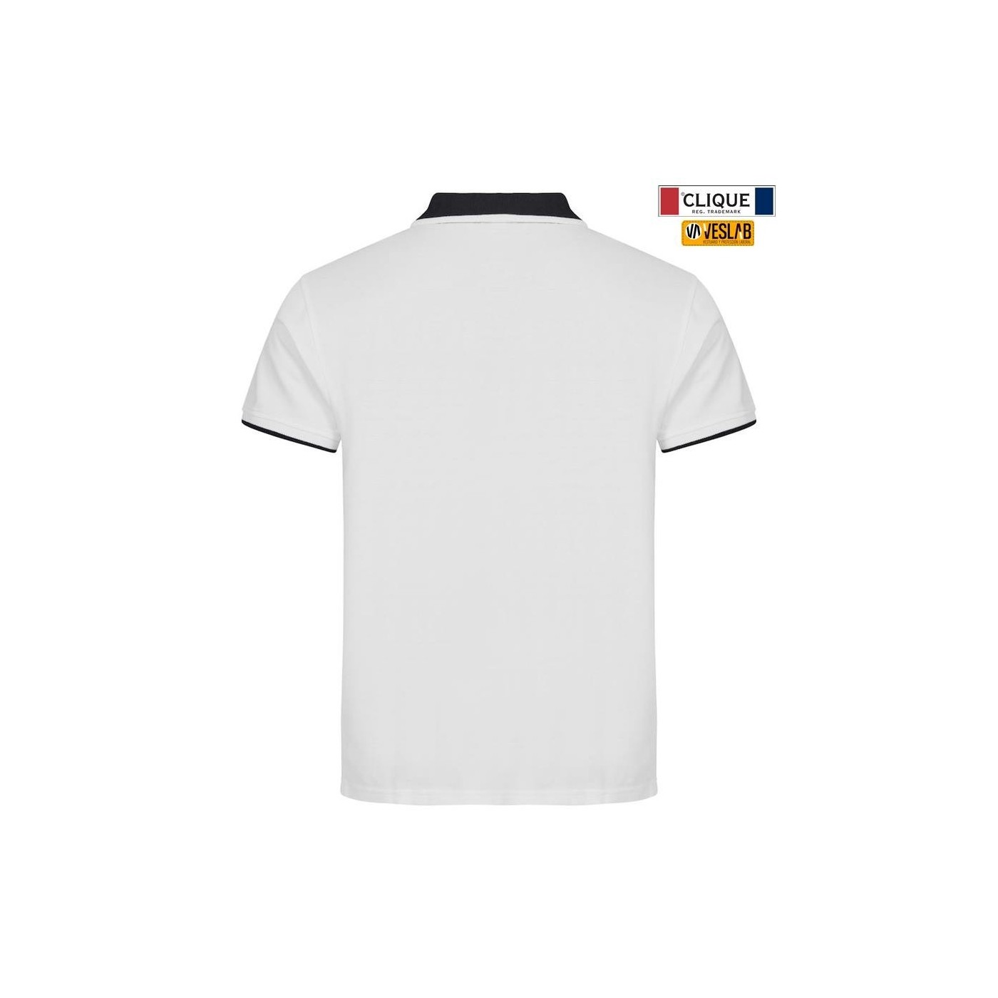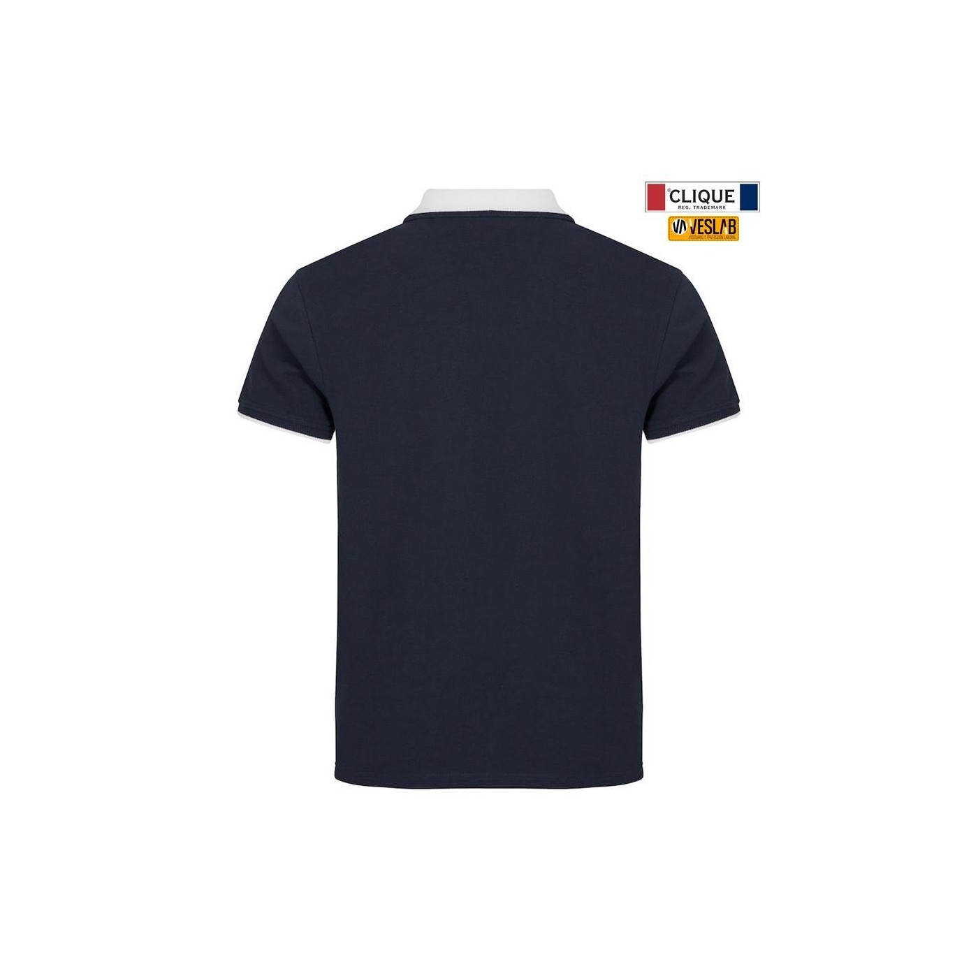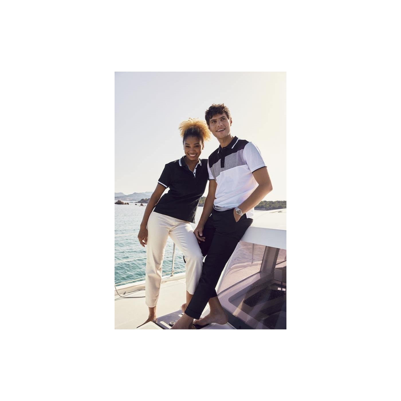 Polo unisex de contraste de líneas limpias. Raya de color de contraste en el cuello y la manga. Aberturas laterales detalladas y 3 botones tono a tono.