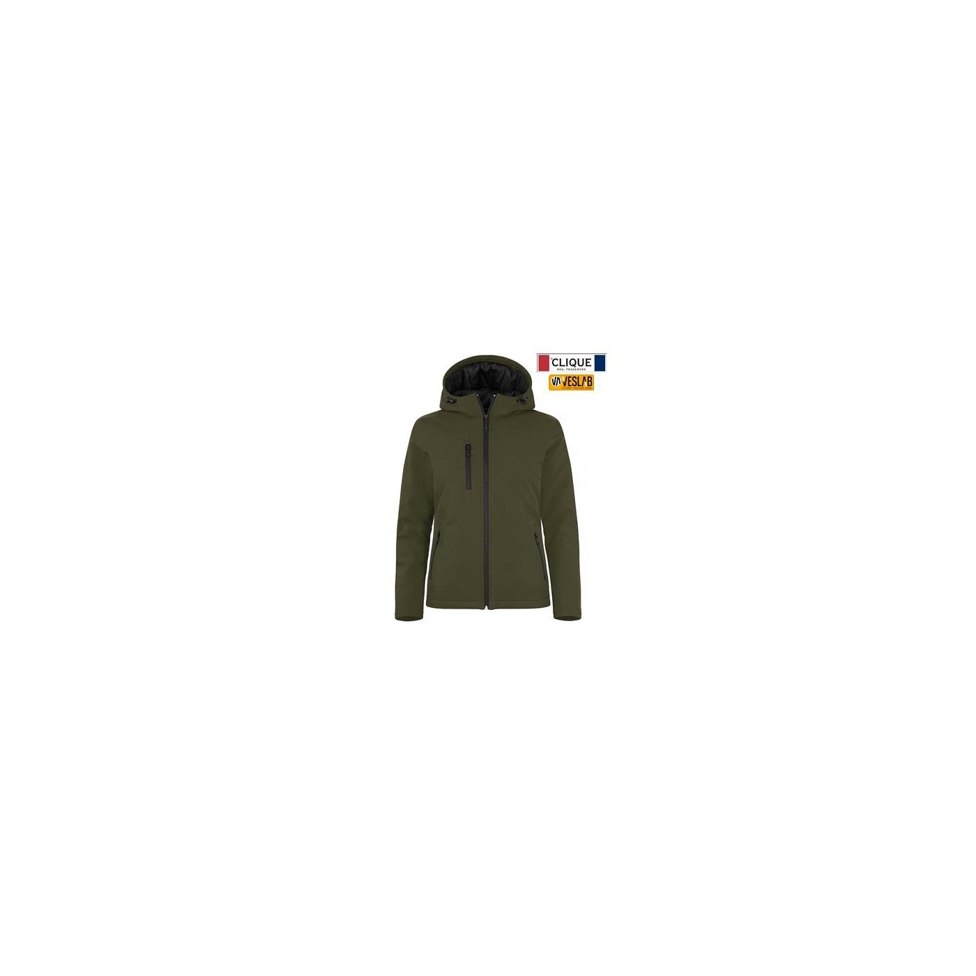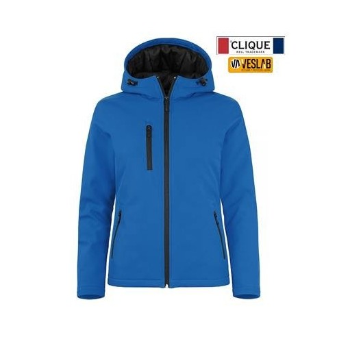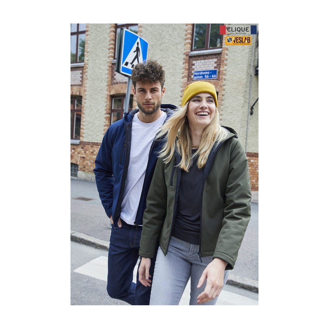 Chaqueta softshell acolchada con capucha. Tres bolsillos exteriores con cremalleras invertidas SBS y un bolsillo interior. Incluye forro negro y cremallera bordada.